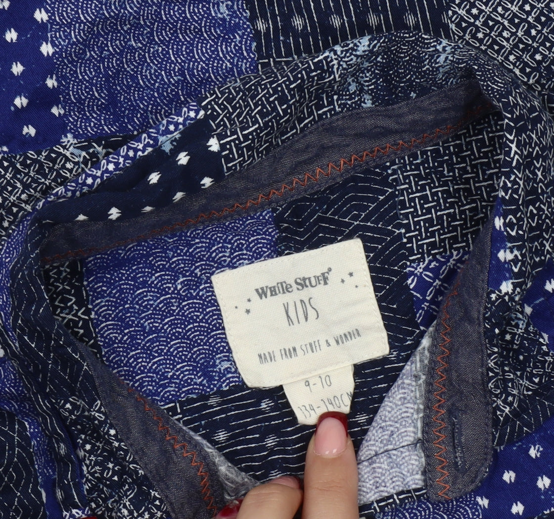Refresh your young one’s wardrobe with this stylish White Stuff boys' short sleeve button-up shirt in a vibrant blue patchwork design. Crafted from 100% breathable cotton, this shirt ensures lasting comfort, making it an excellent choice for the warmer months. The soft woven fabric gives the shirt a premium feel while being lightweight enough for all-day wear. Featuring a classic pointed collar and a regular fit, it strikes the perfect balance between casual and smart, suitable for a variety of occasions from everyday outings to special gatherings. The intricate geometric-inspired patchwork pattern presents a mix of shades and textures, adding a unique character to this piece, while the full button front closure offers easy dressing. The short sleeves make it ideal for summer, whether paired with shorts for a casual beach day or trousers for a smarter look. Designed with durability in mind, this White Stuff shirt also benefits from being easy to care for, machine washable and resistant to losing its shape after repeated wear. With its versatile styling potential, it’s a practical yet fashionable choice for boys aged 9-10 years, fitting a chest size of approximately 70 cm. Despite being pre-owned, this shirt is in excellent condition, showing minimal signs of previous wear and no noticeable defects, making it a superb value addition to any boy’s clothing collection. Give your child a standout piece that is both comfortable and full of character, perfect for elevating their wardrobe this season.