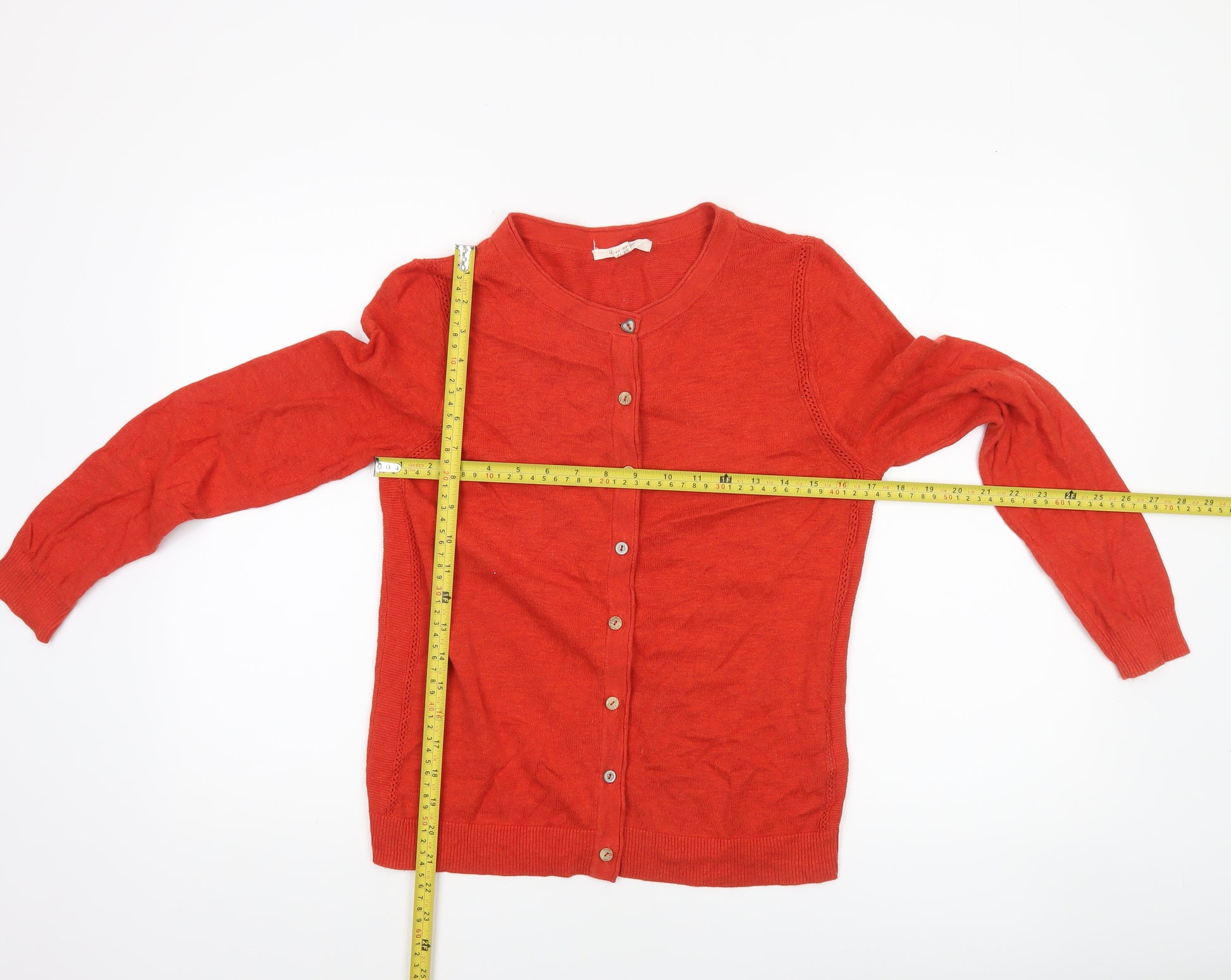 Add a pop of colour and a touch of effortless style to your everyday wardrobe with this vibrant red cardigan from White Stuff. Crafted from 100% organic cotton, this soft and breathable piece ensures comfort and a natural feel against the skin. With its classic crew neckline and button-through front, the cardigan offers a timeless silhouette perfect for layering over blouses, tees or dresses during cooler spring or autumn days. The fine tight-knit texture provides a smooth finish, while ribbed cuffs and hem help maintain a flattering shape. Designed for the modern woman who appreciates quality, this piece combines practicality and charm with lightweight wear that transitions beautifully between work, weekend and travel looks. The pure cotton composition promotes breathability, making it ideal for versatile styling throughout the seasons. The bright yet refined red tone brings an uplifting accent to any outfit, pairing easily with denim, neutral palettes, or printed skirts for a warm and inviting look. This White Stuff cardigan is in excellent condition, showing only minimal creasing from gentle previous use, reflecting its maintained quality and care. Whether styled open for a relaxed finish or buttoned up for smarter settings, this cardigan will quickly become a wardrobe staple. Perfect for casual occasions, light layering, and all-day comfort, it embodies understated British style at its best — a piece that blends timeless craftsmanship with easy everyday elegance. Ideal for women seeking a versatile knitwear option that combines softness, strength, and vibrant colour. Enhance your wardrobe with this sustainable and beautifully crafted cardigan that represents both comfort and style.