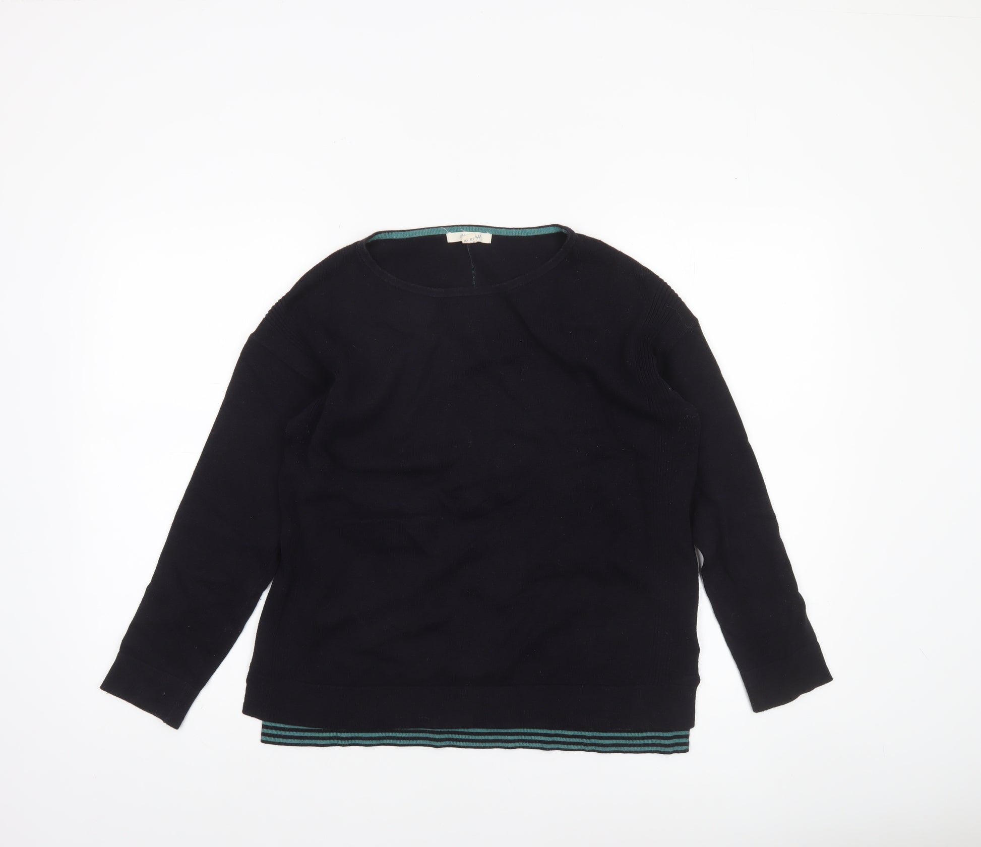 This elegant White Stuff women's jumper in black effortlessly combines versatility and comfort. Expertly knitted from a soft blend of 54% cotton, 25% modal and 21% polyester, it offers a breathable and lightweight feel perfect for cooler months or layering in transitional seasons. Designed with a classic crew neckline and regular fit, it creates a flattering silhouette suitable for everyday wear or relaxed office settings.The understated black finish is complemented by subtle knitted texture detailing, adding depth without overpowering your outfit. Its long sleeves and comfortably ribbed hemline enhance warmth and shape retention. Whether paired with jeans for a casual day out, layered over a crisp shirt for workwear chic, or styled with a scarf and boots for autumn strolls, this jumper provides endless styling possibilities.White Stuff is praised for quality and durability, and this piece is no exception, showcasing the brand’s signature craftsmanship and attention to detail. The fabric composition makes it soft to the touch, ensuring year-round comfort while maintaining its fit and appearance over time. This jumper remains in excellent condition with minimal signs of previous wear and no visible defects, making it a great addition to any wardrobe. It’s an ideal choice for casual, travel or smart-casual occasions when you need a reliable and stylish knitwear staple.A timeless wardrobe essential, this White Stuff jumper offers enduring appeal, versatile practicality and refined simplicity — the perfect piece to pull on for a touch of effortless everyday elegance.