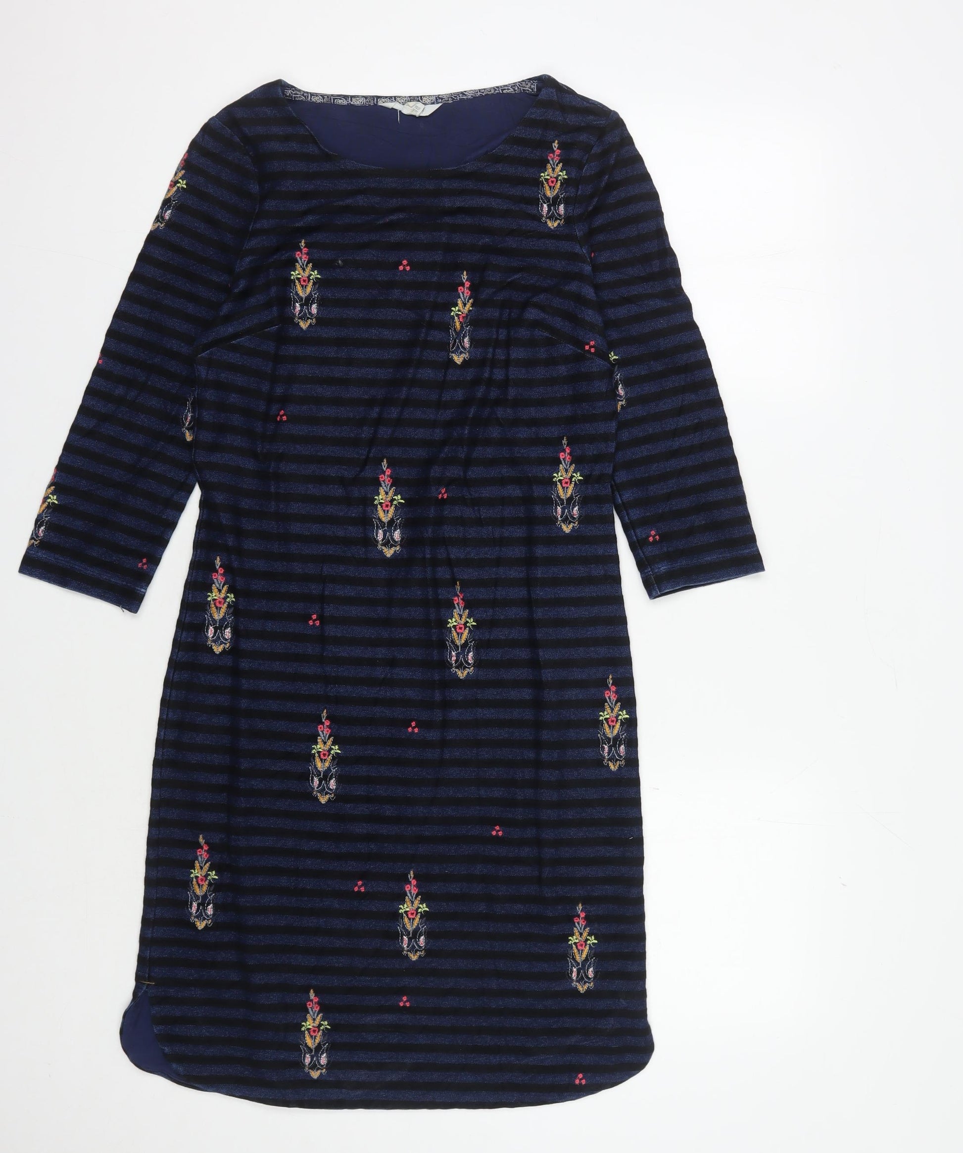 This elegant Blue Women's Dress from White Stuff offers both comfort and style, perfect for casual outings. Its striking striped pattern is complemented by delicate embroidered accents, giving it a unique and charming look. Made from a soft blend of cotton, polyester, and elastane, this knit fabric ensures the dress is both breathable and flexible. Featuring a round neckline and convenient 3/4 sleeves, it provides a modest yet fashionable fit. Easy to care for, as it's machine washable, making it a practical addition to any wardrobe. Elevate your style effortlessly with this beautifully designed piece.