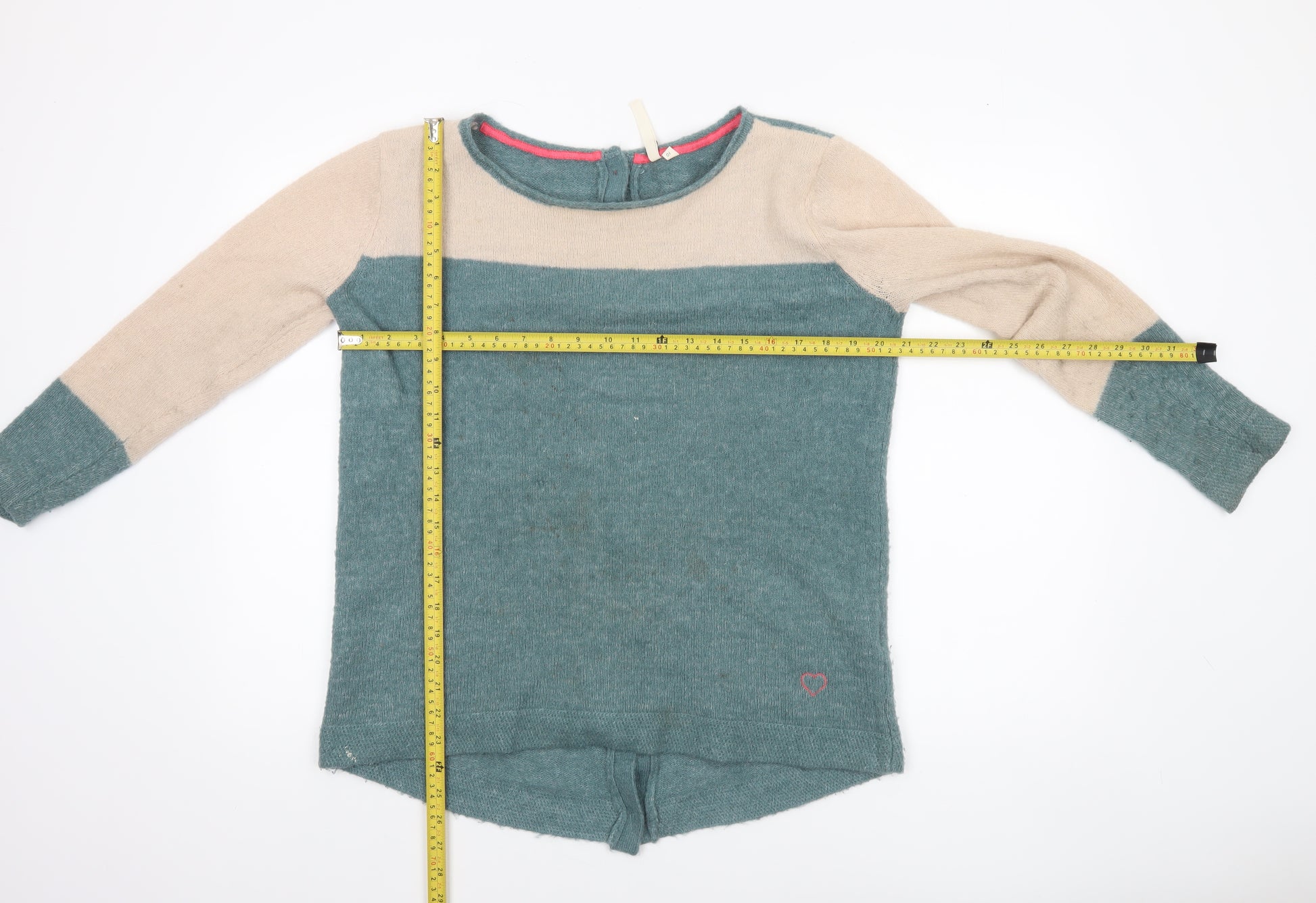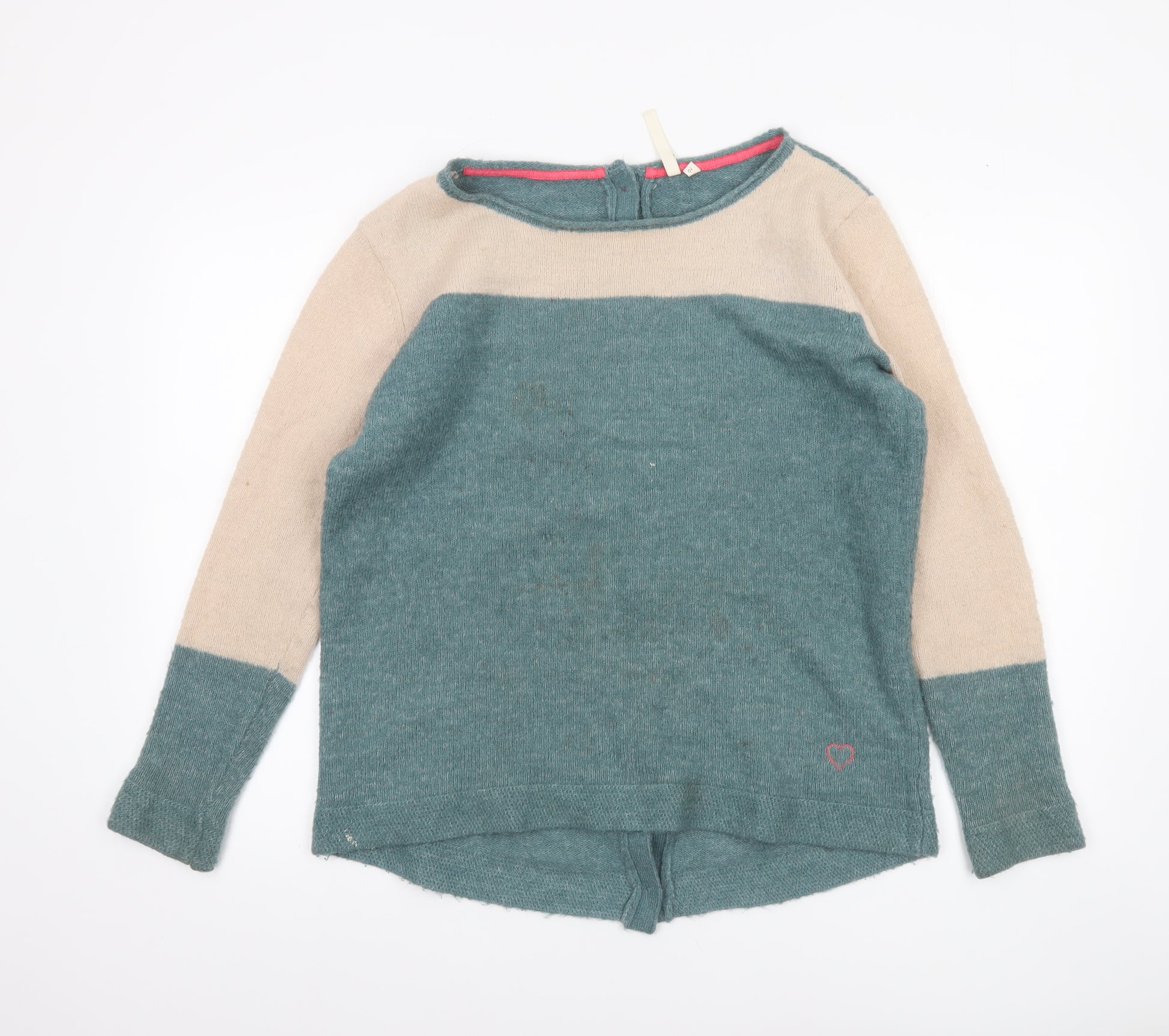 This beautiful White Stuff women’s cardigan in size 10 offers cosy comfort and effortless everyday style. Crafted from a high-quality mohair blend, the soft knit fabric combines acrylic, nylon, mohair and elastane, creating a stretchy and lightweight feel that keeps you warm without being heavy. Featuring a pretty green and beige colour block design, a flattering boat neckline and raglan long sleeves, it delivers a laid-back yet stylish finish perfect for layering. The cardigan fastens with a button-through back, adding a quirky twist that sets it apart from standard jumpers. Subtle detailing includes a wooden heart button on the inner neckline and a small stitched heart motif near the hem, reflecting the thoughtful craftsmanship associated with White Stuff apparel. Ideal for autumn and winter wear, this versatile piece pairs beautifully with jeans or skirts for easy casual styling. The cardigan remains in good pre-loved condition, showing only light signs of wear including faint marks on the front that do not detract from its overall charm. Perfect for those who appreciate comfortable knitwear with unique design touches, this White Stuff cardigan makes a stylish addition to any wardrobe. Treat yourself to quality British design at a fraction of the original price while keeping warm and chic through the cooler seasons. A wonderful choice for casual days, cosy evenings or relaxed outings. Don’t miss out on this soft, distinctive cardigan that balances comfort and personality beautifully.