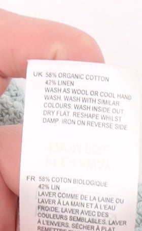 This delightful White Stuff women’s cardigan is a beautiful choice for adding easy style and comfort to your wardrobe. Crafted from a soft and breathable blend of 58% organic cotton and 42% linen, it offers the perfect balance between comfort and lightweight wear. The light teal green shade provides a calming tone suitable for all seasons, particularly ideal for spring layering or cool summer evenings. Designed with an open front, this cardigan features practical front patch pockets for everyday convenience. Its ribbed detailing at the cuffs, hem, and collar adds structure, while the relaxed fit flatters the figure without clinging. The long sleeves ensure coverage for transitional weather, making it an ideal piece for casual outings, travel, or simply relaxing in style. With its simple elegance and versatile aesthetic, you can pair this cardigan effortlessly with jeans, skirts, or dresses for a laid-back yet sophisticated look. The tight-knit finish enhances its durability, ensuring it remains a timeless wardrobe staple. Lightweight and breathable, this piece combines natural fibres to create a soft and airy texture that keeps you comfortable throughout the day. Machine washing is not recommended; care should be taken to hand wash gently and reshape while damp to maintain its quality. In excellent pre-loved condition with no visible flaws or marks, this cardigan retains its charm and quality craftsmanship. Whether layered over a crisp shirt for work or a simple vest top for weekends, this White Stuff knit brings understated style to any outfit. Sustainable in fibre composition and timeless in design, it embodies effortless elegance and practicality, reflecting the brand’s focus on quality, comfort, and contemporary British casual wear. Treat yourself or a loved one to a style that is both eco-conscious and fashion-forward with this versatile essential.
