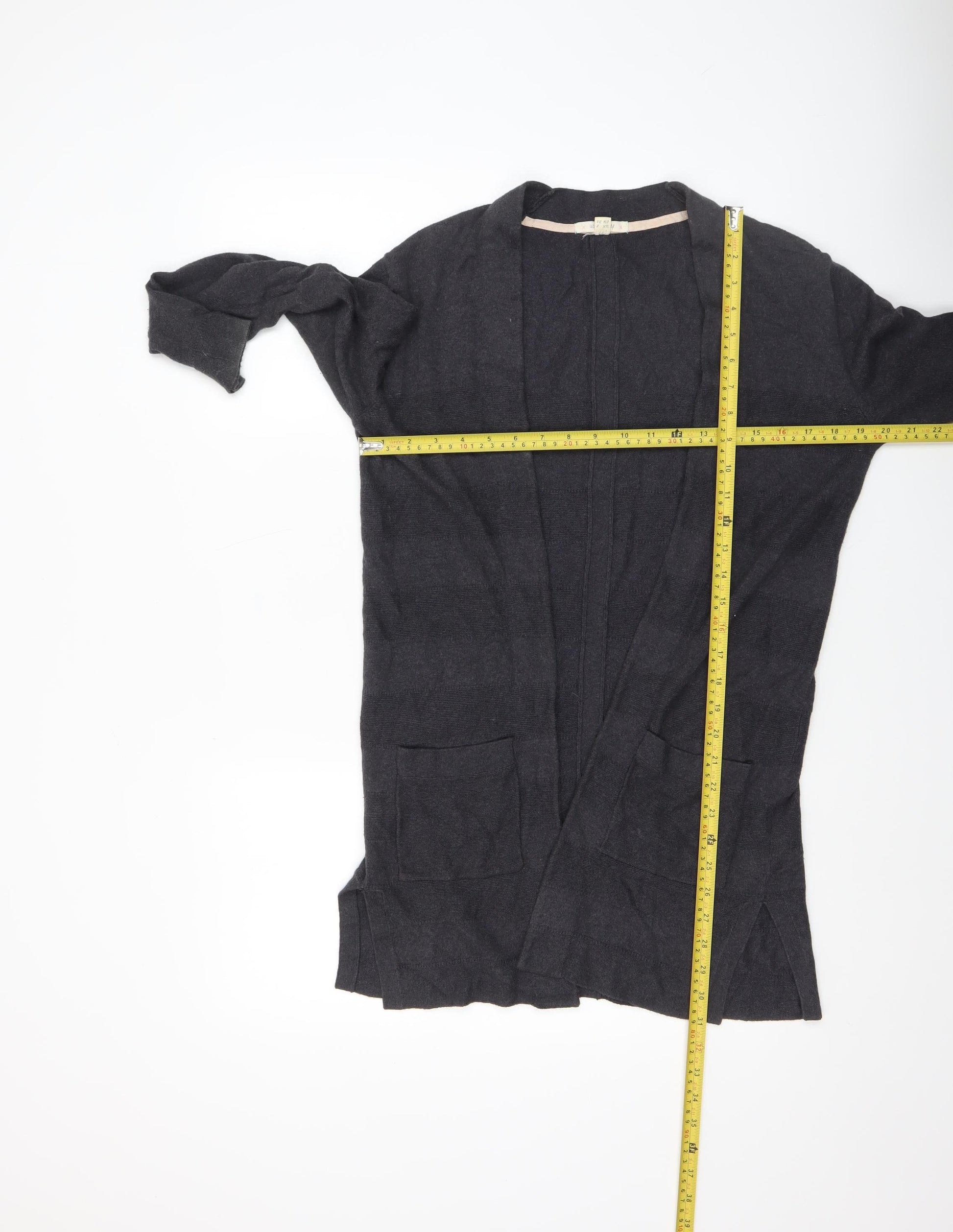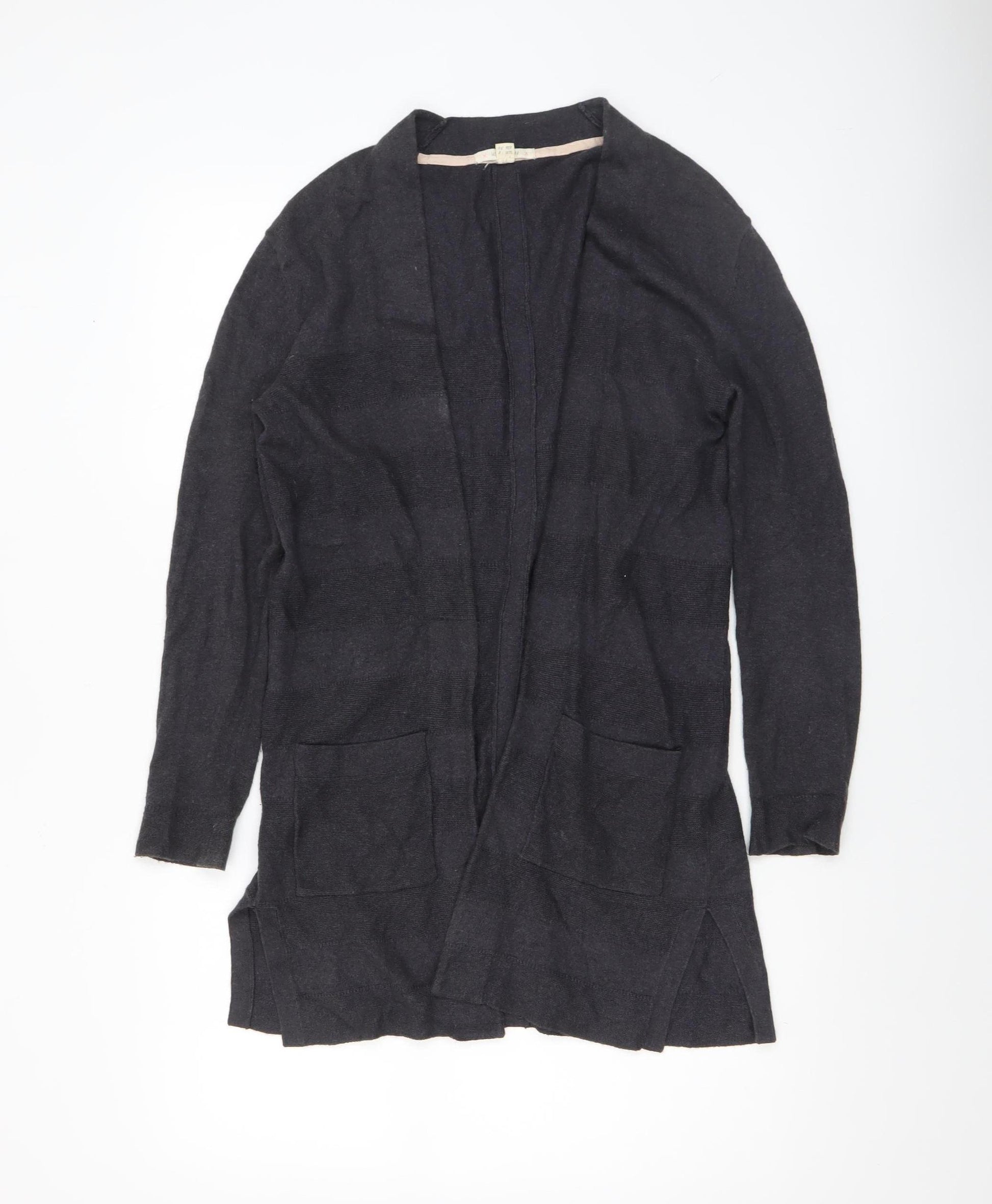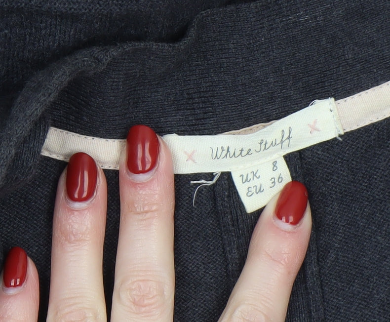 Elegant simplicity meets cosy comfort in this classic black open-front cardigan from White Stuff. Designed for women who appreciate versatility and style, this long sleeve piece in size 8 effortlessly complements a range of outfits. Crafted from a beautifully soft blend of 95% cotton and 5% cashmere, it offers a breathable yet warming feel suitable for layering throughout the cooler seasons. The lightweight knit construction ensures comfort without bulk, making it ideal for autumn, winter and even the transitional chill of spring. Featuring a relaxed, draped silhouette with an open neckline and two generously sized front pockets, this cardigan adds both practicality and understated sophistication to everyday looks. Its minimalist design and no-pattern finish make it easy to pair with jeans, dresses, or tailored trousers for a refined casual aesthetic. The tight-knit fabric gives structure while allowing natural stretch, and its hand wash care ensures lasting softness and shape. Perfect for a cosy work-from-home outfit, a relaxed weekend ensemble, or an easy layer over your office attire, this cardigan transitions effortlessly between occasions. Its classic black colour provides a timeless foundation for your wardrobe, while the subtle cotton-cashmere blend delivers premium comfort. In excellent pre-loved condition, this piece shows only minimal signs of wear, offering great value and enduring quality. With the trusted craftsmanship of White Stuff, it’s a wardrobe essential that delivers warmth, texture and style with every wear. Treat yourself to effortless layering elegance and comfort in this must-have knitwear staple.
