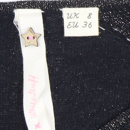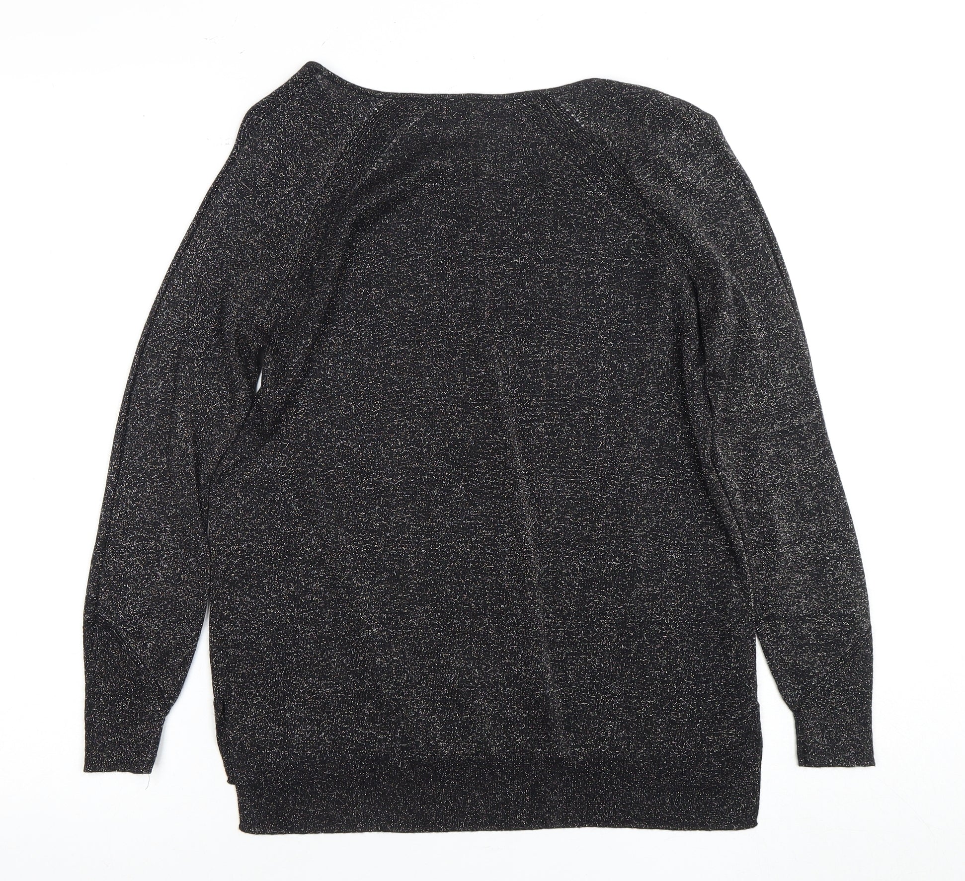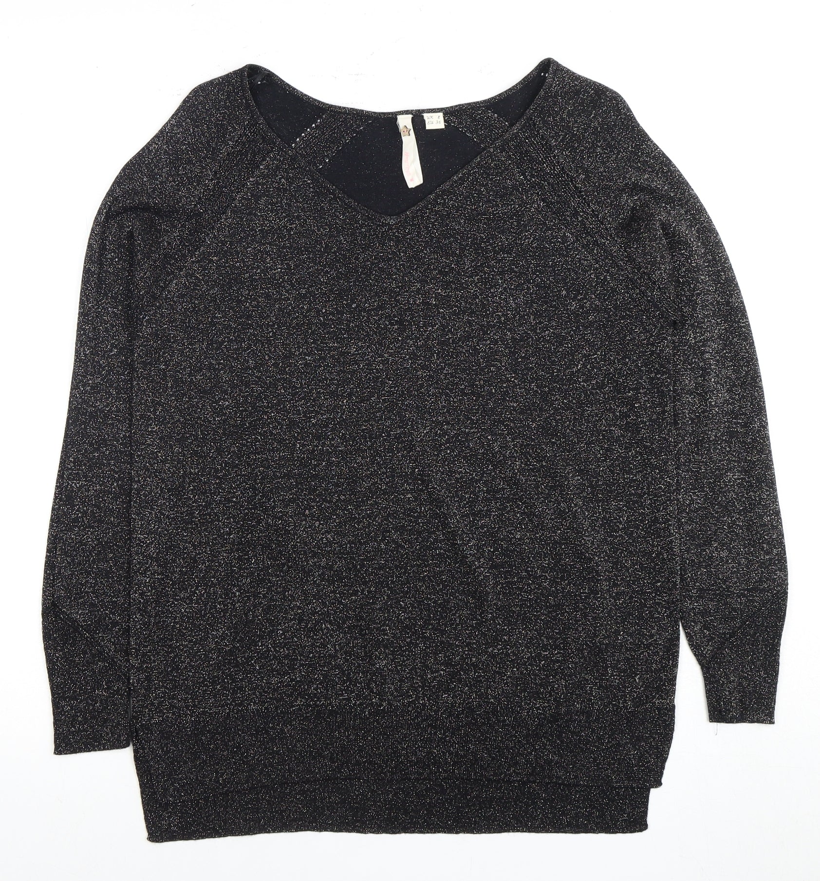 Elevate your wardrobe with this Women's Black Viscose Knit Long Sleeve Top, perfect for any casual or semi-formal occasion. Crafted with a blend of viscose and polyester, this soft knit blouse offers a subtle sheen due to its metallised fibres. Designed in a UK size 8 with a classic V-neckline, it provides a comfortable and flattering fit. The long raglan sleeves add a touch of sophistication, making it an ideal choice for chilly days. Pair this versatile top with your favourite jeans or skirts for an effortlessly chic look. Its solid black colour ensures it goes with practically everything in your wardrobe. Please note, this top is in excellent condition with no visible signs of wear, ready to offer you style and comfort.