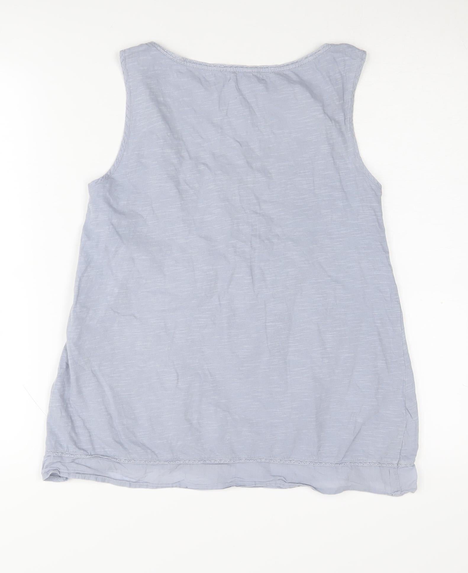 Elevate your casual wardrobe with this classic women's blue tank top, perfect for the effortless yet stylish look you've been searching for. Crafted from 100% soft and breathable cotton, this top ensures all-day comfort and versatility. Its solid blue colour adds a timeless touch to your outfit, making it an ideal choice for those warm days or as a layering piece in cooler weather. The top features a flattering scoop neckline and button accents that offer a subtle yet chic detail to the overall design. With its sleeveless silhouette, this tank top is your go-to piece for pairing with your favourite jeans, skirts, or shorts. The relaxed fit of this top gently drapes over your body, providing a comfortable and easy fit. Machine washable for easy care, it's designed to be a hassle-free addition to your daily wear collection. Though pre-loved, it remains in excellent condition with no visible damages, reflecting light wear that adds to its charm. Whether you're heading out for a casual day with friends or relaxing at home, this tank top is an effortless choice that seamlessly blends comfort with style. Grab this wardrobe essential today and experience a perfect blend of simplicity and elegance.