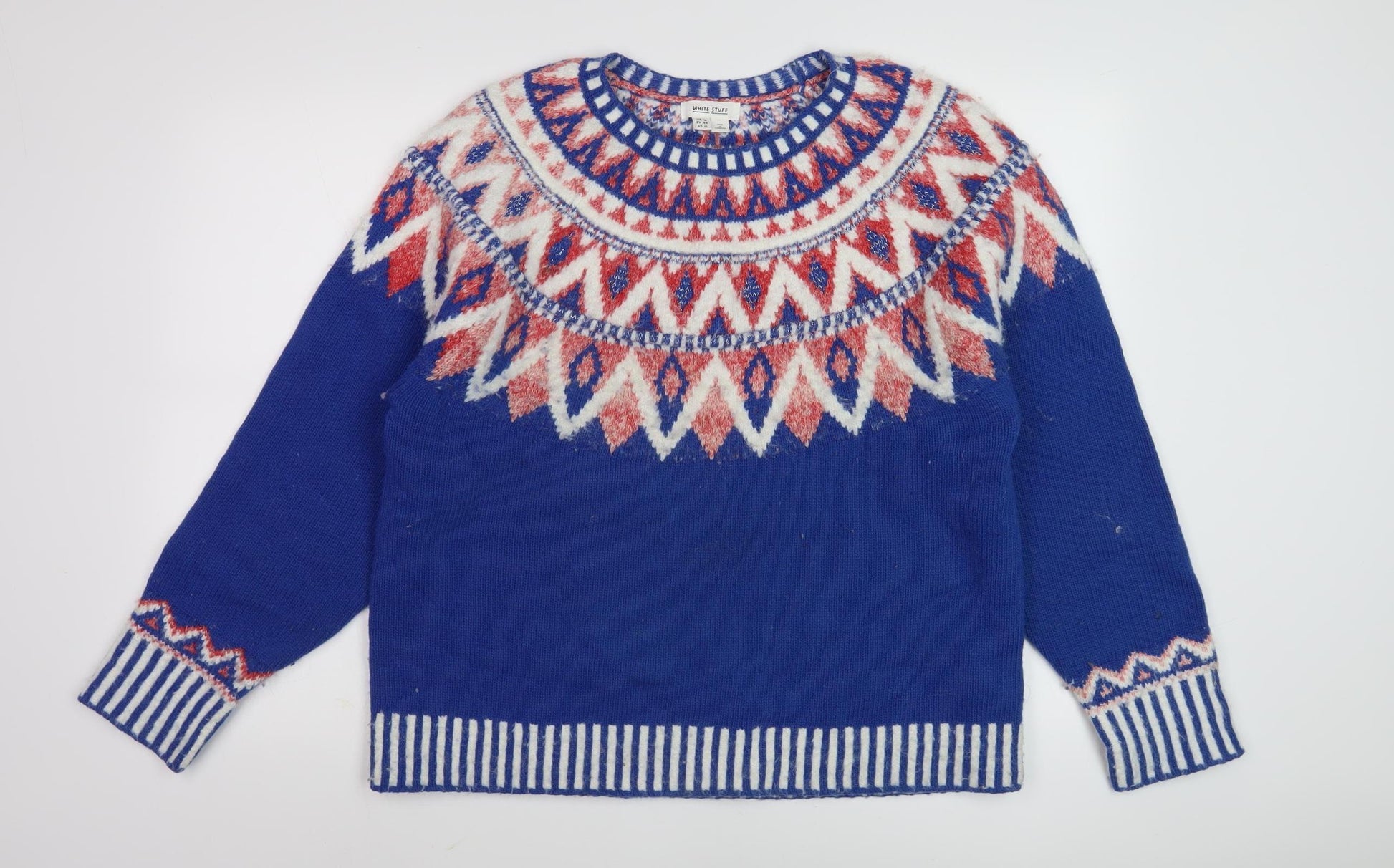 Discover the charm of winter with the White Stuff Women's Blue Fair Isle Pullover Jumper. Expertly crafted for warmth and style, this chunky-knit jumper is perfect for the cold season. Made from a luxurious wool blend, it ensures both comfort and durability. The classic Fair Isle pattern adds a touch of tradition to this vibrant piece, making it a standout addition to any wardrobe. With long sleeves and a crew neckline, it provides ample coverage and a flattering fit for casual occasions. Ideal for pairing with jeans or skirts, it offers endless styling possibilities. Don’t miss this excellent condition piece that guarantees to turn heads while keeping you cozy. Get ready to embrace elegance and warmth in every wear.