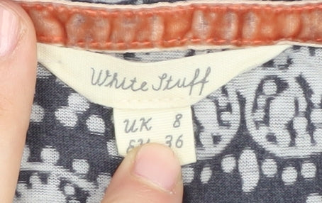 Upgrade your casual wardrobe with this stylish White Stuff T-shirt, perfect for any occasion. Crafted from a breathable blend of polyester and cotton, this blue geometric patterned shirt offers a comfortable regular fit, making it an ideal choice for everyday wear. The short sleeves and round neckline add to its classic appeal, ensuring you stay comfortable throughout the day. The easy-care jersey fabric is machine washable, providing convenience in maintaining its fresh look. Whether you're out for a casual day or just relaxing at home, this versatile tee is a must-have addition to your collection. Accentuate your style with this chic essential that's sure to become your go-to piece. With no visible defects, this excellently maintained top is ready to enhance your wardrobe. Grab this fashionable item today and enjoy its timeless charm.