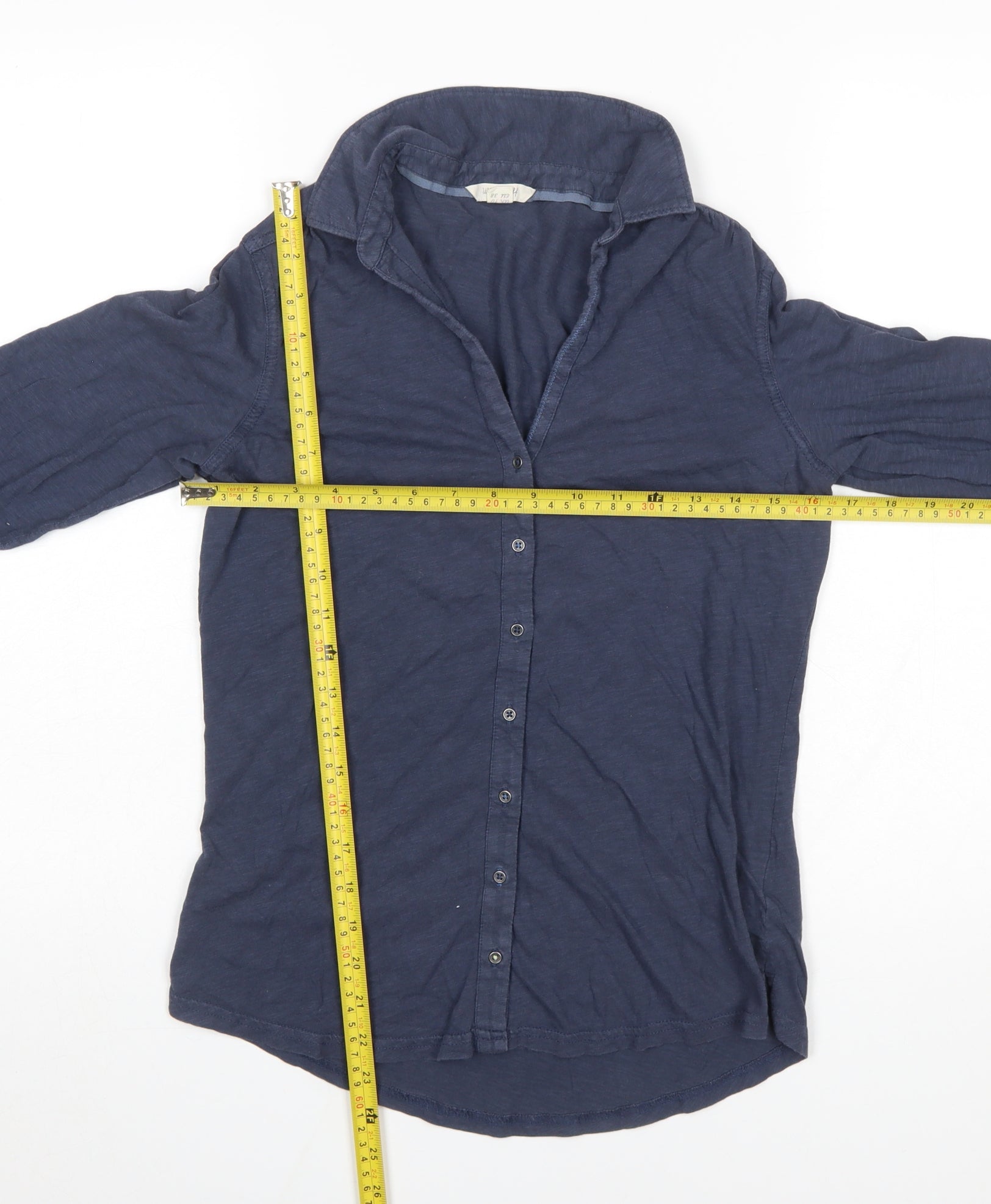 This White Stuff women’s blue button-up shirt offers effortless everyday style with the comfort of natural fibres. Crafted from 100% cotton, it boasts a lightweight, breathable feel — perfect for layering across seasons. The shirt features a classic collared neckline paired with long fitted sleeves and a button-down front for a timeless, casual silhouette. Its solid navy shade offers versatile wear, easily pairing with jeans, skirts or tailored trousers for both relaxed and work-ready looks. The soft woven fabric provides a naturally textured appearance with a relaxed drape that moves comfortably throughout the day. Designed in a flattering regular fit, this wardrobe staple transitions seamlessly from spring through autumn and can even be used as a light layering piece on cooler summer days. Subtle breathable qualities make it perfect for all-day wear, whether you’re heading out for coffee, attending a casual meeting or enjoying a laid-back weekend outing. The shirt’s condition remains very good, showing no visible stains or damage, though it may arrive with minor creasing from storage which will easily smooth out after washing or ironing. Presented in a simple yet refined cut, this White Stuff shirt embodies quality craftsmanship and quiet style, offering a wonderful blend of practicality and comfort. Ideal for women seeking a reliable everyday top with a touch of modern charm, it’s easy to care for at home and machine washable for long-lasting freshness. A dependable addition to your smart-casual collection that looks as effortless tucked into a skirt as it does layered over a camisole with rolled sleeves. Priced affordably, it represents great value for a well-made British brand piece.