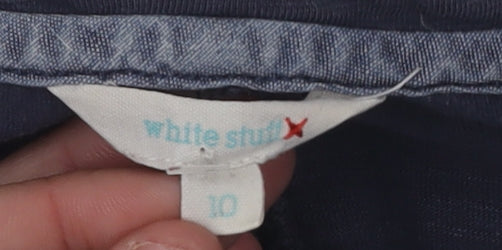 Elevate your wardrobe with this stylish White Stuff dress, designed for women who appreciate both comfort and fashion. In a versatile shade of blue, this size 10 dress is perfect for a variety of occasions. The dress features a classic round neckline, complemented by 3/4 roll-tab sleeves for a practical yet chic look. Made from a high-quality blend of 50% polyester and 50% cotton, it ensures a soft touch against the skin and durability for everyday wear. The dress includes convenient pockets, adding functionality without compromising on style. The button accents on the sleeves provide a subtle yet sophisticated detail, making this dress stand out. Despite its excellent condition, the dress shows no signs of wear, offering you a like-new appearance without the brand's sales tags. Machine washable, it is easy to care for, ensuring you look great with minimal effort. Whether for a casual outing, a day at the office, or a laid-back evening look, this dress is your go-to choice. With its understated pattern and adaptable design, it easily transitions from day to night, making it a staple in every woman's collection. Don't miss out on adding this versatile piece to your wardrobe!