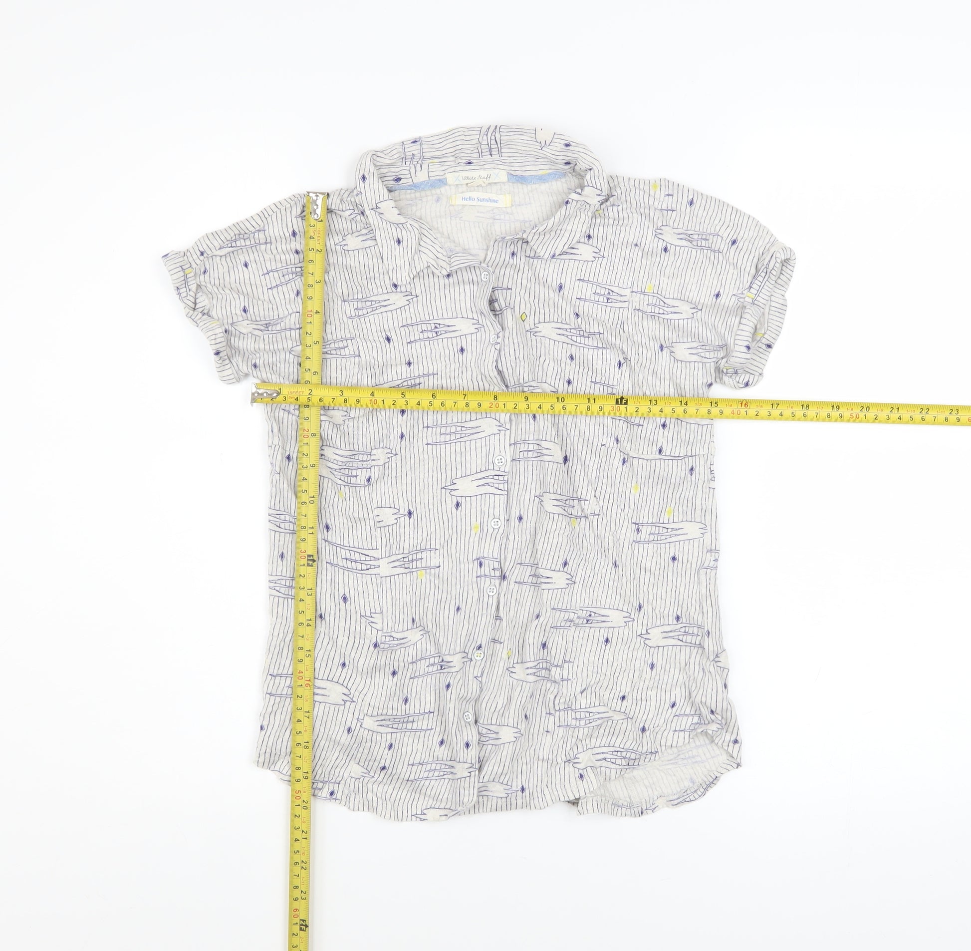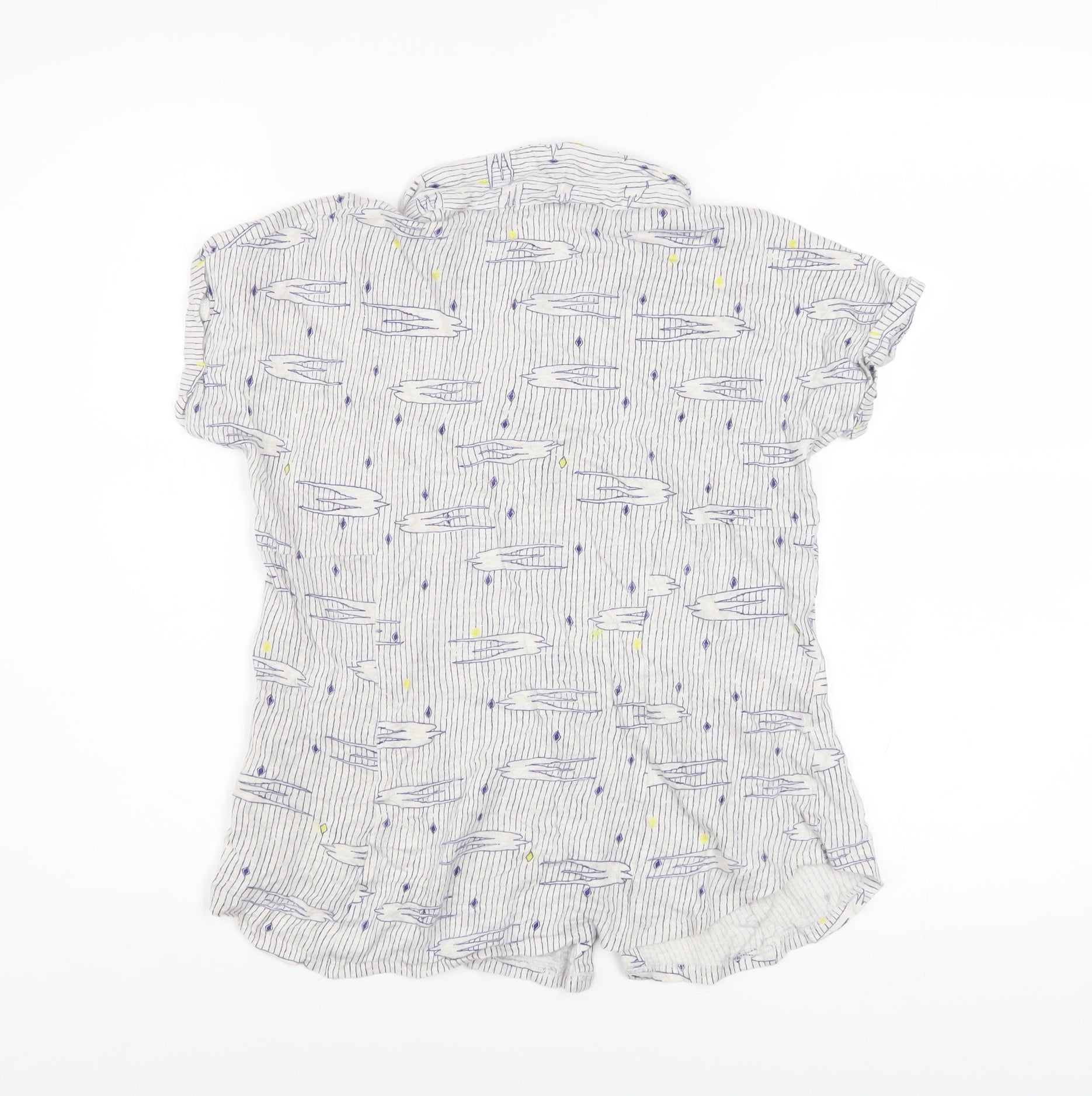 Elevate your casual wardrobe with this charming White Stuff women's short sleeve button-up shirt in a delicate blue and white striped design. Crafted from 100% pure linen, this shirt offers a lightweight and breathable feel that keeps you cool and comfortable during warmer months. The natural fabric provides effortless airflow, making it an excellent choice for spring and summer wear. Featuring a collared neckline and classic button-front closure, this shirt exudes timeless appeal while maintaining a relaxed, everyday style. Its soft woven texture and regular fit ensure both comfort and versatility, with subtle design elements such as button detailing adding a touch of understated elegance. The cap-style short sleeves enhance its easy-going aesthetic, perfect for layering or wearing solo on sunny days. The casual striped pattern is complemented by whimsical motifs in soft shades of blue and yellow, reflecting White Stuff’s signature personality and attention to playful detailing. Perfect for pairing with jeans, chinos, or linen trousers, it can easily transition from day-to-evening wear, whether you’re enjoying a laid-back lunch, travelling, or meeting friends. Designed with practicality in mind, this top is machine washable, allowing for easy care and maintenance. Suitable for a variety of casual occasions, it’s ideal for women seeking style without compromising on comfort. In excellent used condition, the fabric remains crisp and fresh with no visible marks or damage. Offering a relaxed yet refined look, this White Stuff linen shirt provides effortless charm that’s versatile across multiple outfits and seasons. A beautiful spring and summer essential for those who appreciate comfort, quality, and thoughtful British design. Size UK 10 ensures a flattering fit for everyday wear while maintaining a breezy, natural drape. Add a touch of elegance and ease to your wardrobe with this timeless striped linen shirt from White Stuff.