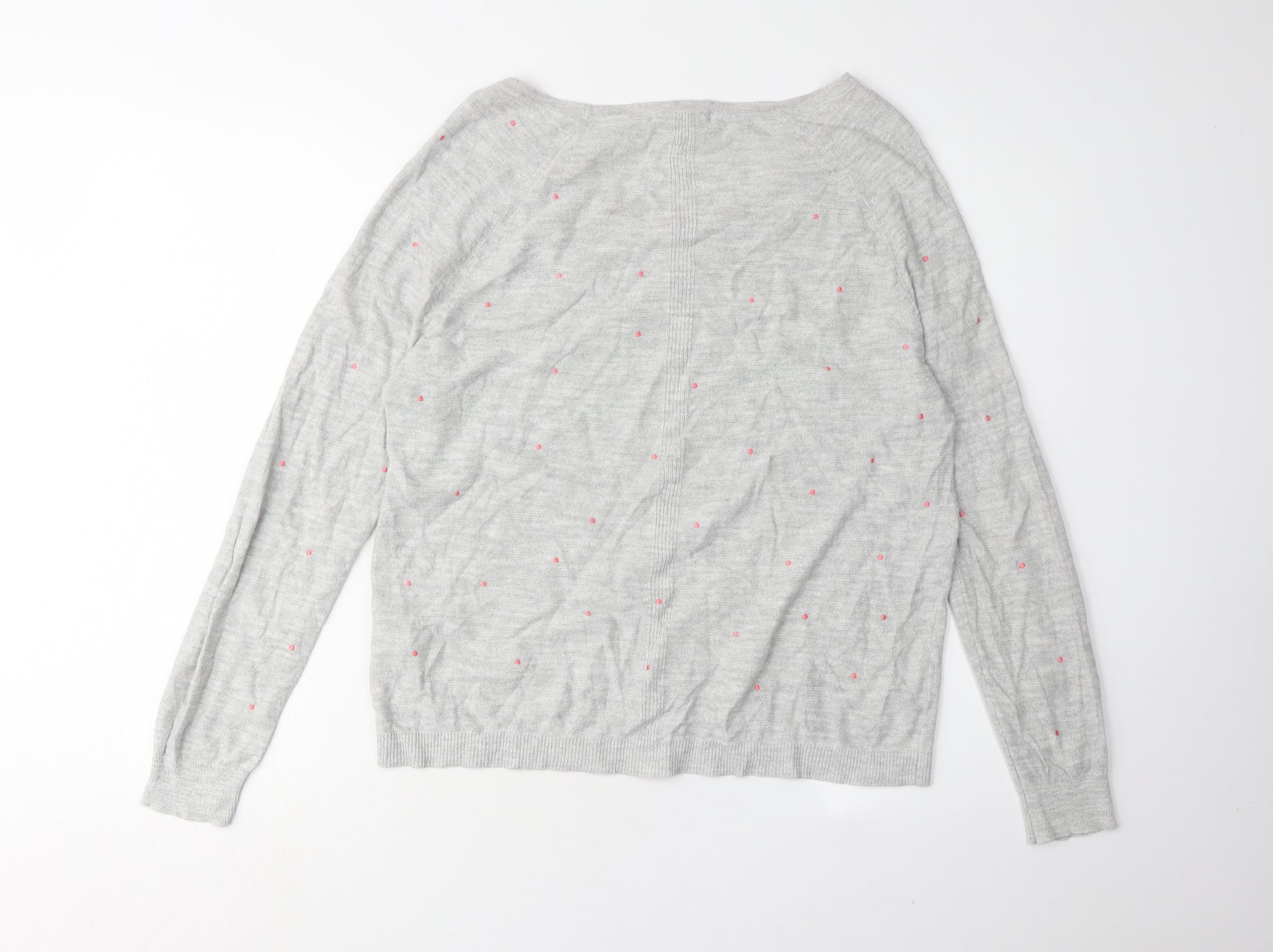 Discover casual elegance with this delightful women's pullover by White Stuff. Lovingly crafted from a blend of 63% cotton and 37% linen, this grey knit jumper offers a soft and breathable experience perfect for transitional seasons like autumn and spring. The subtle polka dot pattern adds a playful touch, while the V-neckline and long raglan sleeves create a classic and versatile silhouette that complements any wardrobe. Ideal for casual occasions, this jumper provides both style and comfort, making it a must-have addition to your collection. Whether paired with jeans for a laid-back weekend look or layered over a dress for a chic ensemble, this jumper brings effortless charm to every outfit. Excellent condition with light wear ensures long-lasting quality without sacrificing style. Hand wash only to maintain the fabric's pristine condition. A smart choice for those who value both aesthetic appeal and practical comfort.