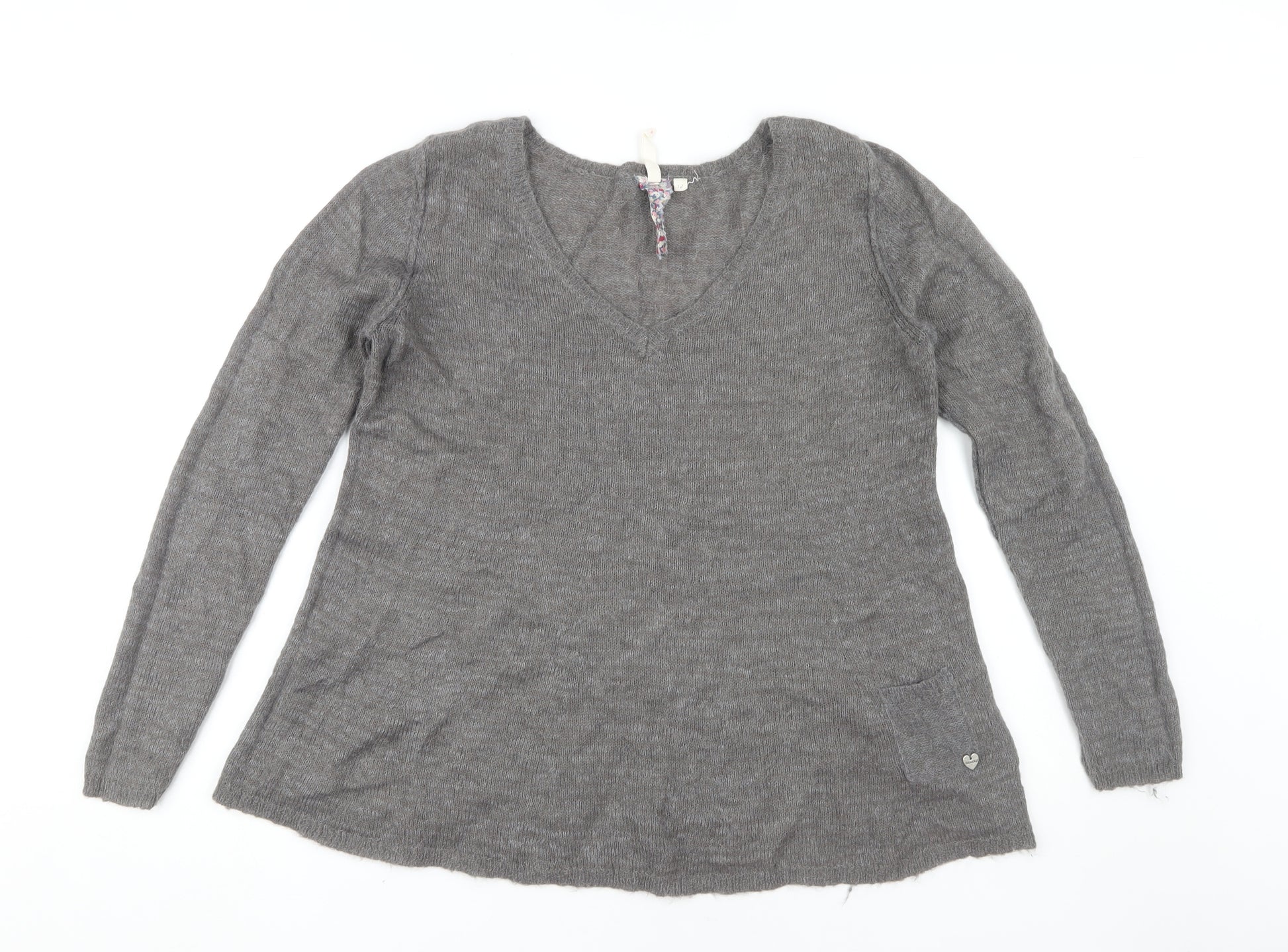 Step into effortless style with this elegant White Stuff Women's Pullover Jumper. Crafted from a luxurious blend of materials including acrylic, cotton, nylon, alpaca, and wool, this jumper is perfect for tackling all seasons with comfort and grace. The heather grey tone gives this piece a timeless allure, ensuring it'll become a staple in any wardrobe. Designed with a flattering V-neckline and a regular fit, it pairs perfectly with both casual and smart-casual outfits. The long sleeves add a touch of elegance while ensuring warmth and comfort on cooler days. Note, this item is prone to slight shedding, adding a unique texture to its premium knit finish. Ideal for casual outings, this piece allows you to showcase laid-back charm effortlessly. Complying with hand wash only care instructions will preserve its quality, offering longevity in your wardrobe essentials.