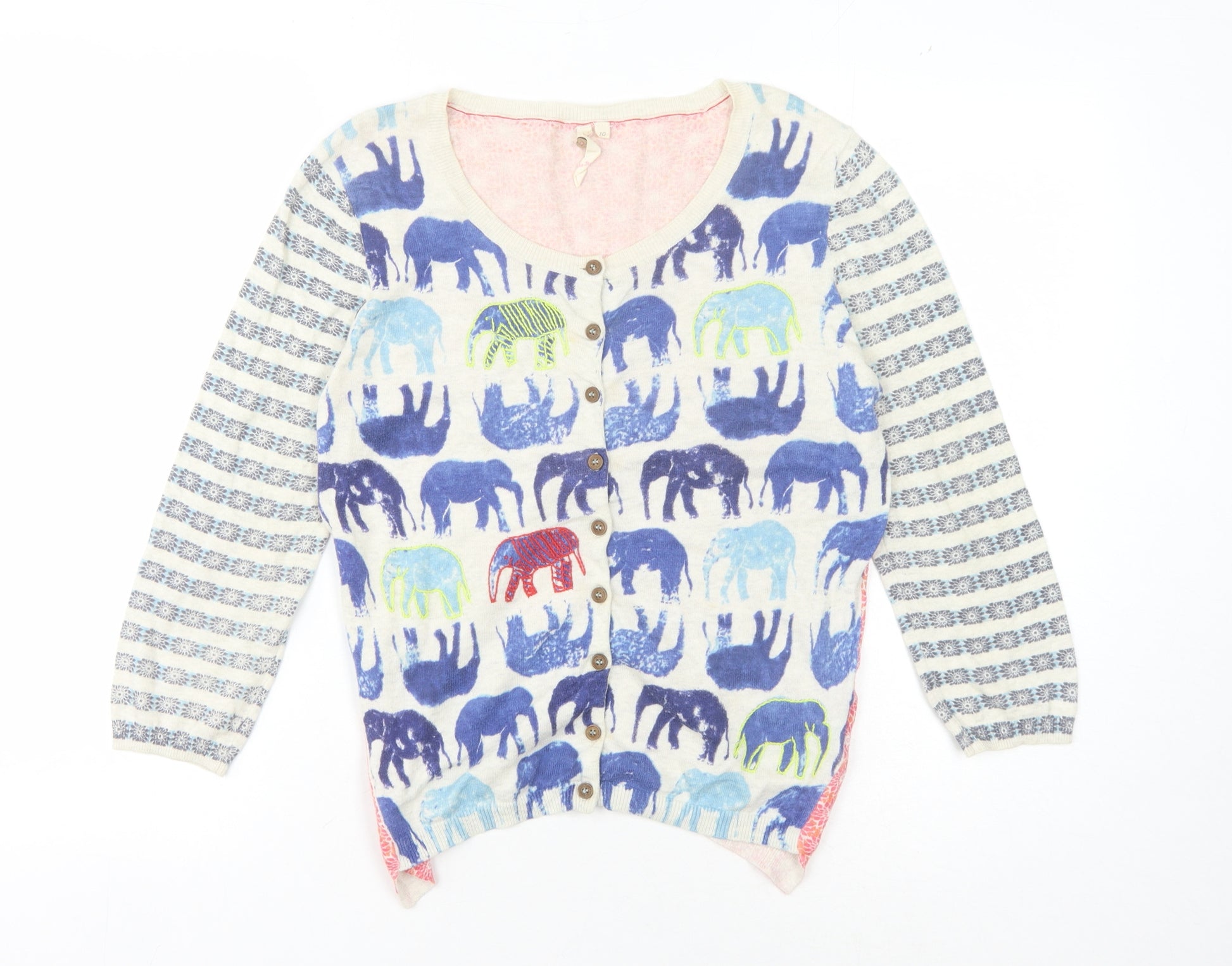 Embrace the delightful charm of this White Stuff cardigan, perfect for any casual setting. Designed with a vibrant, multicoloured animal print, this cardigan is a fun addition to any wardrobe, instantly bringing a splash of creativity and art to your ensemble. Crafted entirely from quality cotton, enjoy the comfort and breathability it offers, ideal for wearing throughout the year. With a classic round neckline and full-length sleeves, this cardigan strikes the perfect balance between style and comfort. Detailed with buttons and a striking graphic print, you're sure to stand out. This piece suits casual occasions, enabling you to express your colourful personality effortlessly. The condition is set to 'Very Good,' with only minor wear visible, assuring vibrant colours remain intact. Machine washable for easy care, this knit cardigan is your go-to for layering when temperatures dip slightly. Discover the artistry and comfort in this regular fit woven fabric, maintaining chic appeal with lasting durability. Add this detailed, distinctive cardigan to your collection if you appreciate the mix of playful design and comfort.