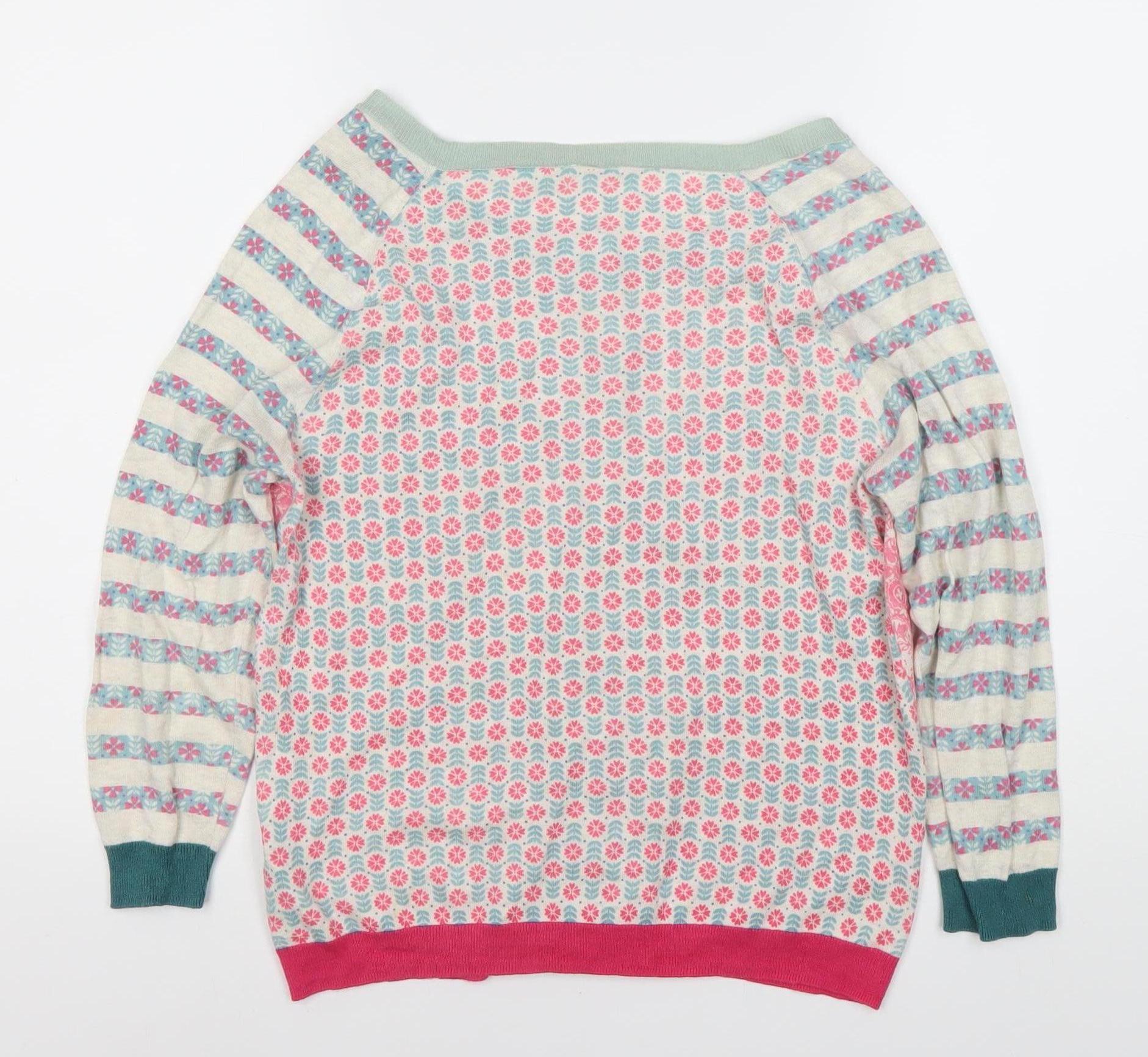 Embrace a fresh and vibrant look with this White Stuff Women's cardigan, perfect for any casual occasion. Crafted from 100% cotton, this delightful knit cardigan ensures breathability and comfort. The colourful floral pattern is complemented by charming button accents, bringing a touch of elegance to your ensemble.Designed with a boat neckline and raglan long sleeves, this piece provides a flattering fit, keeping you stylish and relaxed. The combination of multicoloured hues and tight-knit fabric makes it ideal for spring and summer outings.Whether you're pairing it with your favourite jeans or a summer dress, the regular fit and comfortable design make it an essential addition to your wardrobe. The White Stuff brand guarantees quality and style, making this cardigan an excellent choice for women seeking an effortless and chic look.This machine washable cardigan is in excellent pre-loved condition with no visible wear. Add a splash of colour and creativity to your collection with this versatile piece. Ideal for garden parties, brunch dates, or just an evening out, it’s a delightful way to freshen up your casual attire.
