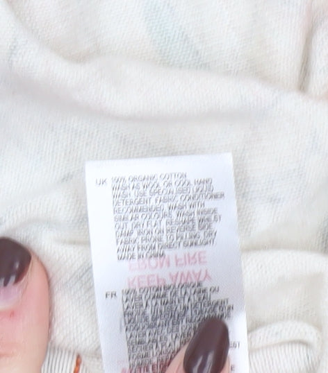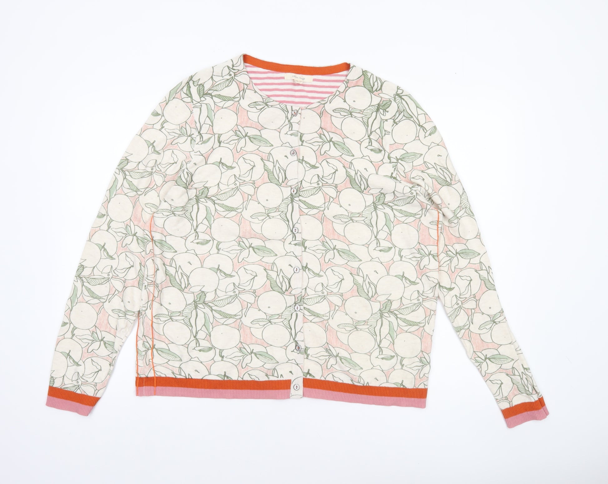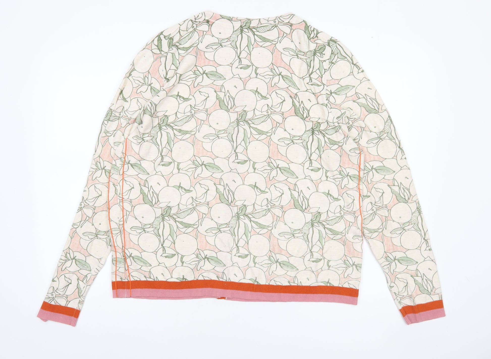 Bring a touch of artistic charm to your wardrobe with this White Stuff women’s floral cardigan in size UK 18. Beautifully crafted from 100% cotton, this lightweight and breathable garment offers both comfort and style, ideal for layering throughout spring, summer, and early autumn. The soft knit fabric is designed with a lovely multicoloured floral pattern in shades of green, ivory, pink, and orange for a fresh, uplifting look. Its classic crew neckline and button-down front make it easy to style over various tops and dresses, whether you are dressing for a relaxed weekend outing or adding a splash of personality to your workwear. The cardigan’s long sleeves and regular fit ensure a flattering yet comfortable shape, suitable for everyday wear. Contrasting ribbed trims in orange and pink give the piece a subtle pop of colour and elevate its overall appeal, staying true to White Stuff’s signature playful detail. Perfect for casual settings, travel, or light layering, this cardigan embodies easygoing elegance. The pure cotton composition provides a soft, breathable finish that’s gentle on the skin and easy to care for with a simple hand wash. The garment is in excellent used condition, showing minimal signs of wear with no noticeable flaws or damage, retaining its strong colour and shape. If you seek a versatile cardigan that combines vibrant design with everyday practicality, this piece will quickly become a favourite in your wardrobe. Pair it with jeans for a casual outing or with a midi skirt for a relaxed yet refined look—its timeless style and soft texture make it a standout choice for effortless layering. A wonderful addition for any woman who appreciates quality fabric, cheerful print design, and reliable comfort with a touch of individuality.