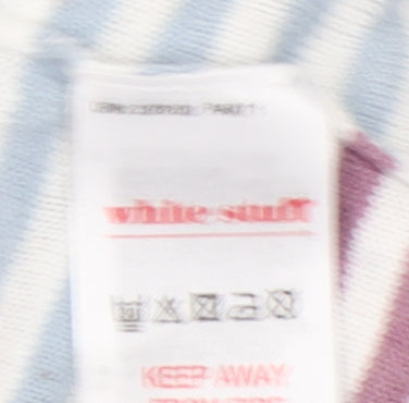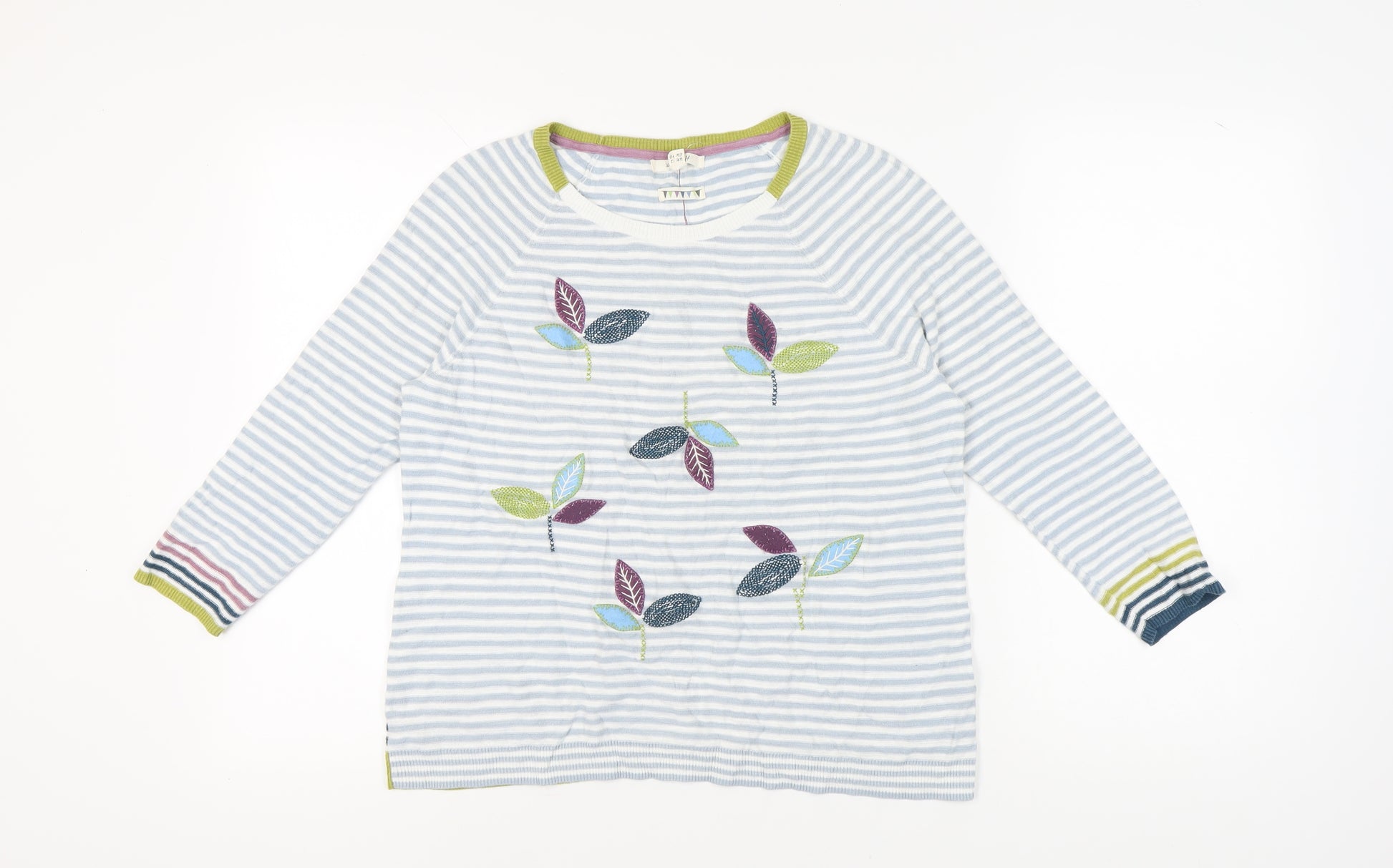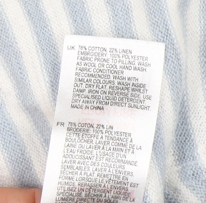 Embrace a touch of playful charm with this White Stuff Women's Jumper, a perfect mix of comfort and style. Designed effortlessly for casual settings, this pullover is crafted in a soft and breathable cotton-linen blend, with 78% cotton providing a lightweight feel and 22% linen adding a subtle texture. The jumper showcases a lively multicoloured palette adorned with delicate embroidered leaf accents, creating a fresh and fun look suitable for spring and summer days. Featuring a classic crew neckline and comfortable long raglan sleeves, this piece offers a relaxed yet flattering fit for everyday wear. The striped pattern adds a timeless, nautical vibe enhanced by the jumper's vibrant hues of blue and green, making it a standout item in any wardrobe. Meticulously detailed with a casual fit, it's an inviting choice for those casual outings or afternoon brunches. Whether paired with jeans or layered over a dress, this White Stuff jumper is an essential staple that merges form and function effortlessly. With a reasonable price reflecting its excellent pre-owned condition, it presents an attractive opportunity to update your collection with a piece that speaks volumes of individuality and thoughtful design. Enjoy the versatile style and enduring comfort offered by this delightful jumper, and step out each day with confidence and flair.