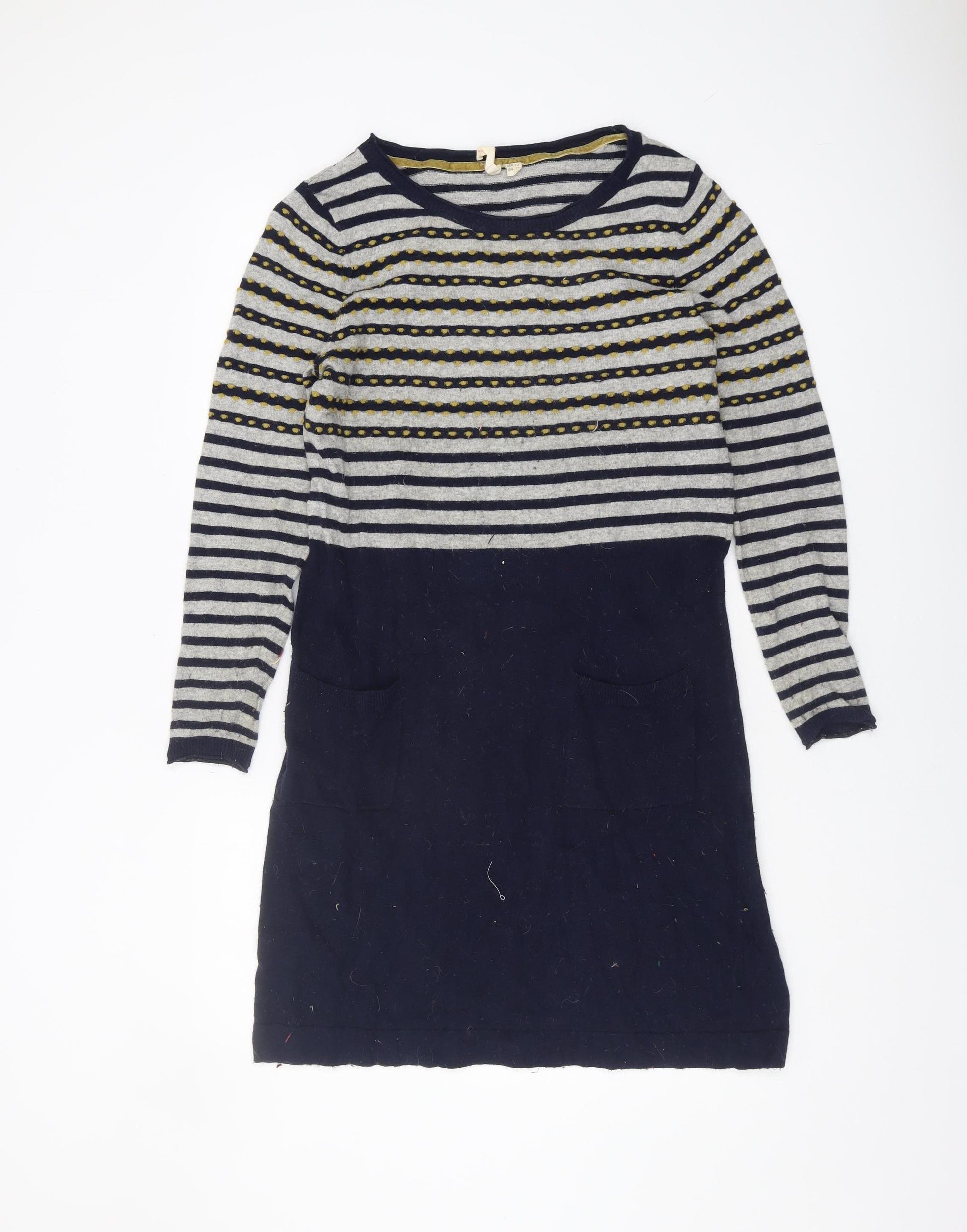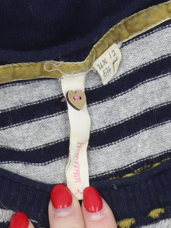 Discover comfort and style with this charming White Stuff women's pullover jumper. Tailored in a size 12, this multicoloured jumper features a delightful striped pattern that's perfect for casual winter wear. Crafted from a soft wool blend, consisting of 70% wool and 30% nylon, it ensures warmth and softness against the skin. The round neckline beautifully frames the face, while the long sleeves provide extra coverage for cooler days. This regular fit jumper is designed with a practical button accent and handy pockets, adding a touch of functionality to its classic design. The chunky-knit style delivers a cosy feel, making it an ideal choice for layering during the colder months. Machine washable for easy care, this jumper promises not only style but convenience. Despite being pre-loved, it remains in very good condition with just a slight hint of lint, showcasing its durability and lasting appeal. Embrace the winter season in this versatile piece that effortlessly transitions from relaxed weekends to casual outings. Its blend of comfort, style, and practicality makes it a must-have addition to any wardrobe.