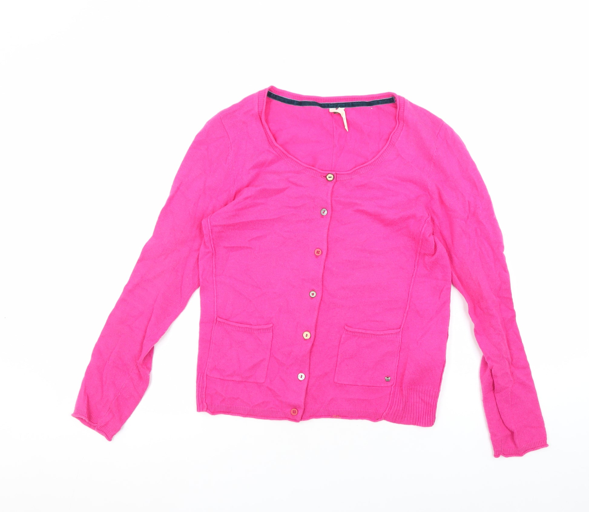 Embrace comfort and style with this charming women's cardigan from the renowned brand White Stuff. Crafted in a bright pink hue, this piece is perfect for adding a splash of colour to your wardrobe. It features a scoop neckline and button accents, providing a classic yet modern look. Ideal for casual occasions, this cardigan is a versatile addition to any collection. The cardigan is made from a luxurious blend of materials, including viscose, nylon, lambswool, cotton, and cashmere, ensuring both warmth and breathability. It offers a regular fit with long sleeves, perfect for layering in the cooler autumn and winter months. The knit fabric enhances warmth and comfort, making it a great choice for any casual outing.Despite its used condition, it remains in excellent quality with only slight pilling visible, ensuring durability and lasting appeal. Hand wash care ensures that the soft fabric retains its pristine condition. With its tight-knit construction, this cardigan promises a warm and cozy fit, ideal for embracing chilly days.Perfect for a casual day out, this cardigan’s regular fit makes it easy to pair with jeans, skirts, or trousers, allowing for endless styling possibilities. Step into comfort and style this season with the White Stuff Women's Pink Cardigan – a must-have for any fashion-forward collection.