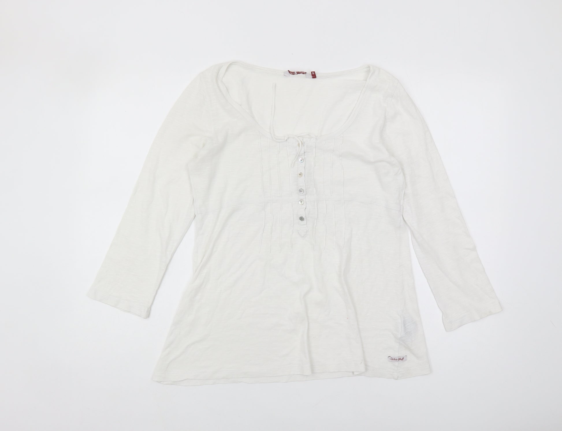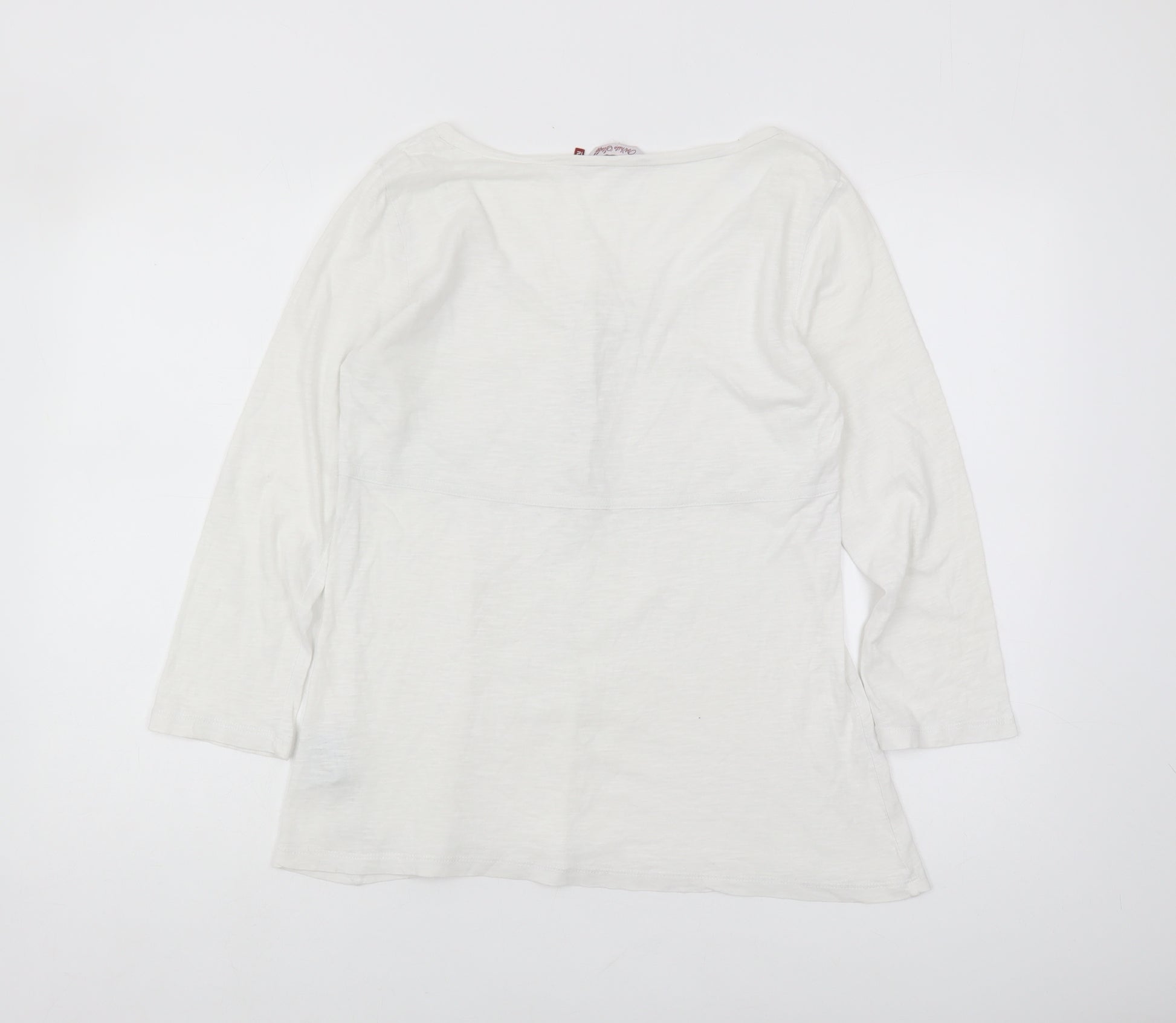Explore timeless elegance with this White Stuff women's blouse, crafted for comfort and style. Designed with a scoop neckline and classic 3/4 sleeves, this versatile blouse features a pristine white colour, perfect for any casual occasion. Made from 100% cotton, it offers breathability and comfort in all seasons. The regular fit ensures a flattering silhouette while maintaining ease of movement. Adorned with a subtle button accent, this solid-patterned blouse adds a touch of sophistication to any outfit. Ideal for autumn, spring, and winter, it pairs effortlessly with jeans or skirts. Machine washable for easy care, this blouse is a staple for your wardrobe. Condition is excellent with minimal signs of wear, making it a fantastic choice for adding a chic, comfy piece to your collection. Don't miss the chance to own this stylish and adaptable garment, perfect for enhancing your everyday style.
