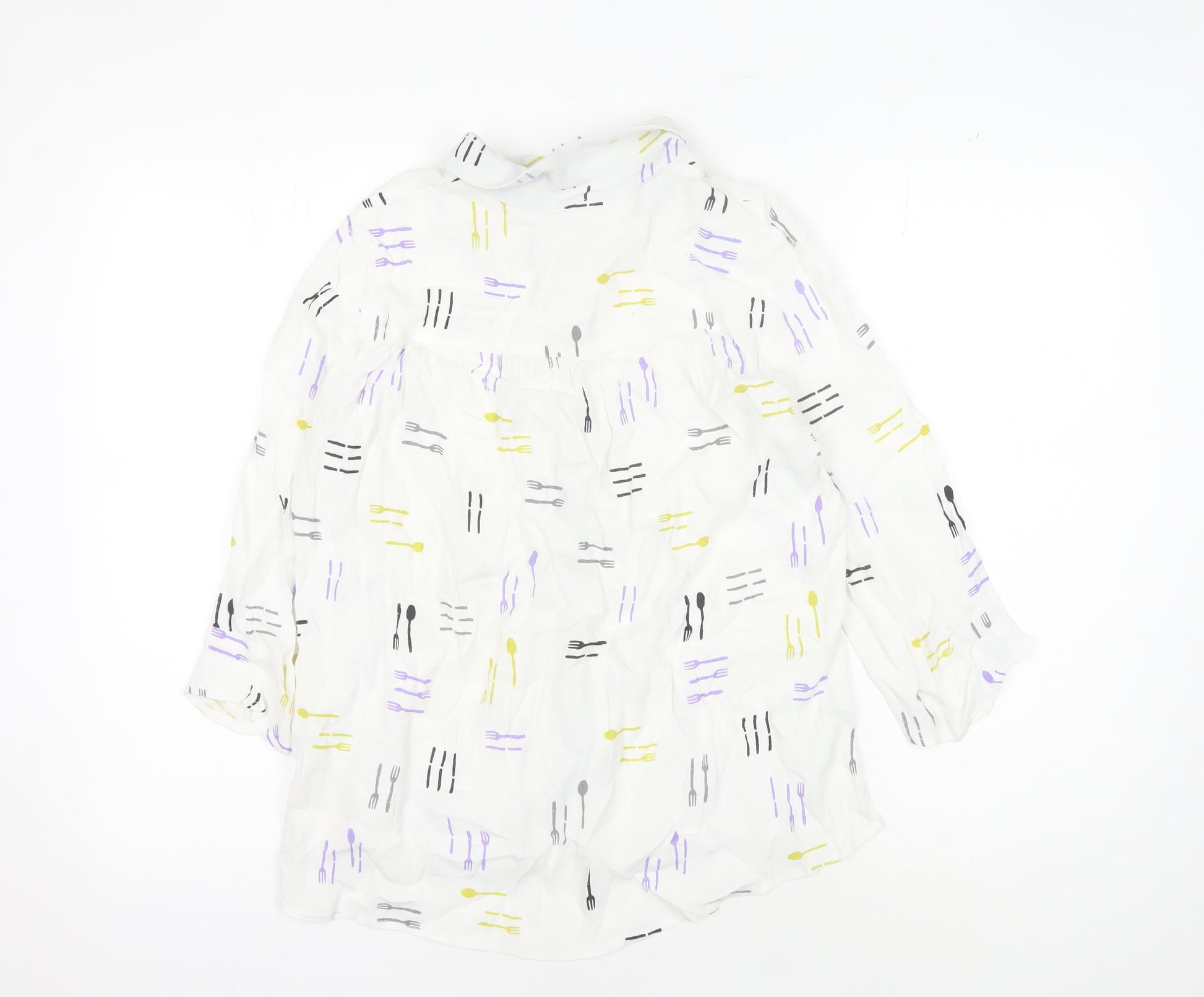 Add a touch of casual elegance to your wardrobe with this charming White Stuff blouse, perfect for everyday wear. Crafted from 100% viscose, this blouse offers a soft, lightweight feel, ideal for staying comfortable during the warmer months. The classic white colour paired with a playful utensil pattern makes it versatile for both casual outings and relaxed office environments. Featuring a collared neckline and 3/4 sleeves, this blouse brings a refined silhouette while allowing ease of movement. The button closure offers a neat finish and the regular size 10 fit ensures a flattering drape for women of varying shapes. Easy to care for with hand wash instructions, this blouse is designed for those who appreciate convenience without sacrificing style. With excellent condition and little signs of wear, this blouse is a wonderful addition to any stylish woman's collection. Whether paired with jeans for a laid-back look or dressed up with accessories, the versatility of this piece will make it a staple in your wardrobe. Don't miss the chance to make this delightful blouse yours today and enjoy the comfort and style it offers.