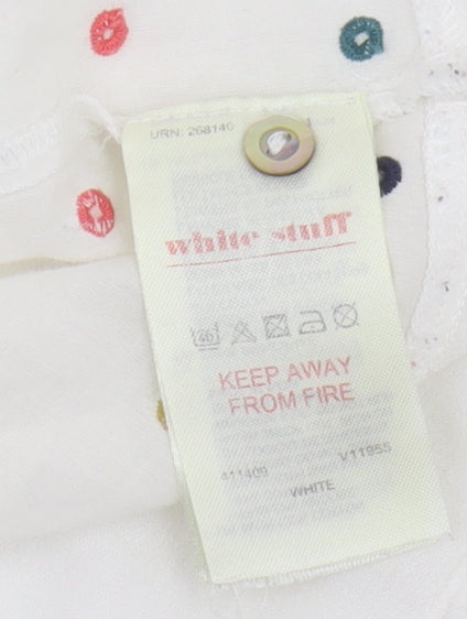 Embrace the playful charm of this White Stuff women's button-up shirt, a delightful addition to your wardrobe. Crafted from pure cotton with a touch of viscose, this shirt offers a breathable and soft experience, perfect for casual outings. Featuring a classic collared neckline and long sleeves, it exudes a timeless elegance that pairs seamlessly with your favourite jeans or trousers.The shirt is adorned with a charming polka dot pattern in multicoloured hues, set against a pure white background. This piece promises to add a splash of personality to your outfit while maintaining a sophisticated edge. The button-up closure adds to its practicality and style, making it easy to wear and versatile for various occasions.Designed with machine washability in mind, this shirt ensures effortless maintenance and convenience, allowing you to enjoy its beauty again and again. Although pre-loved, this shirt is in excellent condition with no visible defects, promising quality and style that will last.Whether you're heading to a casual meeting or a relaxed day out, this White Stuff shirt is an ideal choice for those who value comfort and style. Its regular size 12 fit ensures a flattering silhouette that complements a range of body types, making it a must-have staple for all seasons.