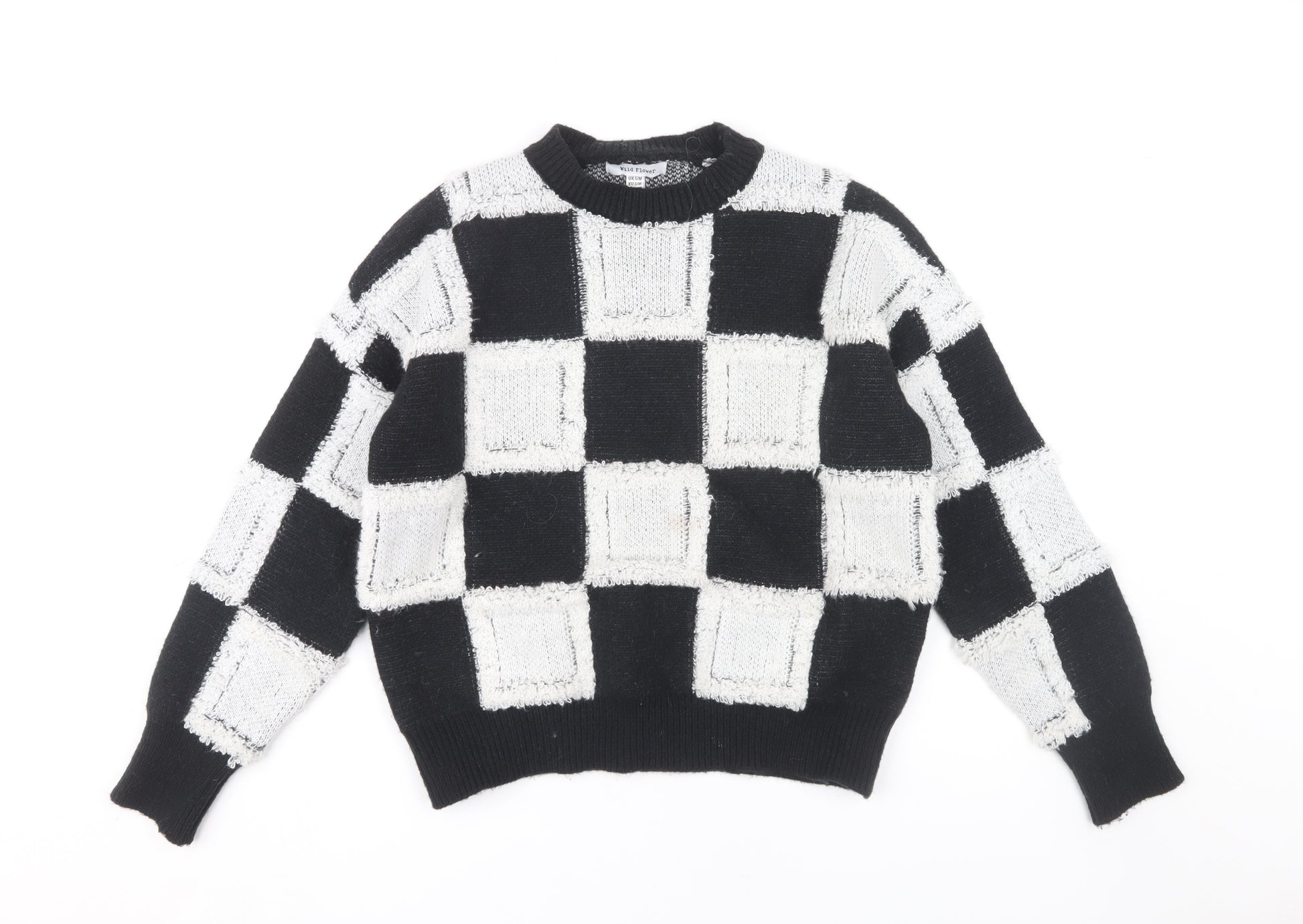 This chic and cosy Wild Flower pullover jumper is a must-have addition to your winter wardrobe. Crafted in a chunky-knit style, it features a striking black and white check pattern that effortlessly elevates any casual outfit. Made from soft polyester, this knit jumper is comfortable and easy to wear, perfect for keeping warm during the colder months.The jumper showcases a stylish crew neckline and long sleeves, offering a classic and versatile look. Designed for regular fit, it suits a variety of body types and pairs beautifully with jeans or skirts. Ideal for casual occasions, the mellow tones and eye-catching pattern make it a standout piece in any wardrobe.Care for your jumper is made simple, as it is machine washable. Though pre-loved, it is in excellent condition, showing no signs of wear and ensuring many more seasons of use. Whether you're heading out for a coffee date or enjoying a relaxed day at home, this jumper adds a touch of warmth and style to your ensemble.
