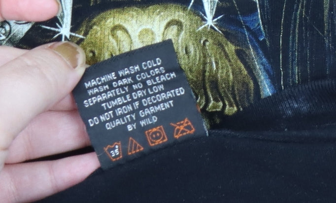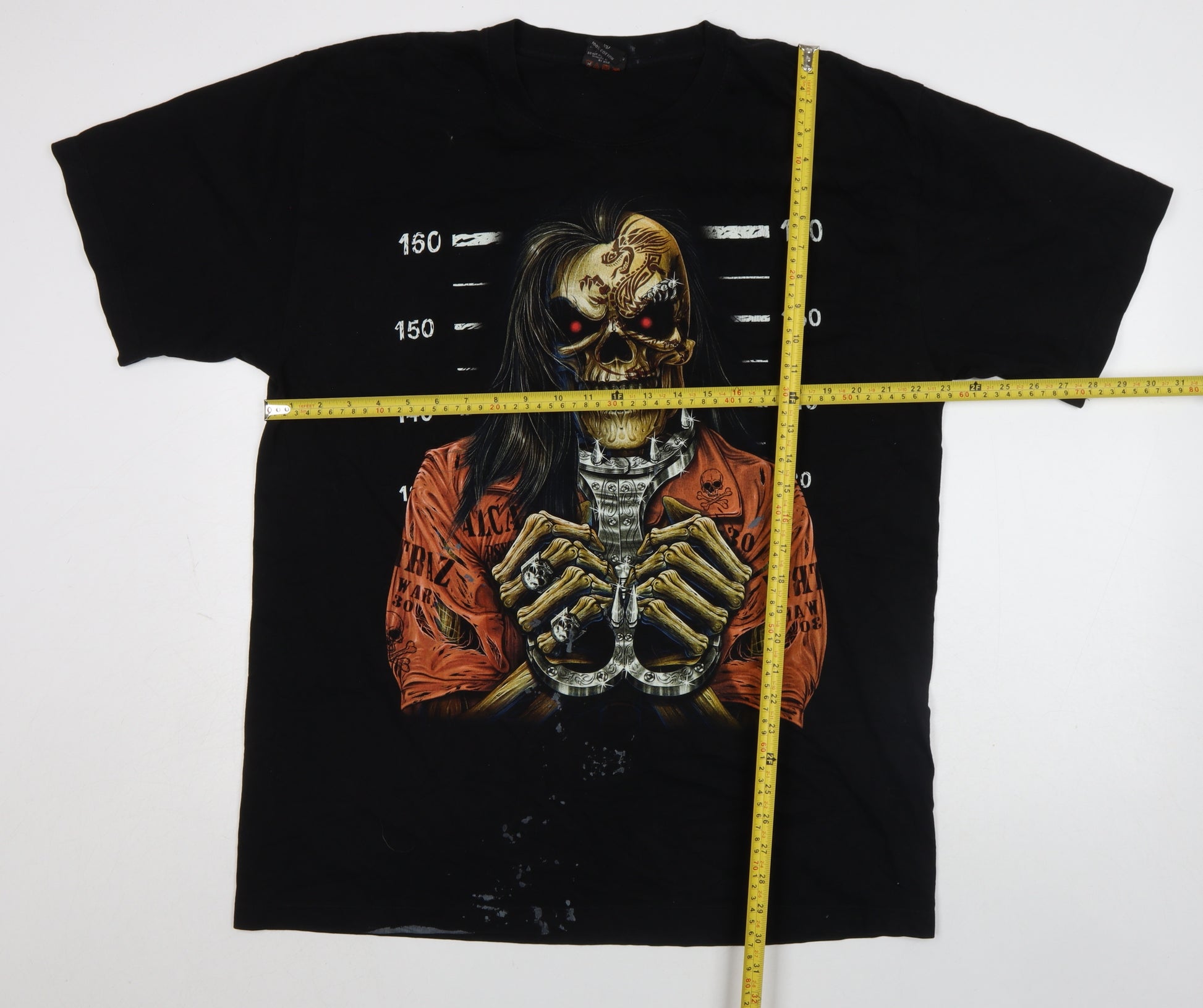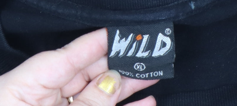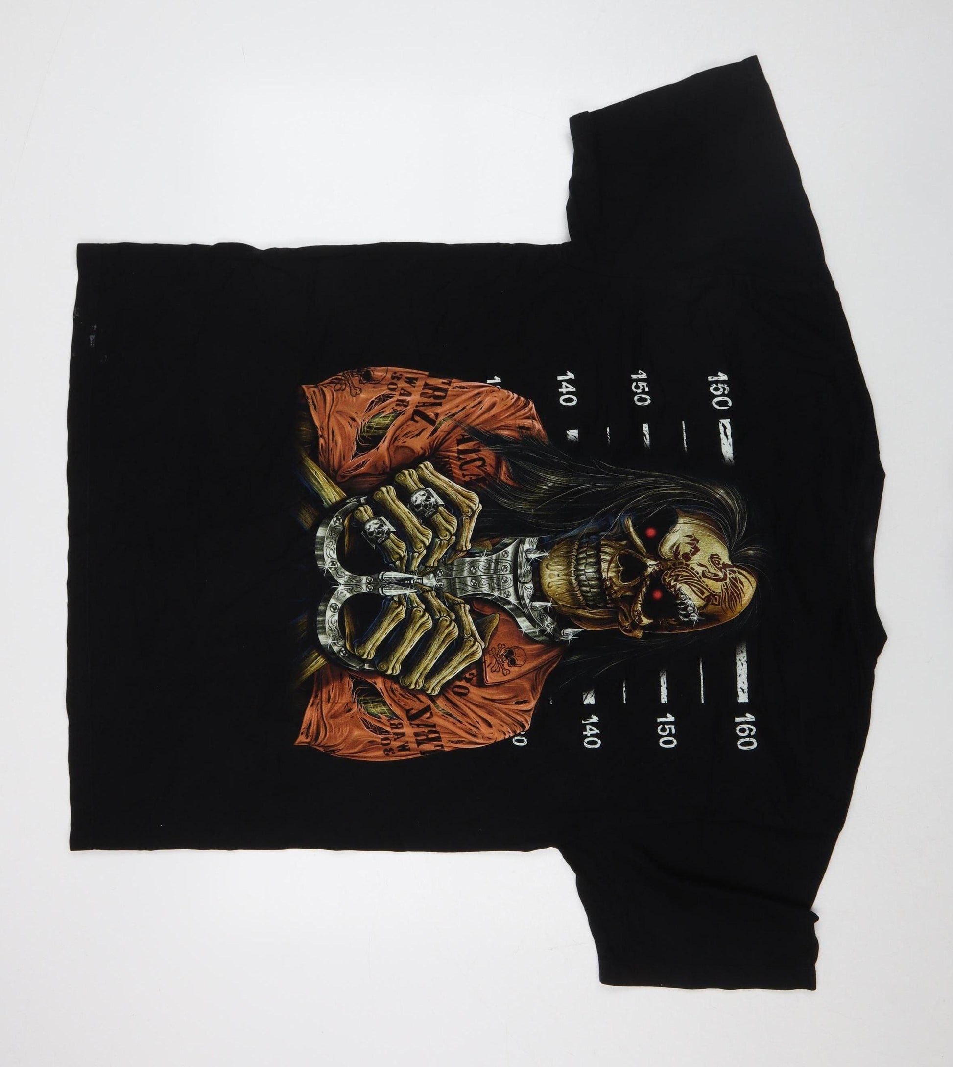 Add bold attitude to your wardrobe with this Wild men’s black graphic T-shirt, featuring a striking horror-inspired skull design printed across the chest. Crafted from 100% cotton in soft jersey fabric, this tee provides breathable comfort that’s ideal for everyday wear. The classic crew neckline and short sleeves make it a timeless choice for casual styling any time of year, while the regular fit ensures a relaxed, easy-going silhouette suited for both layering or wearing on its own. The eerie skull and skeleton handcuff artwork brings a unique heavy metal and rock aesthetic—perfect for concerts, nights out, or making a statement in your everyday look. This eye-catching print stands out vividly against the jet-black background, giving it both edge and personality. Although this T-shirt shows some light paint markings on the front, it remains in good overall condition with plenty of life left—ideal for fans of vintage-style or worn-in graphics. The garment’s machine-washable cotton makes it low-maintenance and comfortable to wear across spring, summer, and autumn months. Whether you’re pairing it with jeans, boots, or layered under a biker jacket, this piece adds a distinctive tough style to any outfit. Its horror-rock theme celebrates individuality and creativity, embodying that effortlessly cool look associated with classic graphic tee culture. This Wild Skull T-shirt is great for collectors of alternative fashion or for those who enjoy standout prints with personality. With its breathable cotton build and expressive design, it balances comfort and eye-catching style perfectly—ready to bring a rebellious spirit to your casual wardrobe. Buy it today and enjoy an authentic graphic piece that exudes edgy character and unmistakable rock heritage, all while maintaining everyday practicality.