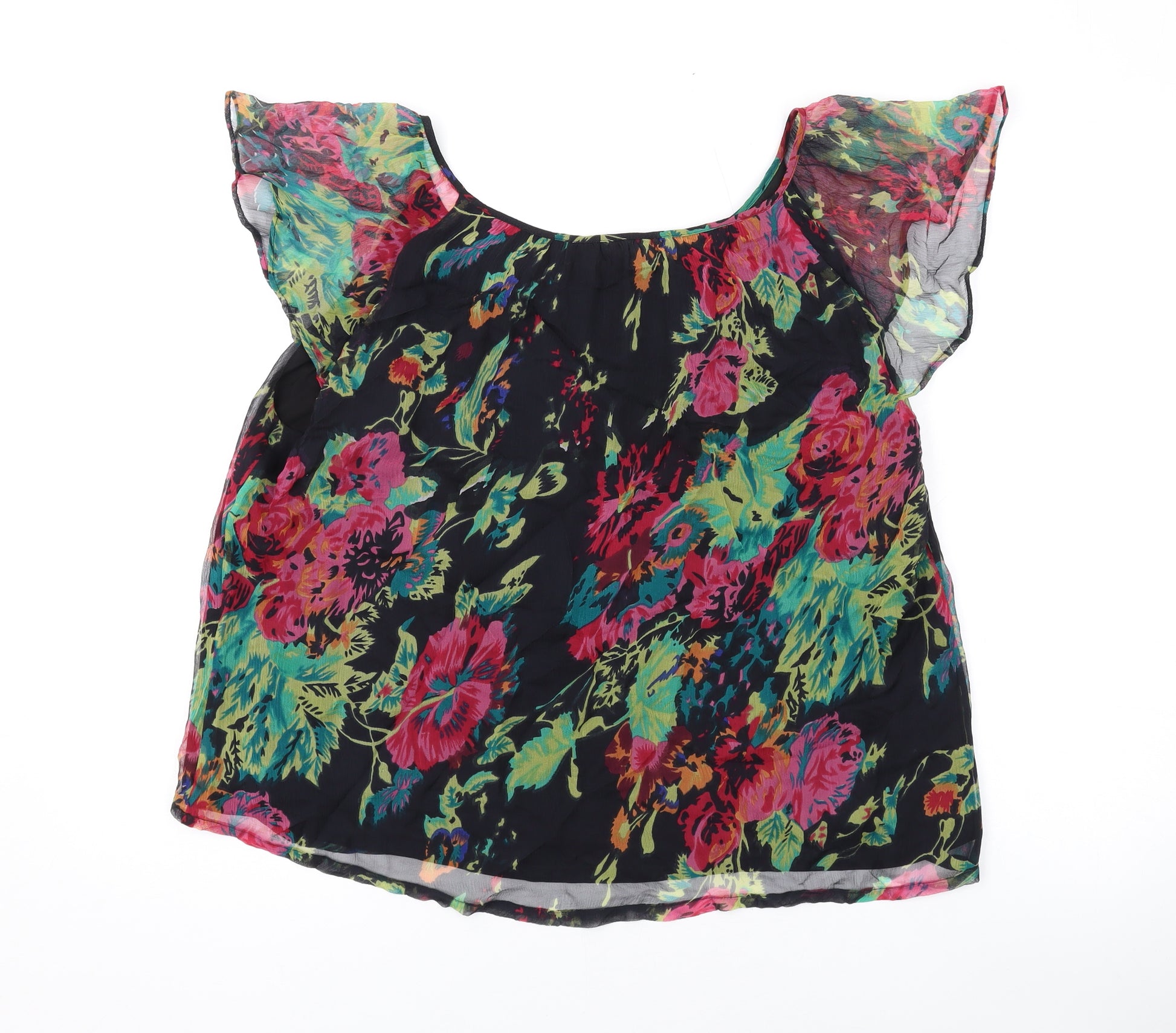 Womens Black Floral Silk Basic Blouse Size 18 Scoop Neck