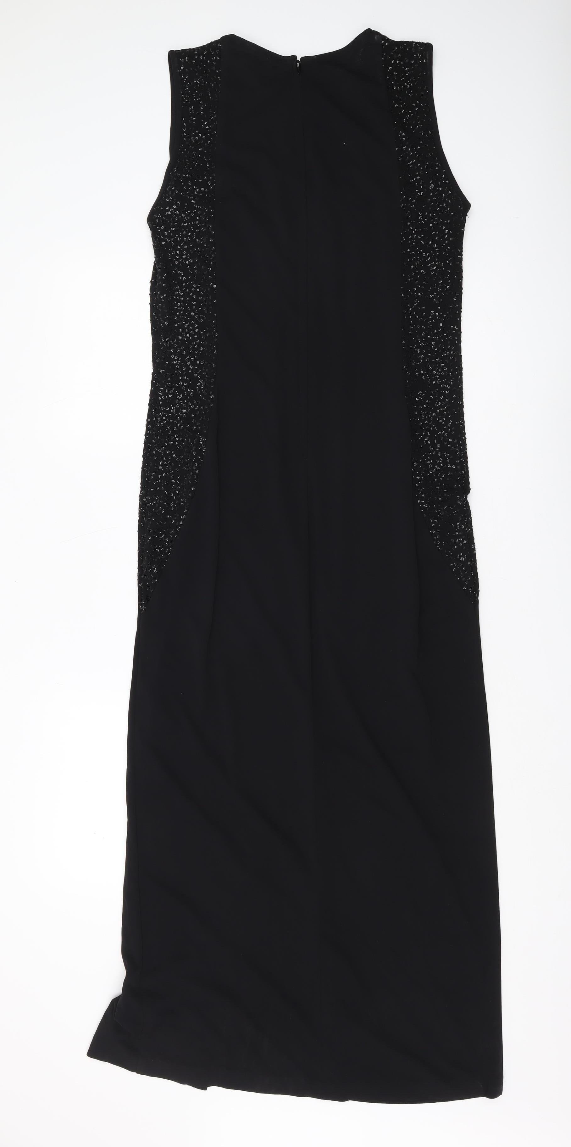 Elevate your evening wardrobe with this striking black sheath dress by Windsmoor. Designed for the modern woman, this midi-length piece offers a sleek silhouette that flatters any figure. The dress is crafted from a soft knit fabric consisting of 97% viscose and 3% elastane, ensuring comfort and stretch for ease of movement. The sleeveless design and round neckline add a touch of elegance, making it an excellent choice for parties or cocktail events. While it lacks any bold patterns, its understated style allows the shimmering black fabric to stand out. This dress is versatile for autumn and winter seasons, pairing beautifully with jackets or shawls. Whether for a night out or a sophisticated gathering, this Windsmoor dress is a timeless addition to your collection.