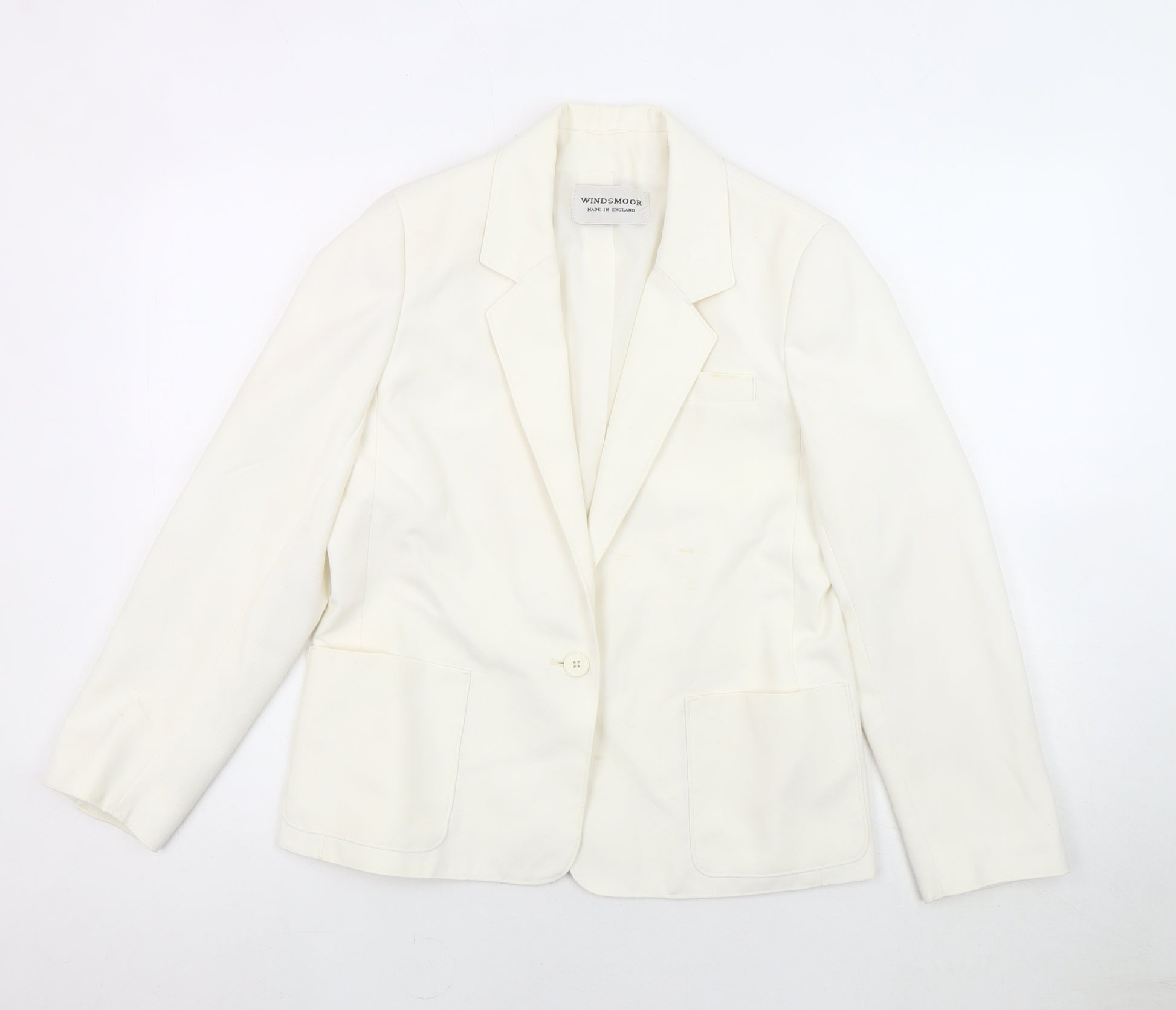 Upgrade your wardrobe with this elegant Windsmoor women's blazer in a crisp white hue, perfect for versatile style options. Tailored for women, this blazer is a size 10 featuring a classic single-breasted cut that offers a refined look suitable for both professional and smart casual occasions. Crafted with precision in England, its regular coat length and long sleeves provide a timeless silhouette, while the notch lapel adds a sophisticated touch to any ensemble. The two-button front closure complements its sleek design, making it a staple piece for all seasons. Despite being in excellent condition with only slight marks on the fabric, this blazer is an outstanding wardrobe addition. Elevate your style effortlessly; a must-have for those who appreciate quality and craftsmanship. Ideal for ladies who value both comfort and elegance, this Windsmoor blazer promises to be a worthy investment.