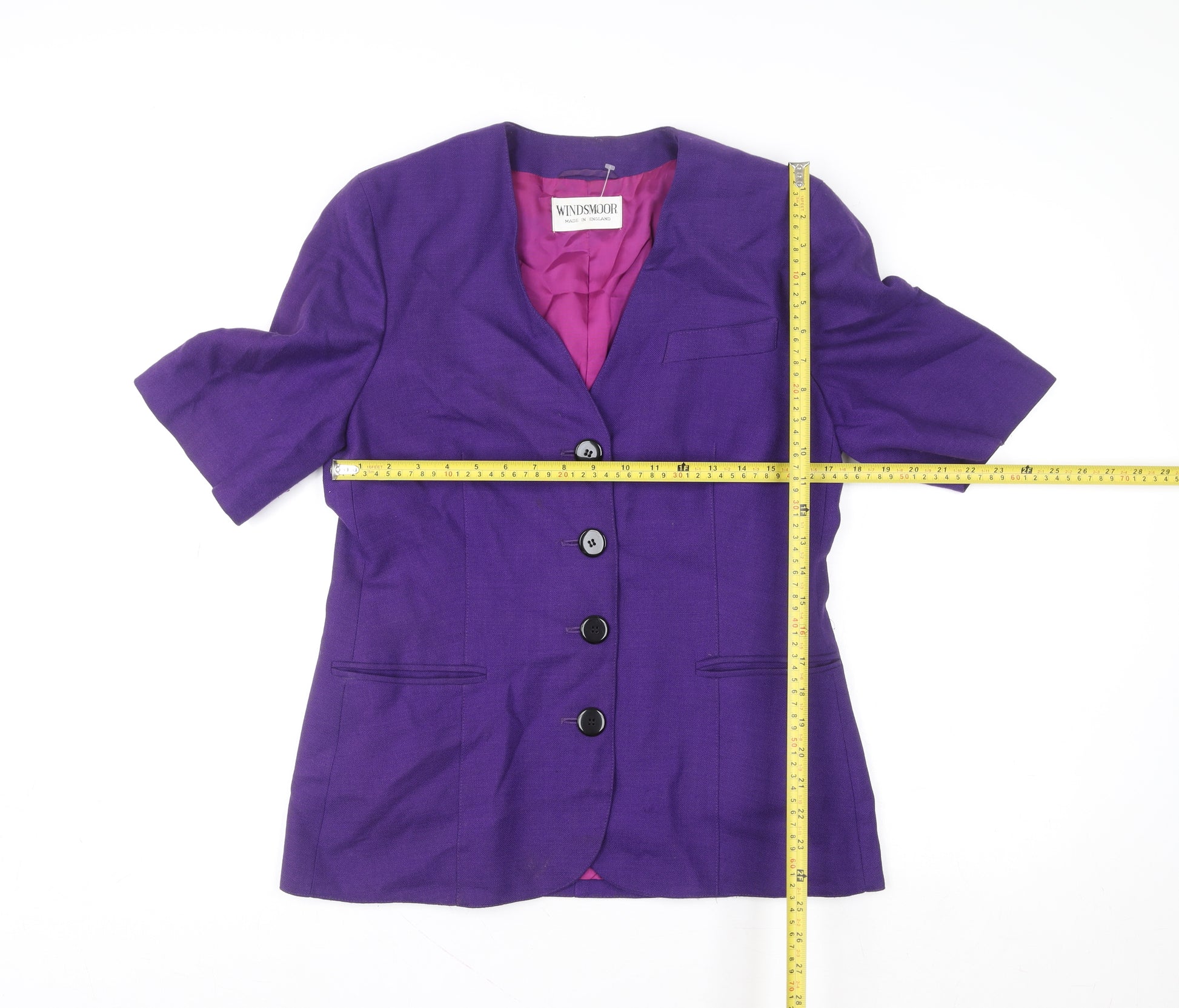 Elevate your office or occasion wardrobe with this elegant Windsmoor Women's Purple Wool Blazer, crafted in England with attention to detail and traditional tailoring. Made from 100% pure wool, the blazer offers a soft yet structured finish that embodies timeless sophistication. The rich purple colour adds a bold, confident flair while remaining versatile enough for professional or formal settings. Featuring a classic single-breasted design with three front buttons, this piece offers a flattering silhouette that enhances the waistline. The short sleeves make it suitable for transitional seasons, while the notched neckline gives a polished, refined look. The interior is fully lined with a smooth acetate fabric in a contrasting magenta hue, providing comfort and a luxurious feel against the skin. This blazer includes two front slit pockets, adding practical elegance to its design, and a precision-crafted cut that ensures a classic fit. Ideal for pairing with tailored trousers or a pencil skirt, this Windsmoor blazer transitions smoothly from business meetings to social events. With its premium wool construction and flattering shape, it captures effortless sophistication combined with functional design. Made to last, it embodies the enduring quality synonymous with British tailoring. In excellent pre-owned condition, showing only minor signs of natural fabric creasing consistent with light wear, this piece remains ready to complement your wardrobe for years to come. A distinguished choice for women who appreciate refined, timeless fashion, this Windsmoor blazer is perfect for creating a put-together look that balances style and professionalism.
