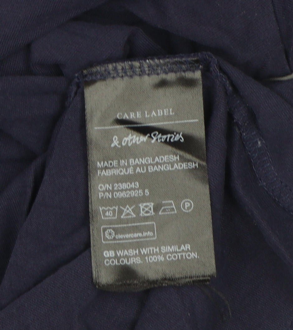 Enhance your wardrobe with this essential blue T-shirt from & Other Stories, ideal for a casual, everyday look. Crafted from 100% cotton, this piece ensures comfort and breathability through spring, summer, and autumn. Featuring a classic crew neck and short sleeves, it offers a regular fit, making it a staple for any occasion. The solid colour provides versatility, easily paired with jeans or skirts. In excellent condition, it's perfect for those who appreciate quality and style. Easy to care for, just pop it in the machine for a quick wash. Add this basic essential to your collection and experience the effortless style it brings. Great for casual outings or layering under jackets, this T-shirt is a must-have. Don't miss out on this wardrobe staple that combines both comfort and fashion with ease.