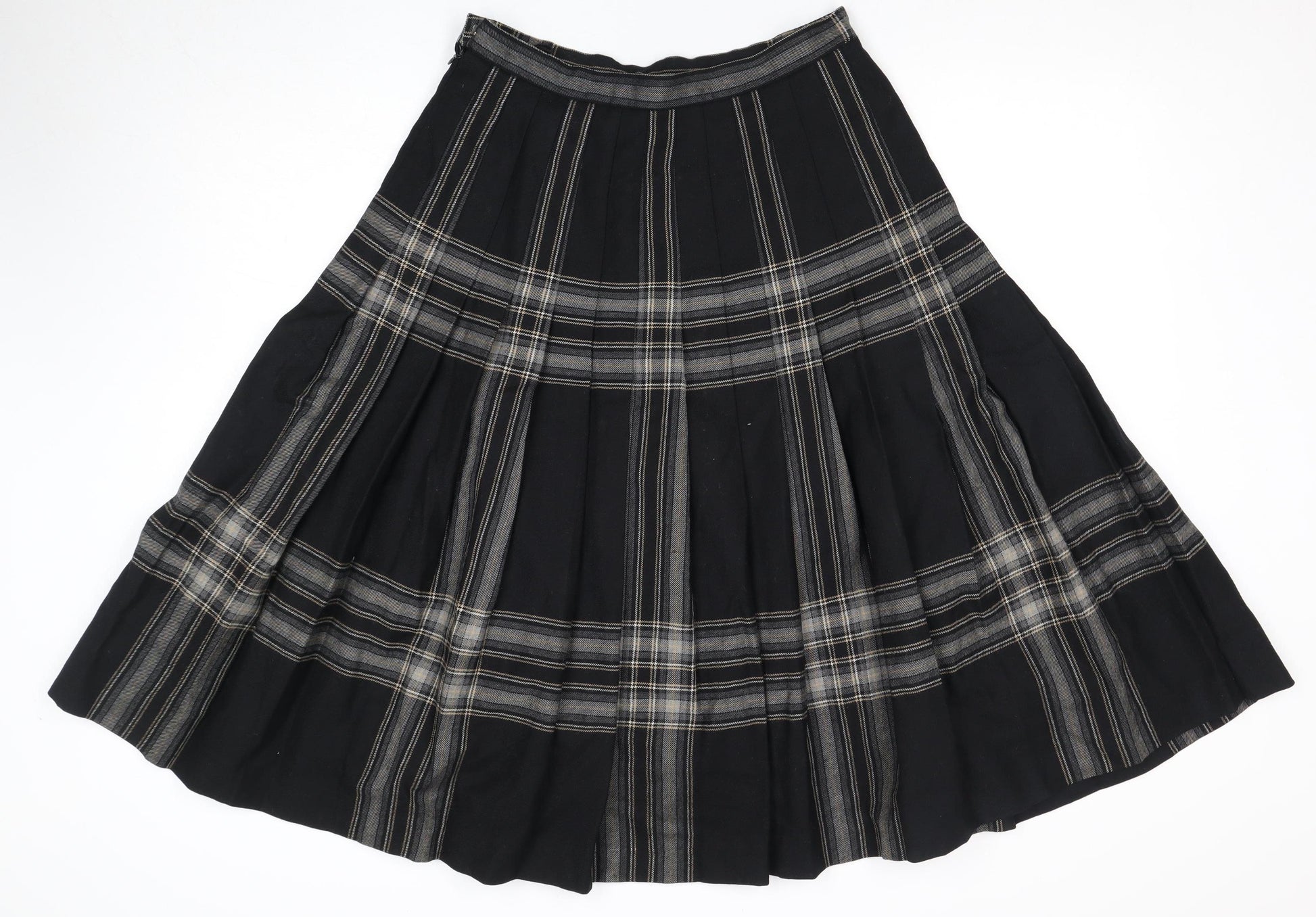 Women's Black Pleated Wool Plaid Long Skirt, Size 14