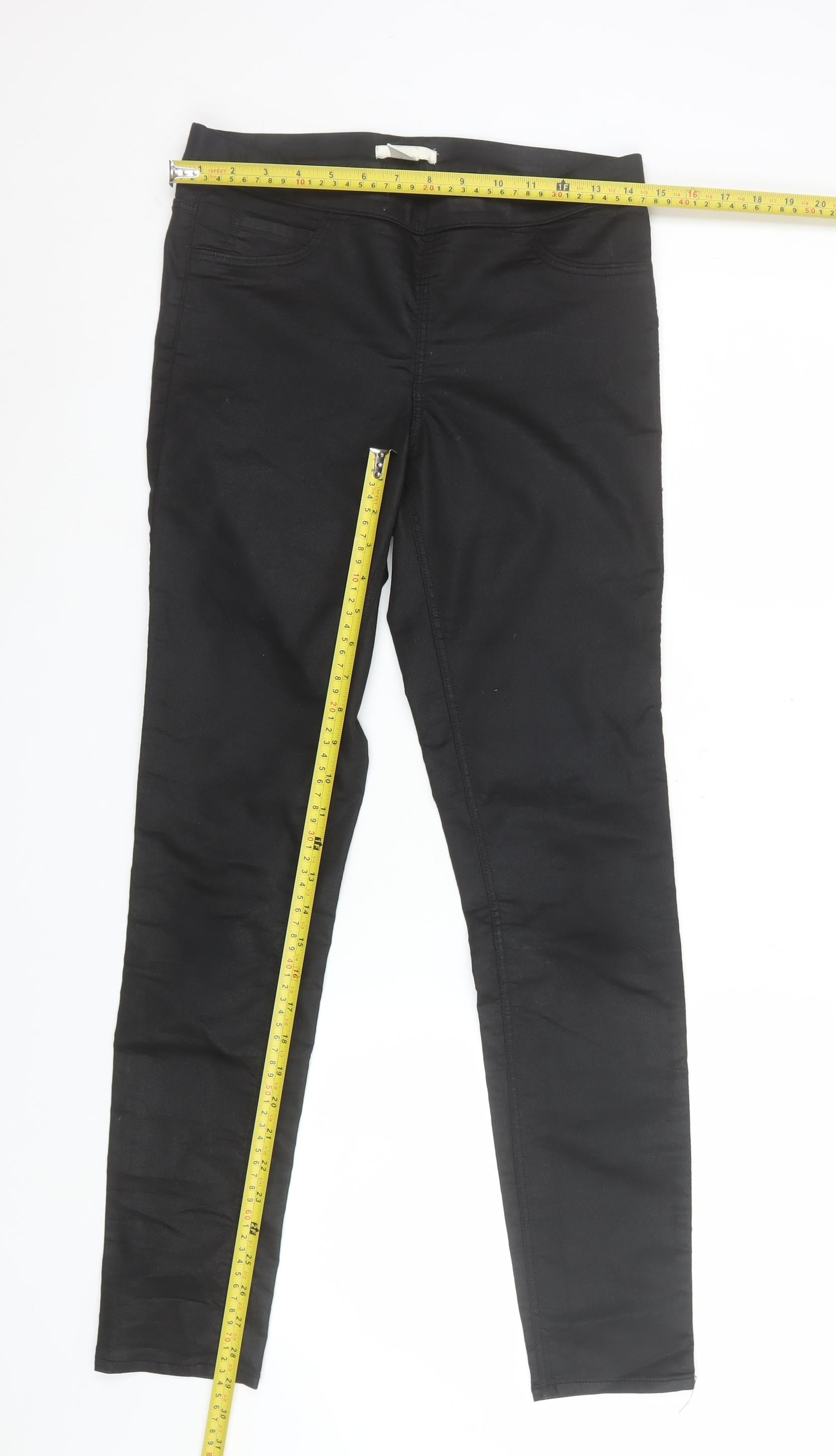Step out in effortless style with these sleek black women's jeggings, designed to blend the comfort of leggings with the flattering silhouette of slim-fit trousers. Crafted from a soft yet durable mix of cotton, polyester, and elastane, these jeggings offer a smooth stretch fit that hugs your figure while moving comfortably with you throughout the day. Featuring a classic black twill fabric and a flat front design, they deliver a chic and versatile look that transitions seamlessly from casual daywear to smart-casual evenings out. The mid-rise fit provides a comfortable waistline, perfect for pairing with a variety of tops, from cosy knits to smart blouses. With functional pockets that add a practical touch, these jeggings are both stylish and convenient for everyday wear. Ideal for the autumn, winter, and spring seasons, their stretch and easy-care material make them a wardrobe essential for travel, errands, or relaxed weekends. Although lightly pre-loved with small marks to the back, they remain in very good overall condition. Pair them with ankle boots for a chic city look or trainers for a laid-back vibe. These versatile jeggings are a fantastic addition to any modern wardrobe, combining form and function in one effortlessly wearable piece. Update your wardrobe basics with this comfortable and flattering pair and enjoy their timeless, go-anywhere design at an excellent price.