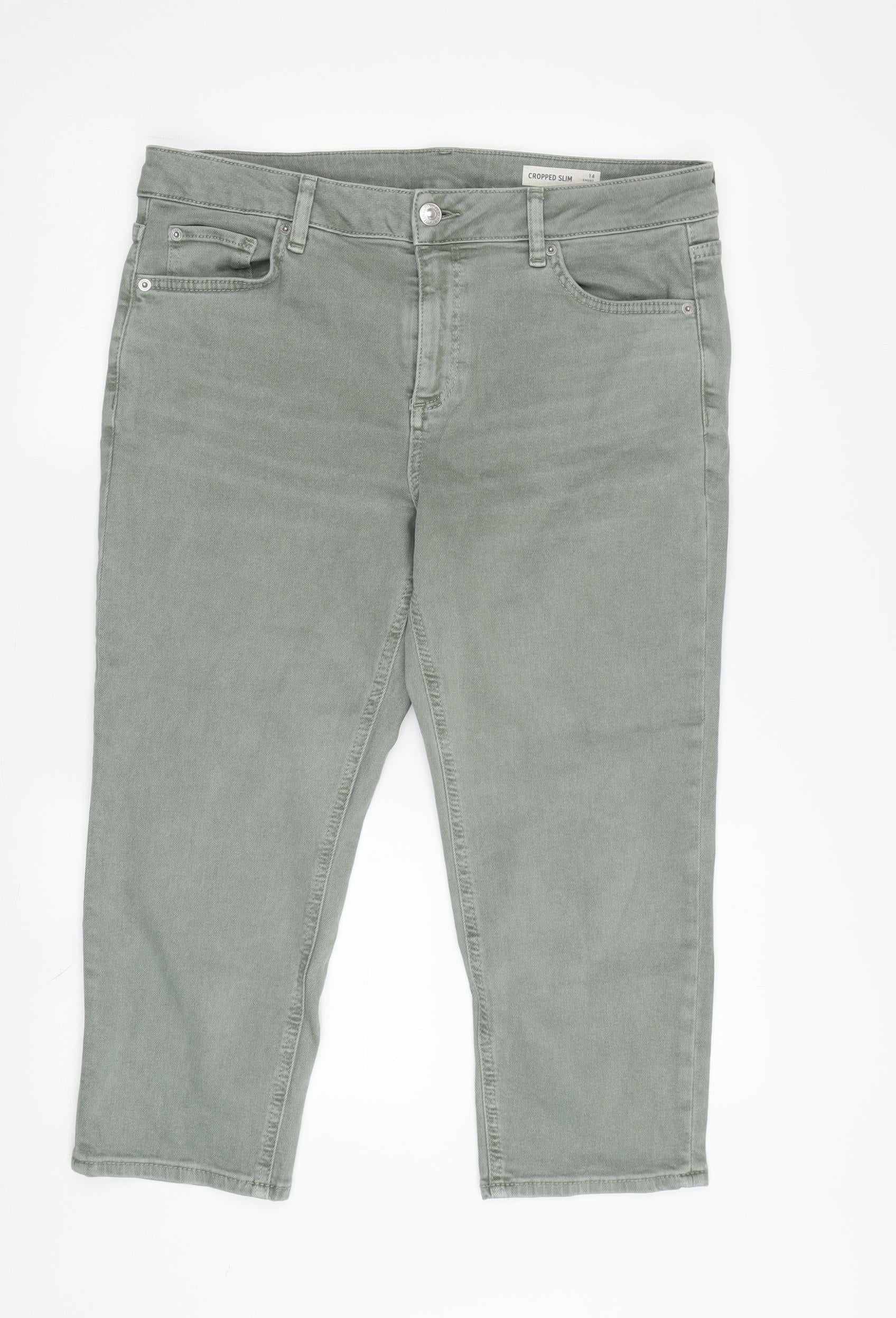 Step into stylish comfort with these chic green cropped jeans. Crafted to perfection for women, these jeans from a renowned brand bring together the elegance of classic denim with the modernity of a cropped slim fit. In a soothing green shade, these jeans offer a fresh take on everyday wear, making them a versatile addition to your wardrobe. The slim fit accentuates your form gracefully, while the petite size type ensures a perfect fit for the modern woman. Featuring a 5-pocket design, these jeans provide practical storage, complemented by a secure button closure. The finely woven cotton fabric promises all-day comfort, letting you move freely while maintaining a polished appearance. Ideal for casual outings or casual Fridays, these jeans are as functional as they are fashionable. A perfect fit for any season, pair them with your favorite top and sneakers for a relaxed look, or dress them up with a smart blouse and heels for a more polished ensemble. These jeans are in excellent condition, with no visible defects, promising style, comfort, and quality. Their contemporary design and flattering cut make them an irresistible choice for every fashion-conscious woman.