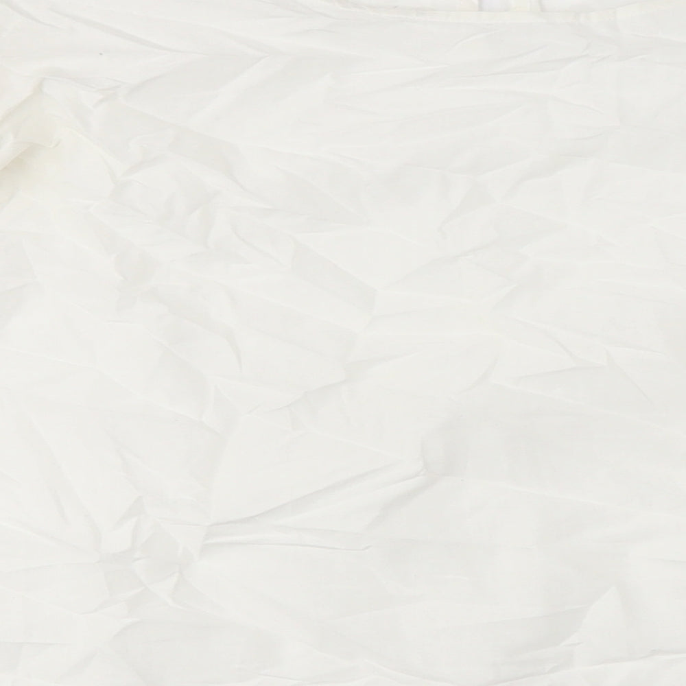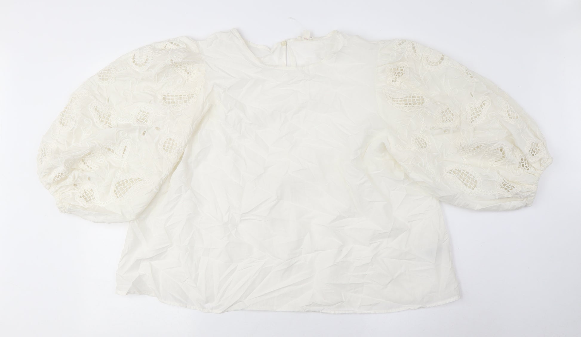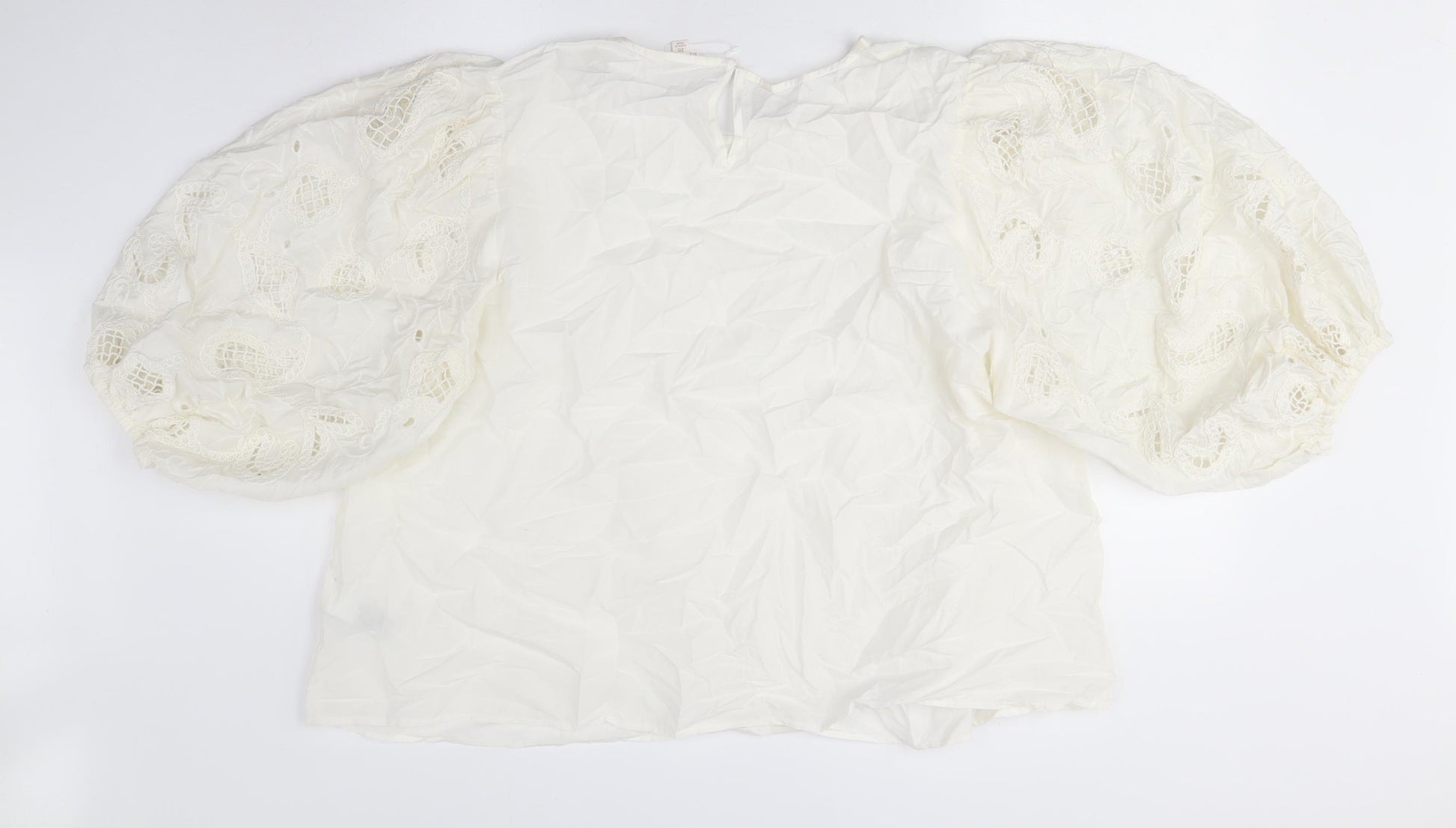 Elegant and stylish, this ivory blouse is perfect for adding a touch of sophistication to any outfit. Designed for Women, it features a charming round neckline and distinctive embroidered balloon sleeves, offering a unique blend of classic and modern styles. The blouse is made from 100% cotton, ensuring a comfortable and breathable fit, ideal for spring and summer seasons. The lightweight, knit fabric and regular fit make it perfect for casual outings, providing both comfort and fashion effortlessly. Despite some minor creasing, the blouse remains in excellent condition, ready to enhance your wardrobe. Pair it with your favourite jeans or a skirt for a versatile look that transitions seamlessly from a day at the office to a night out on the town.