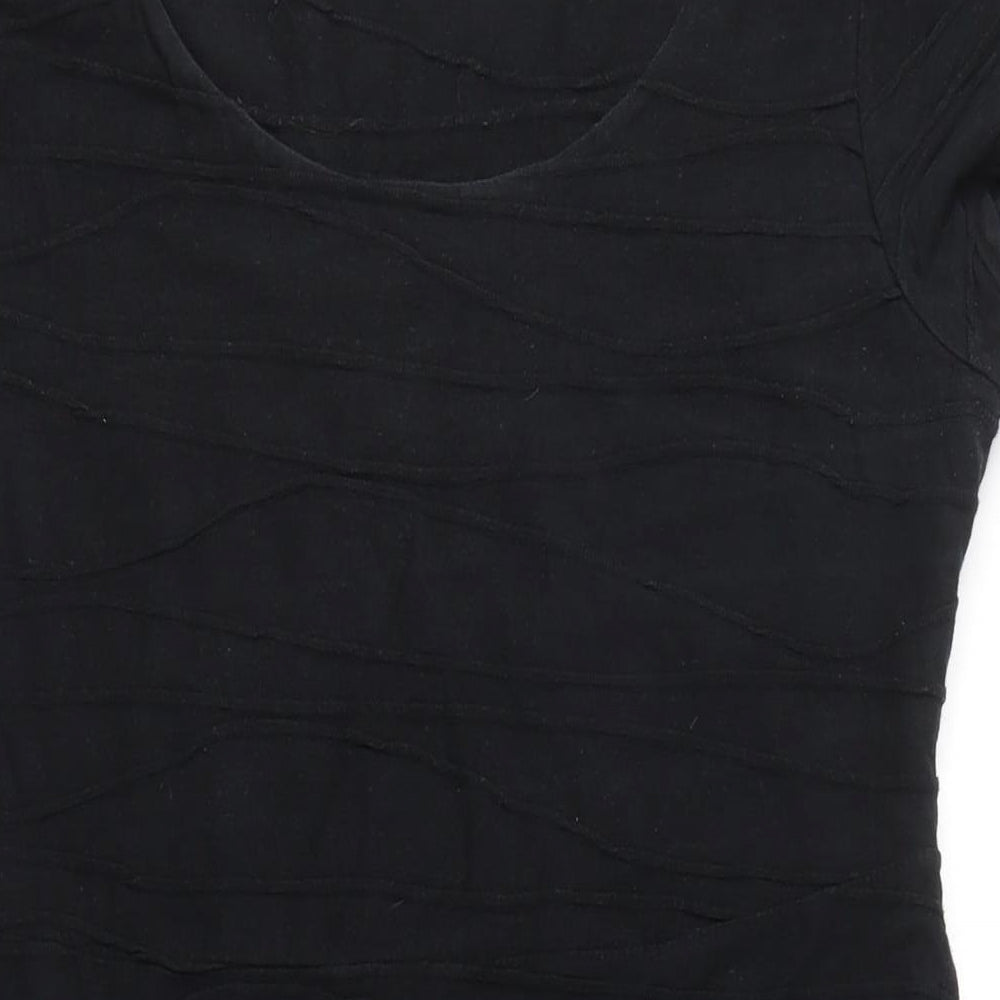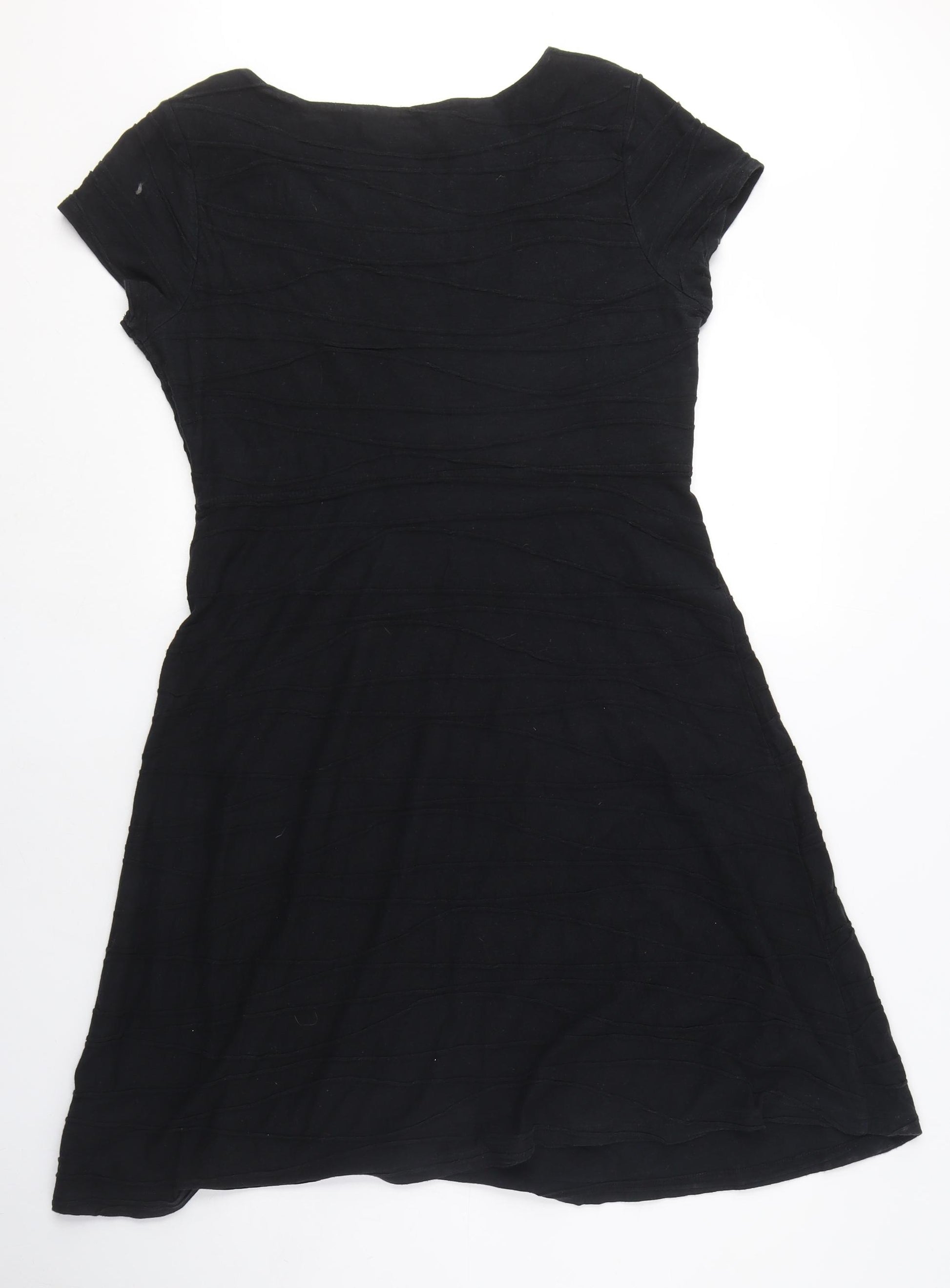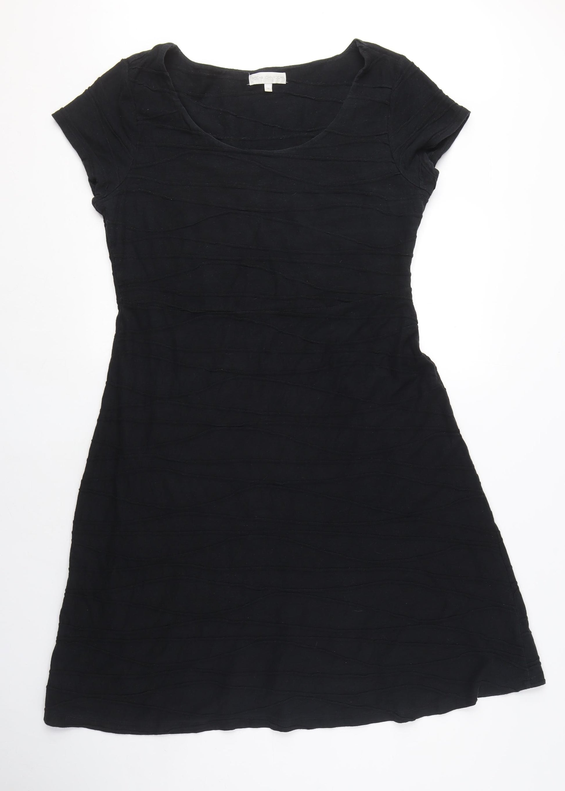 Embrace effortless style with this classic black A-line dress, perfect for spring and summer outings. The knee-length cut provides a flattering silhouette that complements any body type. Crafted from a soft and stretchable jersey fabric, combining the breathable comfort of cotton with a touch of elastane for flexibility, this dress ensures you move with ease throughout your day. The scoop neckline and short sleeves add to the casual charm, making it ideal for a relaxed yet chic look. With a pullover closure, you can easily slip into this versatile piece for a day out in town or a casual gathering. Lightweight and machine washable, this dress offers convenience without compromising on style. Pair it with your favourite accessories to elevate your everyday ensemble. Despite minor wear, the dress remains in excellent condition, ready to be a staple in your wardrobe. Grab this wardrobe essential today at a great value.