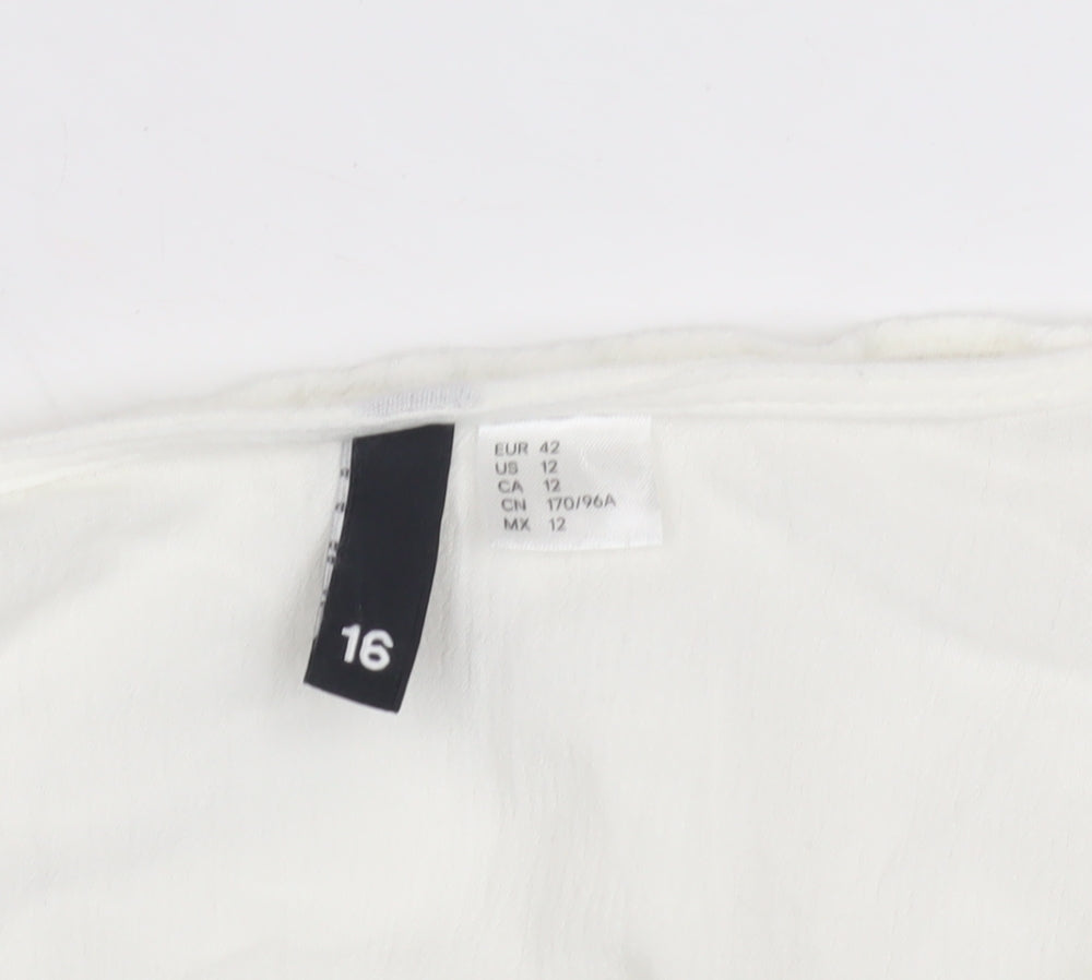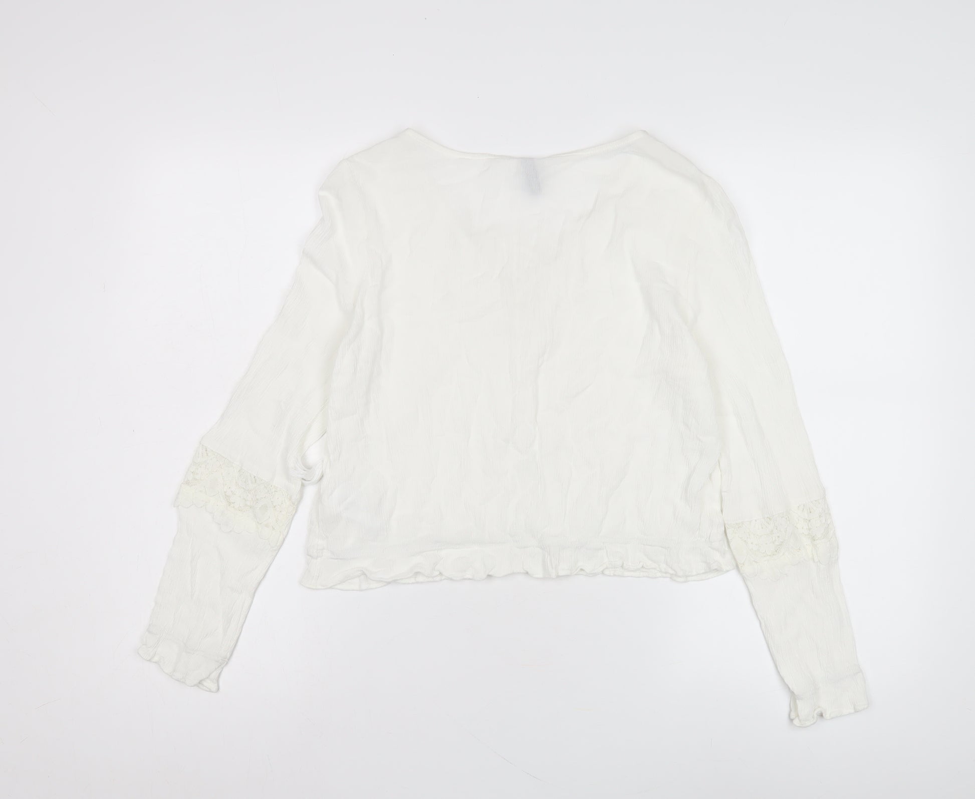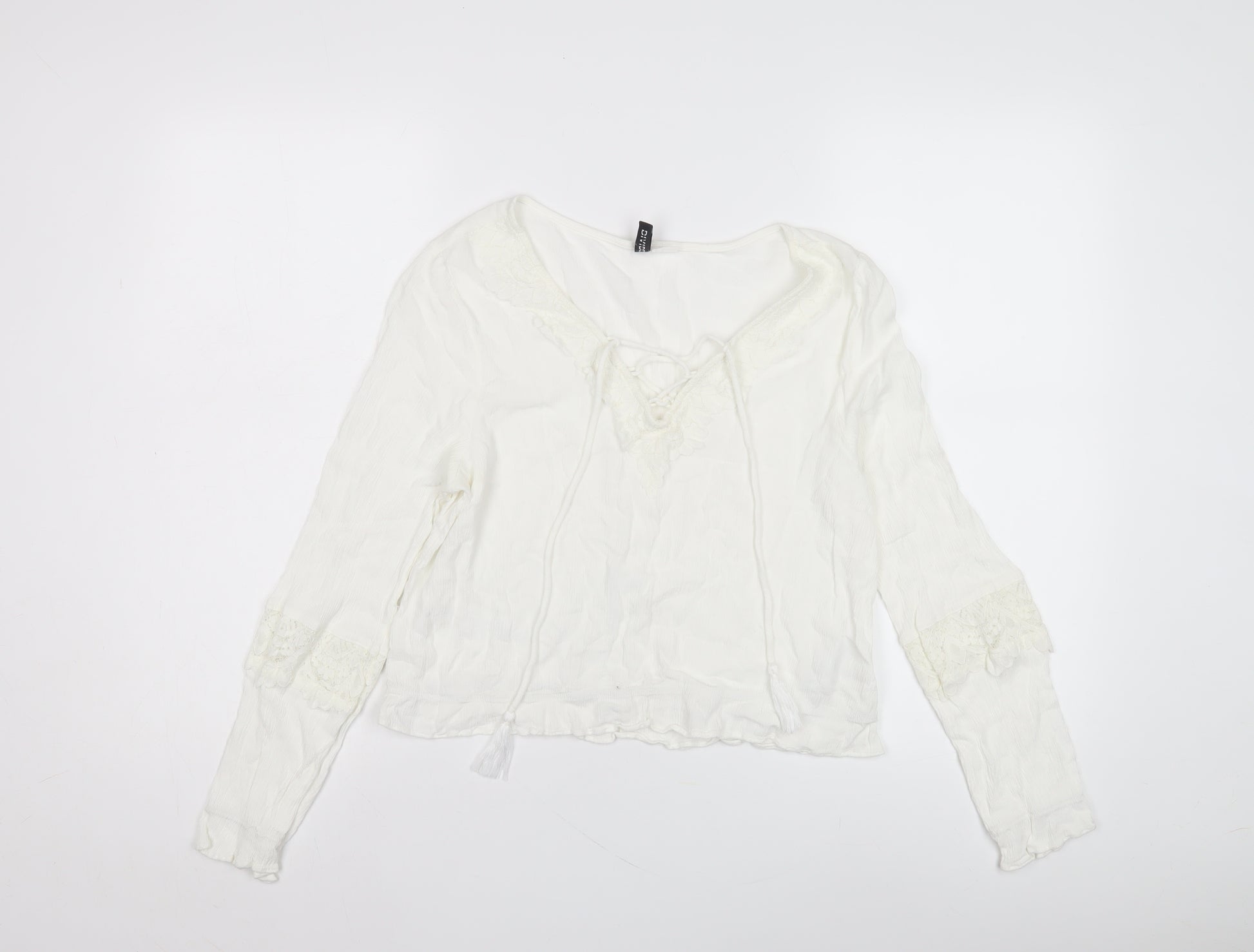 Discover elegance and comfort with this women's white lace peasant blouse, perfect for casual occasions. Crafted with attention to detail, this long-sleeve top offers a scoop neckline adorned with delicate lace accents, adding a feminine touch to your ensemble. Its elegant tie closure enhances the scoop neck, ensuring a comfortable fit that flatters all body types. Made for the modern woman, this blouse fits a UK size 16, embodying a chic and timeless design. Whether you're enjoying a sunny spring day or strolling in the summer heat, the soft, breathable fabric keeps you cool and stylish. Pair it with your favourite jeans for a relaxed look or dress it up with a skirt for a night out. Ideal for women seeking a versatile wardrobe addition, this blouse provides a chic solution for daily wear. Don't miss the chance to enhance your collection with this elegant and sophisticated piece.