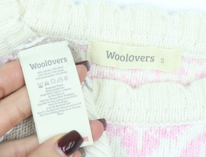 Experience cosy comfort with this beautifully crafted Woolovers women’s jumper. Designed in a soft blend of 69% cotton and 31% wool, this knitwear piece offers the perfect balance of warmth and breathability for all-season wear. The Fair Isle pattern in pastel tones of pink, blue, beige, cream, and green lends a classic yet elegant look that feels both timeless and versatile. Ideal for layering during colder months, this crew neck pullover pairs effortlessly with jeans, skirts, or tailored trousers for a relaxed yet refined appearance.With its regular fit and long sleeves, the jumper provides a comfortable silhouette suitable for everyday outings or casual gatherings. The ribbed hems and cuffs help to lock in warmth, while the tight-knit cotton and wool construction ensures durability without compromising on softness. The breathable natural fibres make it an excellent choice for autumn and winter, offering a lightweight feel with reliable insulation.Woolovers is known for its quality knitwear, and this piece perfectly exemplifies the brand’s craftsmanship and attention to detail. The absence of embellishments keeps the design clean and sophisticated, letting the traditional pattern stand out subtly. Whether you’re heading for a countryside walk, working from home, or enjoying a weekend brunch, this jumper blends practicality and style effortlessly.Conditioned in excellent pre-loved state with no visible signs of wear, this jumper retains its shape, texture, and vibrant colours. It has been carefully inspected to ensure quality and longevity. Hand wash only, as recommended on the label, to preserve the material's soft touch and rich pattern.A wardrobe essential with enduring appeal, this Woolovers multicoloured Fair Isle jumper will keep you stylishly cosy throughout the seasons — a classic knit that never goes out of fashion. Perfect for women seeking a reliable yet charming addition to their casual wear collection.