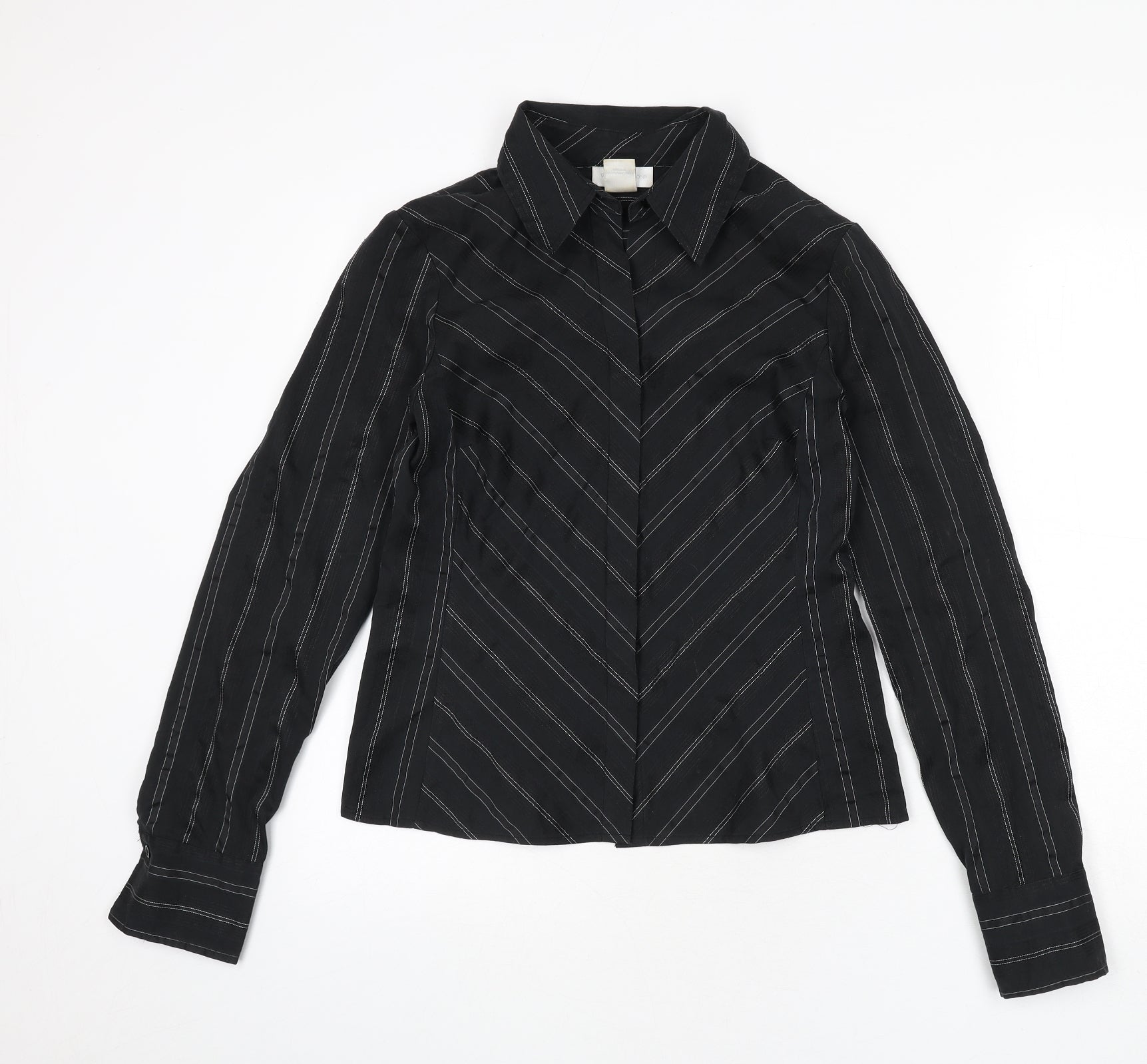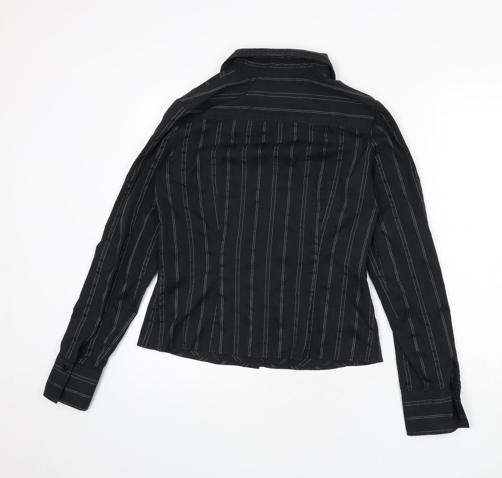 Womens Black Striped Polyester Basic Button-Up Size 8 Collared - Strech