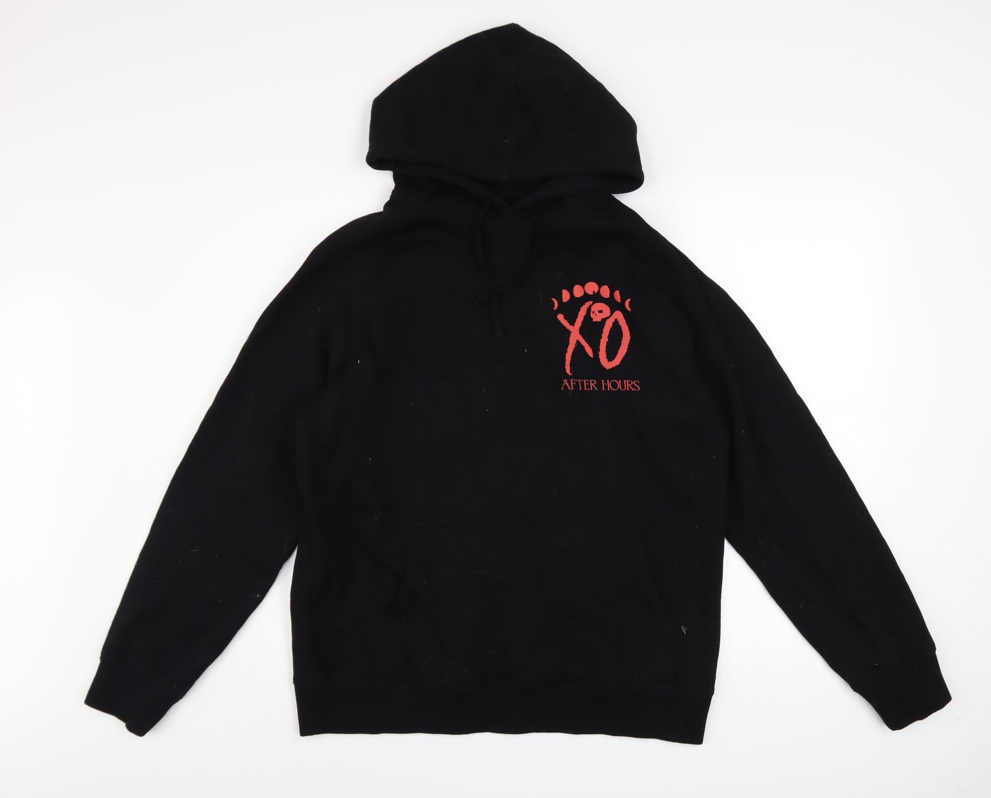 Step out in style with this distinctive XO After Hours black hoodie, designed for fans of modern streetwear and bold graphic appeal. Crafted from a soft and comfortable cotton-polyester blend, this pullover hoodie offers warmth, breathability, and durability — perfect for year-round wear. The fleece fabric interior ensures a cosy fit, while the adjustable drawstring hood and roomy kangaroo pocket add both practicality and comfort. The hoodie showcases striking red graphics on both front and back, featuring the signature 'XO After Hours' design that makes it instantly recognisable. Its regular fit offers a relaxed silhouette ideal for layering or standalone wear. The black base colour makes it versatile and easy to pair with jeans, joggers, or casual trousers for a laid-back look. Designed for men yet suited for anyone appreciating quality apparel, this hoodie effortlessly balances comfort and statement style. It’s perfect for casual outings, streetwear looks, gigs, or everyday wear where individuality matters. The garment is machine washable for easy care and made of an 80% cotton, 20% polyester fleece blend that guarantees softness and resilience over time. Slight signs of light lint are visible, but overall condition is very good, reflecting minimal previous wear. Whether you’re updating your wardrobe with an iconic piece or looking for a go-to hoodie that combines design with comfort, the XO After Hours hoodie is a standout choice. Ideal for autumn, winter, and early spring, this premium-quality hoodie captures a contemporary edge that works seamlessly from day to night. A true must-have for collectors and casual fans alike, it’s an excellent addition to any streetwear collection, delivering both warmth and striking visual impact.