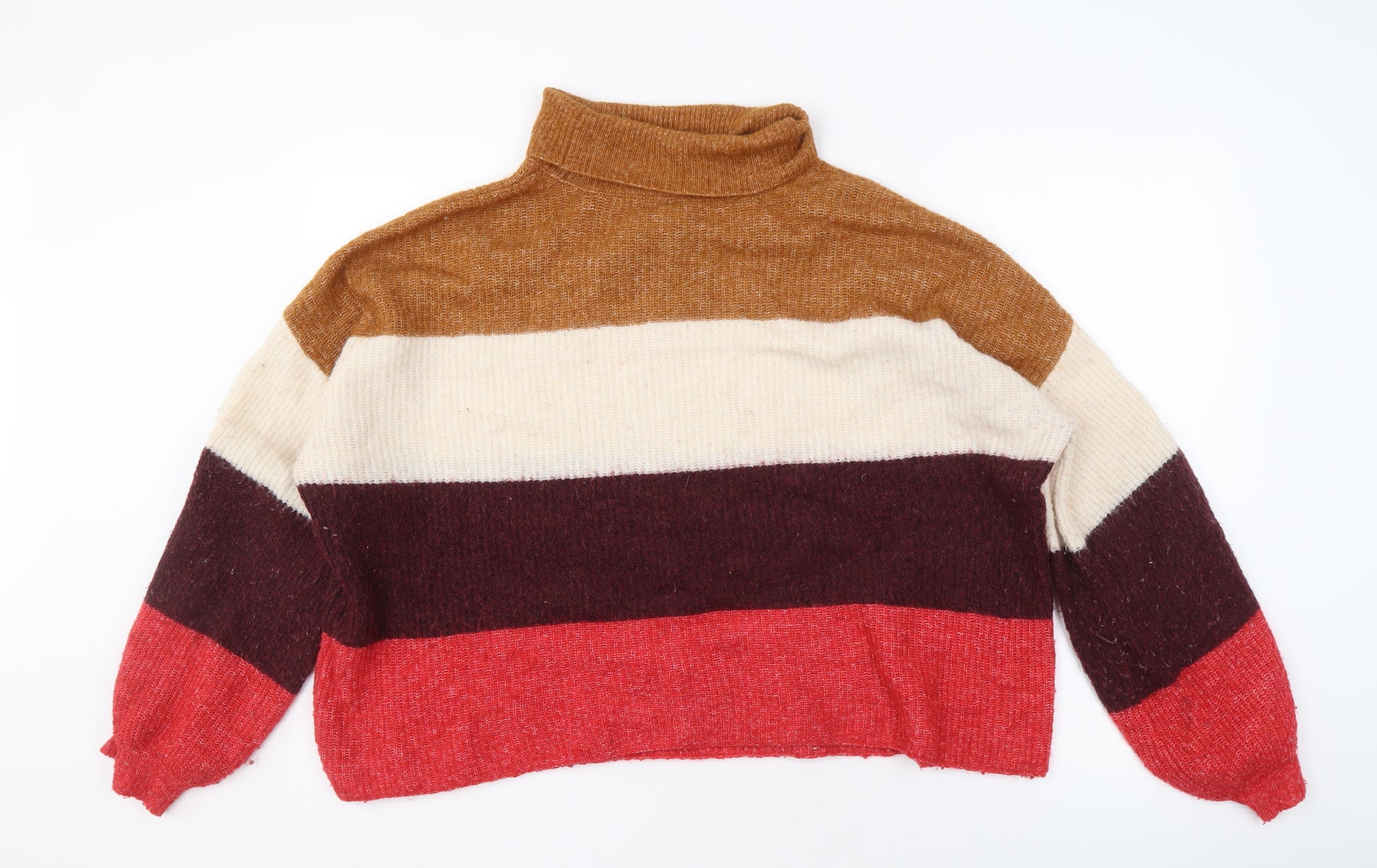 Embrace comfort and style with this women's multicoloured striped pullover jumper in size XS. Designed to suit all seasons, this jumper features a high neck and long sleeves, perfect for chilly autumn and winter days. Crafted with a blend of nylon, acrylic, polyester, and wool, it offers a soft touch and warmth without compromising on style. The vibrant stripes add a pop of colour, making it an ideal choice for casual occasions. Despite being slightly used, this jumper is in excellent condition with no visible signs of wear. Machine washable for easy care, it's the perfect addition to your wardrobe for those laid-back yet chic looks. Don't miss out on this versatile piece that effortlessly combines fashion and comfort.