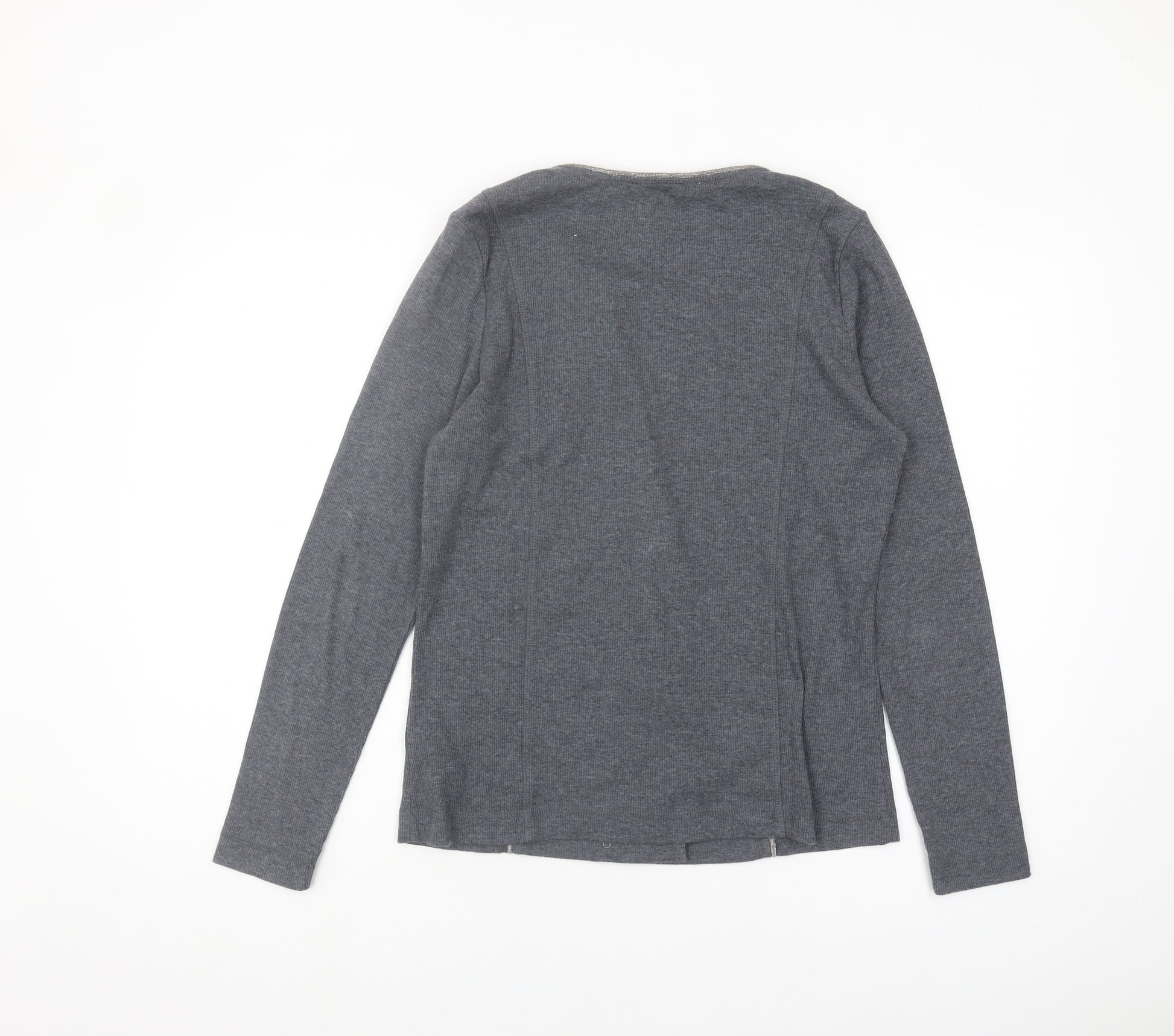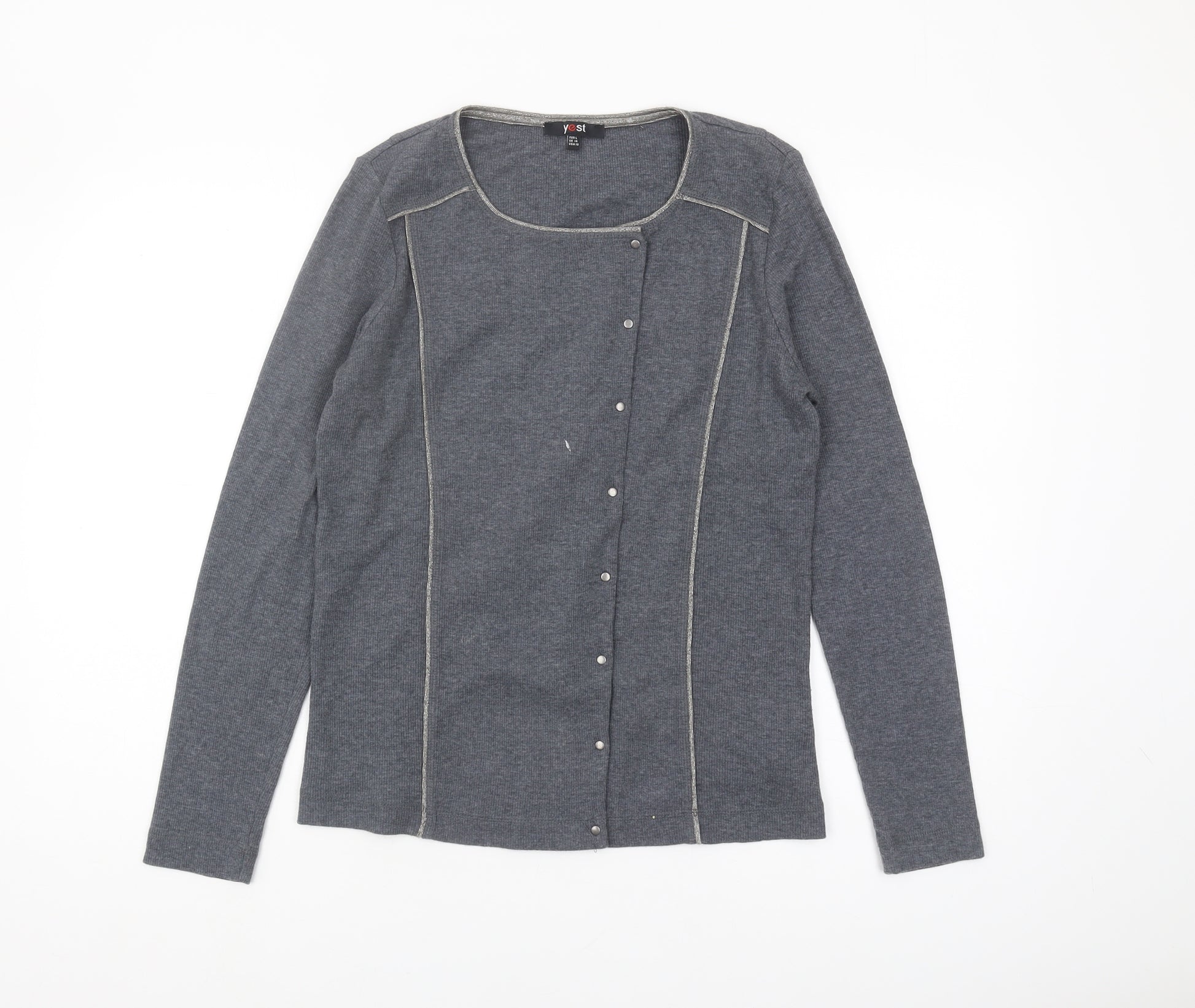 Upgrade your wardrobe with this elegant Yest women's button-up top in a versatile grey hue. Designed in size 12, it's the perfect addition for those looking for both comfort and style. This top boasts long sleeves and a round neck, making it suitable for layering or wearing on its own. Crafted from a blend of cotton, polyester, and elastane, it offers a soft yet durable fabric that ensures comfort throughout the day. The subtle detailing and exquisite craftsmanship make it a must-have for casual or semi-formal occasions. Pair it with your favourite jeans or a skirt to create a polished look effortlessly. Although previously owned, it remains in excellent condition, with only minor fraying noted upon close inspection, which does not detract from its overall appeal. Whether you're preparing for a day at the office or a casual outing with friends, this Yest top provides the perfect combination of elegance and ease. Grab this stylish yet comfortable piece today and experience the quality and sophistication that Yest consistently delivers. This irresistible piece is priced attractively, offering value without compromising on quality. Don't miss out on the opportunity to own this essential addition to your fashion collection.