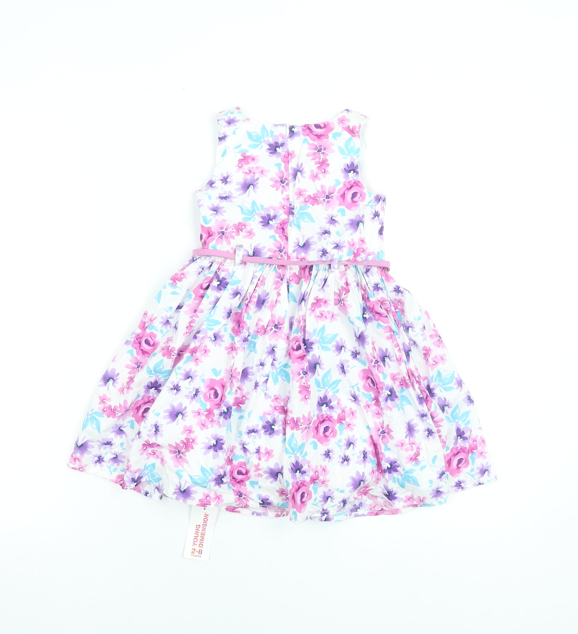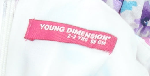 Brighten up your little one’s wardrobe with this beautifully cheerful floral dress by Young Dimension. Designed for girls aged 2-3 years, this delightful Fit & Flare dress showcases a pretty multicoloured floral print in vibrant shades of pink, purple, and blue set against a crisp white background. Perfect for sunny days or special occasions, its sleeveless shape and knee-length hem add both comfort and style for your little fashionista. Crafted from 100% cotton for a soft, breathable feel, the fabric ensures comfort even on warmer days while maintaining a structured, full skirt silhouette. The lightweight woven material allows ease of movement, making it ideal for both playdates and summer parties. It features an adorable pink belt at the waist, which adds a polished finishing touch while creating a flattering shape. The dress has a smooth zip closure at the back for easy dressing and is fully lined to provide additional comfort and coverage.This dress embodies everyday charm with its bright and blooming floral pattern — a lovely timeless print that’s both playful and feminine. The round neckline and sleeveless design make it a great choice for pairing with a cardigan on cooler days or wearing as-is in the sunshine. Machine washable for easy care, it’s also durable enough for repeated wear.Perfect for spring and summer, this Young Dimension dress works beautifully for casual outings, family gatherings, or birthday celebrations. Its excellent pre-owned condition means your little one can enjoy a designer-quality piece at a fraction of the retail cost. A versatile and pretty essential for any young girl’s wardrobe, this floral Fit & Flare piece blends comfort, practicality, and pretty detailing effortlessly — ensuring your child always looks and feels her best in every season.