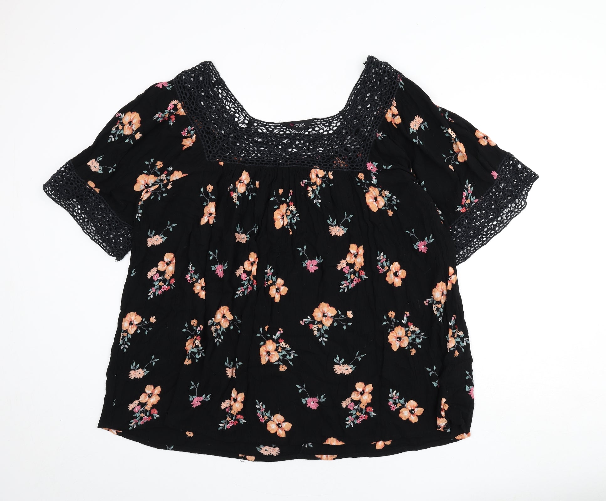 Womens Black Floral Viscose Basic Blouse Size 22 Square Neck - Lace Trim