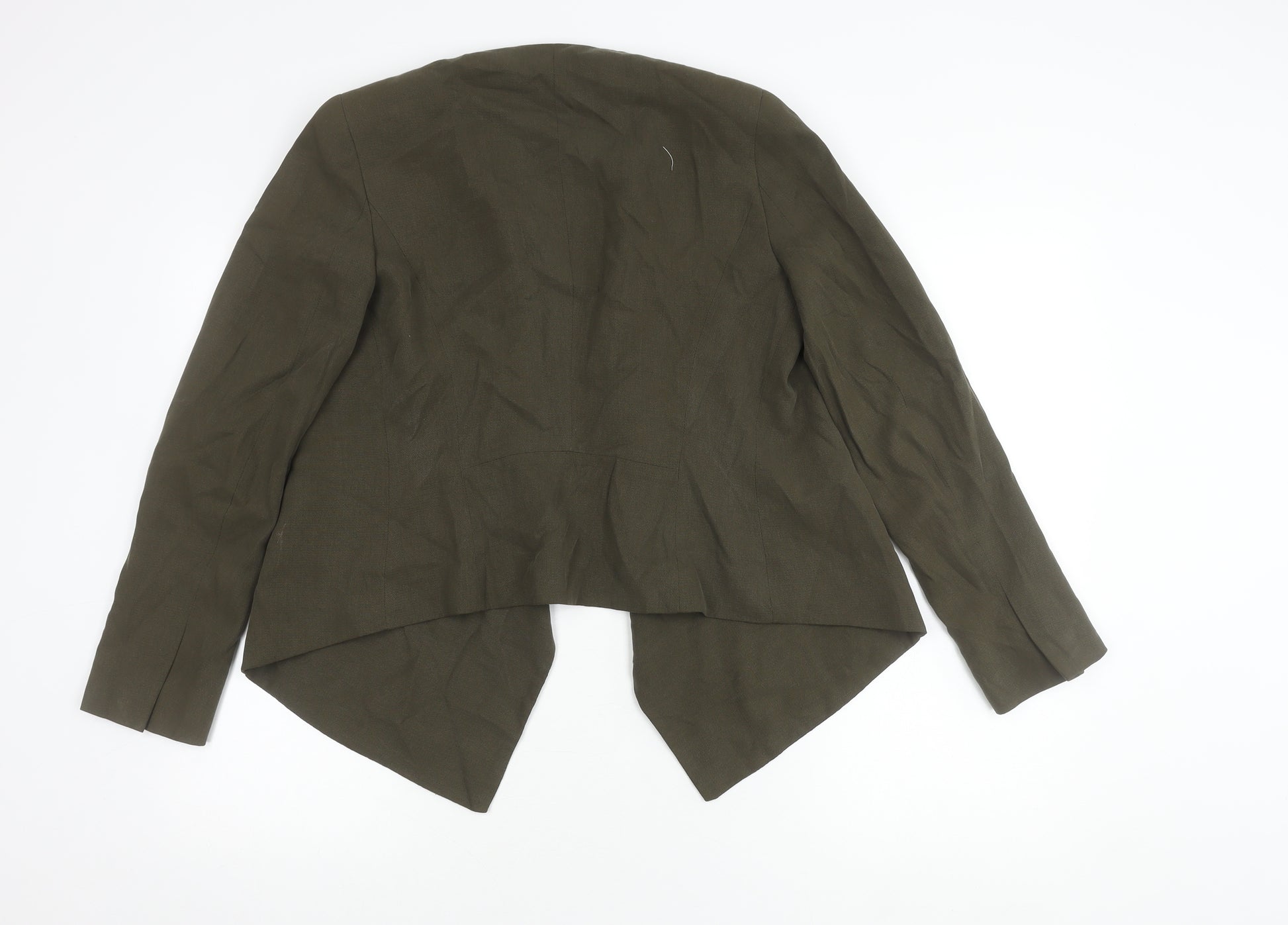 Discover effortless style with this Zara Basic women's blazer. Crafted from a luxe blend of linen, it offers the perfect combination of comfort and sophistication. The versatile green hue makes it an ideal choice for both casual outings and professional settings. Its collarless design adds a contemporary edge, perfect for those who appreciate modern fashion. Available in a regular size M, this blazer ensures a comfortable fit with long sleeves for added warmth during spring and autumn. Its regular fit and no pattern design offer endless styling possibilities, whether paired with tailored trousers for an office look or jeans for a relaxed weekend ensemble. The blazer is in excellent condition, displaying minor creases but no noticeable wear, promising a polished finish to your outfits. Ideal for the modern woman on-the-go, this blazer from Zara Basic is a must-have addition to your wardrobe.