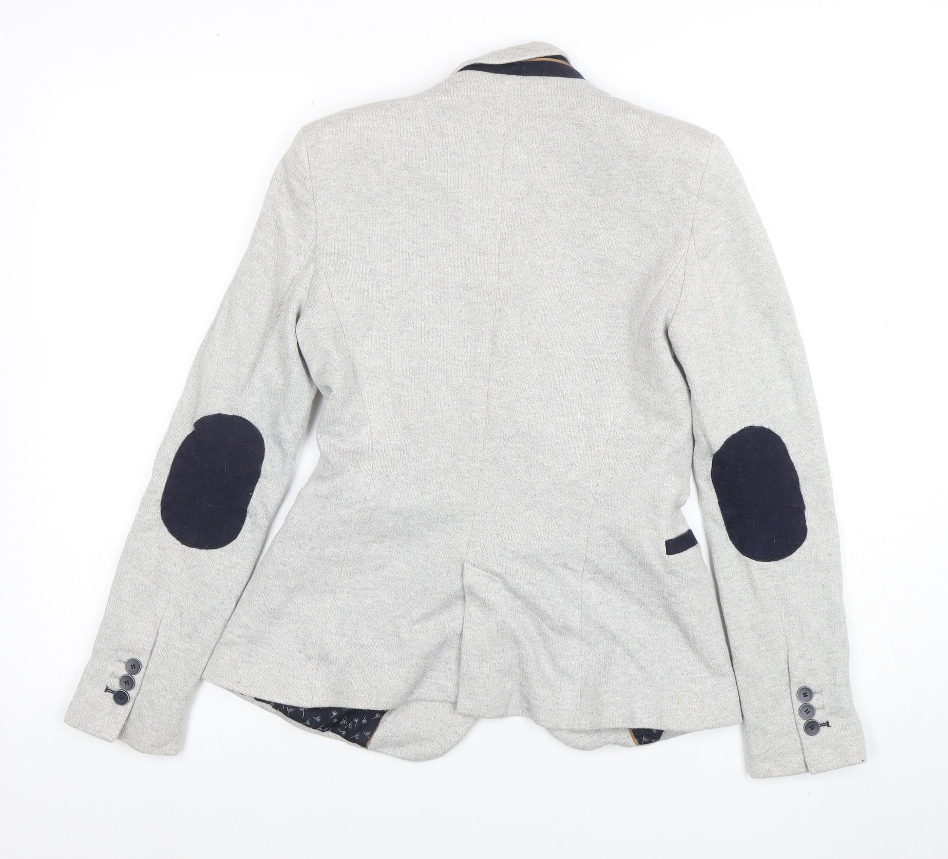 Elevate your wardrobe with this chic Zara Basic women’s blazer in a soft grey tone. Expertly tailored from a comfortable cotton and polyester blend, this refined jacket offers a flattering slim fit ideal for business, smart-casual, or workwear occasions. The one-button, single-breasted front and classic notch lapel design give it modern sophistication, while the navy elbow patches and pocket trims add a stylish contrast. The interior is fully lined in a printed polyester fabric, providing both comfort and durability for everyday or office wear. Designed to fall at a regular length, this blazer pairs perfectly with trousers or skirts for an effortlessly polished look. Subtle design details such as the three-button sleeve cuffs and tailored seams enhance the silhouette, making it a versatile piece that transitions seamlessly from day meetings to evening outings. Crafted with care, this timeless grey jacket ensures a professional yet relaxed appeal suitable for multiple seasons, including autumn, spring, and winter. With its balance of structure and softness, this Zara Basic blazer exemplifies understated sophistication with a contemporary edge. Whether worn open over a cami or buttoned up for a more formal impression, it delivers comfort, quality, and impeccable style. A must-have addition to any wardrobe seeking a refined yet approachable aesthetic.