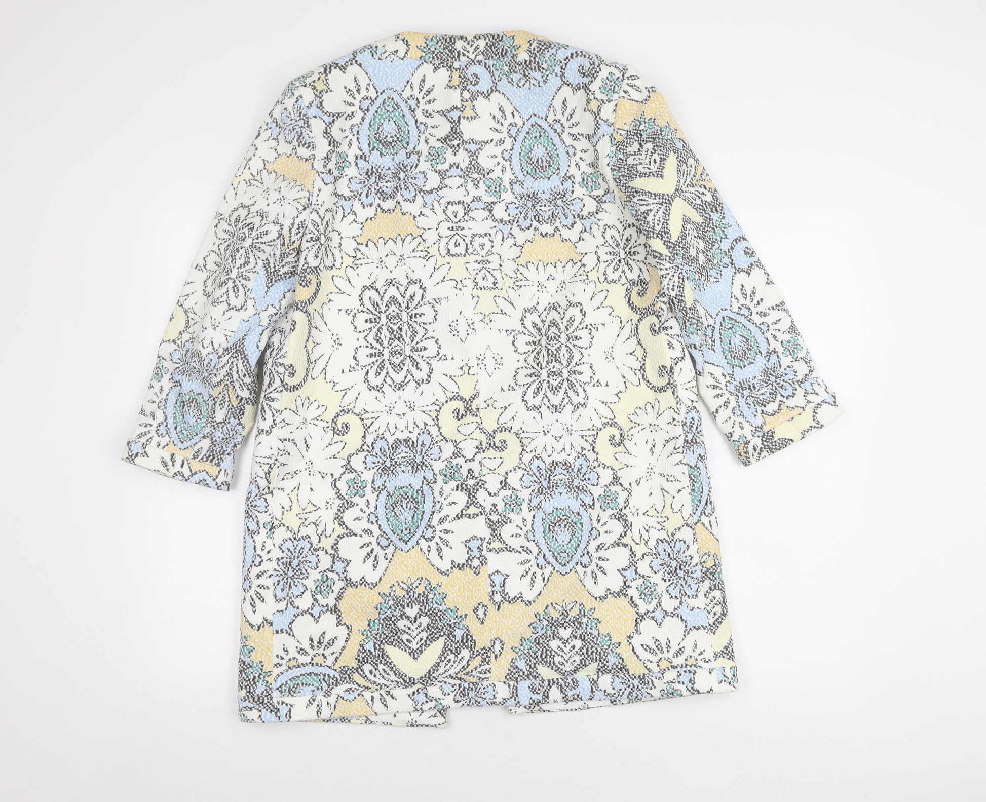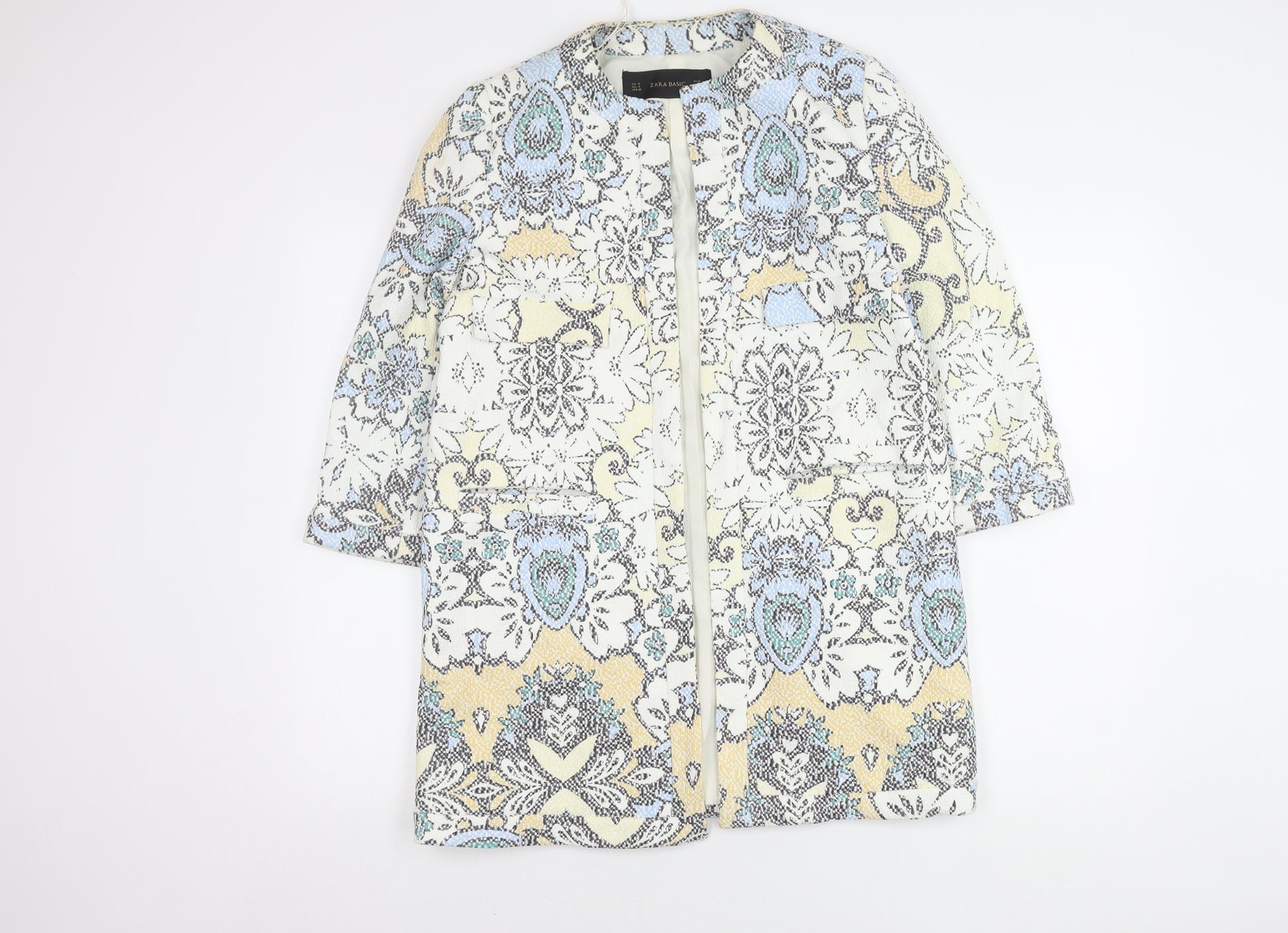 Elevate your wardrobe with this exquisite Zara Basic Women's Coat, perfect for those who love a splash of colour and an intricate design. Made entirely from polyester, this coat ensures durability while maintaining a lightweight feel. The soft material is comfortable against the skin, providing a perfect blend of style and ease. Its captivating multicoloured pattern featuring hues of yellow, blue, and black forms a beautiful ensemble fit for any fashion-forward individual. With a convenient medium size, it's tailored to offer the right amount of breathability without compromising on a chic, fitted look. This coat is ideal for a variety of occasions, from casual outings to more formal gatherings, thanks to its versatile and eye-catching design. The 3/4 sleeve length adds a modern twist, allowing for a stylish layered look with your favourite top. Gently used and in excellent condition, it presents no visible defects, ensuring you're stepping out dressed to impress. A charming addition to any collection, this coat not only provides functional warmth but also makes a bold statement. Whether you're heading to a weekend brunch or a special night out, this Zara Basic coat is your wardrobe's next staple piece. Discover effortless elegance and stand out with unparalleled refinement.