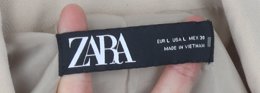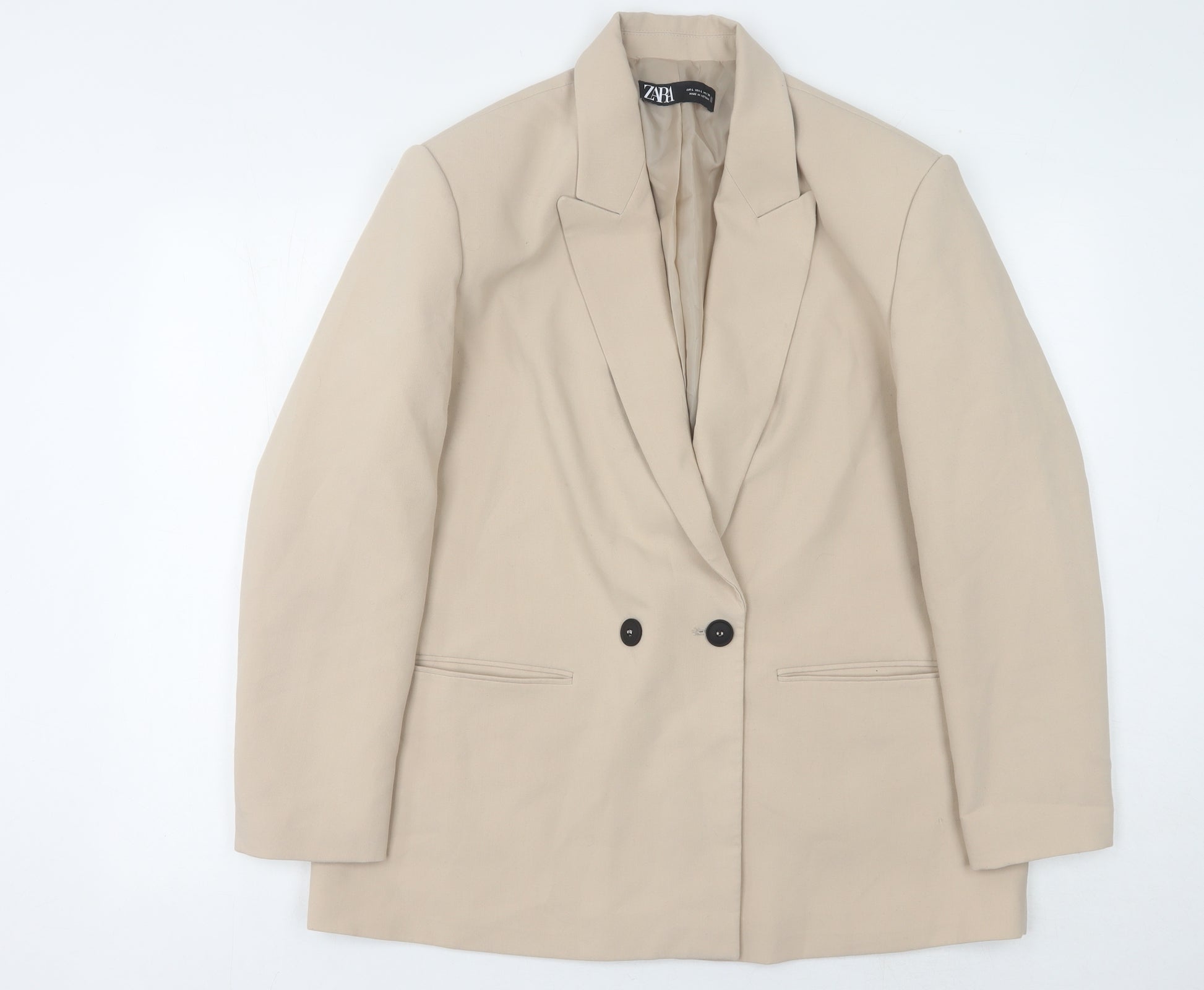 Explore sophistication with this elegant Zara blazer, a perfect addition to any wardrobe. Crafted in a versatile beige hue, this double-breasted blazer offers a touch of class suitable for various occasions, from business meetings to formal events. Designed for women, it features a regular fit, long sleeves, and a stylish notch lapel. The woven fabric is composed of 73% polyester, 20% viscose, and 7% elastane, ensuring comfort and flexibility. This regular size 12 jacket is both machine washable and practical, making it a convenient choice for modern lifestyles. The timeless design is enhanced by the absence of any prominent pattern, allowing it to effortlessly pair with different outfits. Ideal for both spring and autumn seasons, the lined interior adds an extra layer of warmth and luxury. The classic tailoring ensures it remains a staple in your wardrobe for years to come.