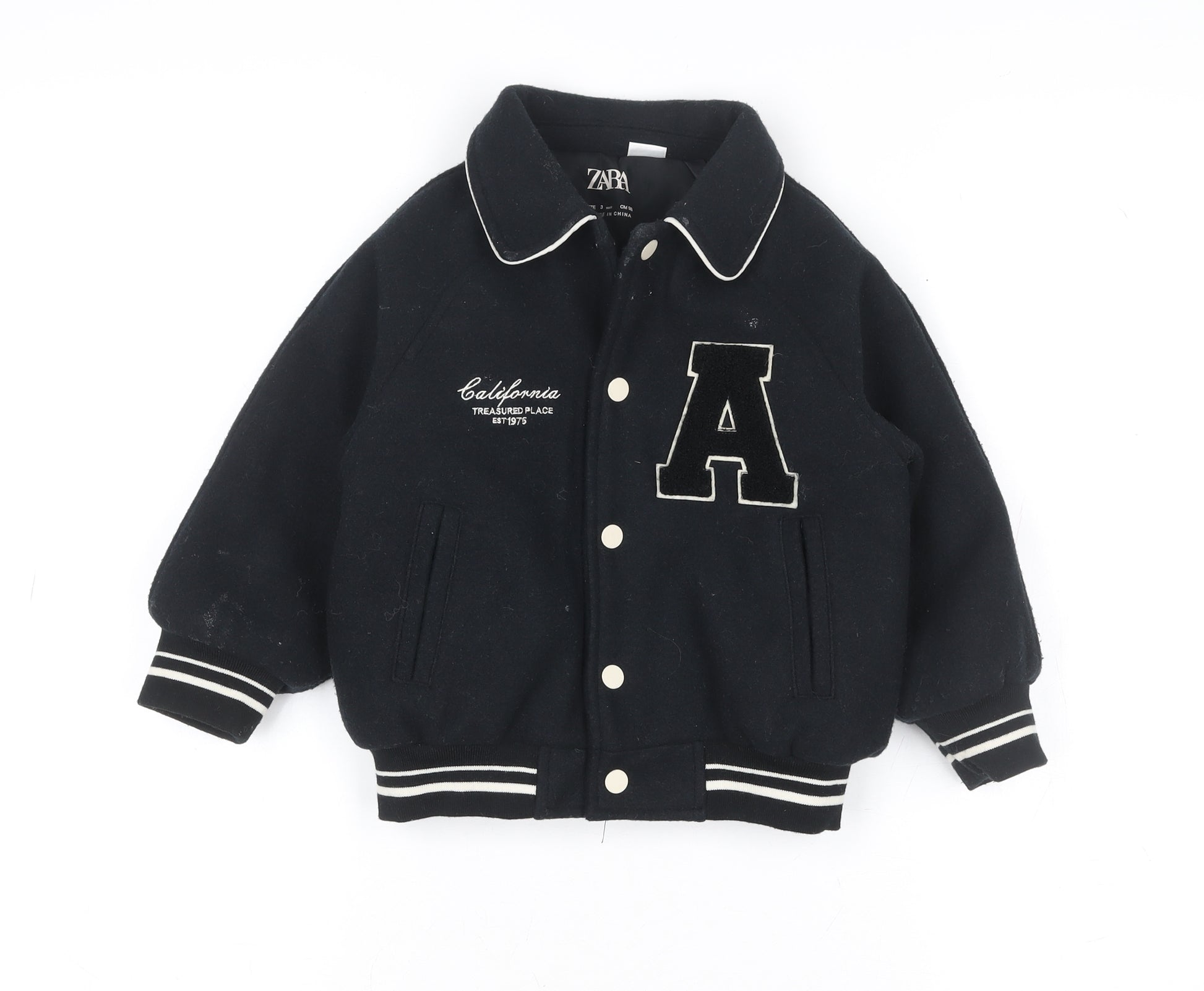 Give your little boy’s wardrobe a stylish update with this ZARA Boys Black Varsity Jacket, a timeless piece that merges comfort, warmth, and cool collegiate design. Perfect for everyday wear during the autumn and winter months, this wool blend jacket features a soft yet sturdy outer shell made from 88% polyester and 12% wool, ensuring lasting warmth while maintaining an effortlessly trendy silhouette. The design captures the spirit of classic varsity style with its bold letter ‘A’ patch on the front, sporty striped cuffs, hem, and collar detail, and contrast piping for an added vintage edge. The collared neckline and snap-button front closure make it practical for quick dressing, while the twin side pockets offer a functional touch for keeping little hands warm or carrying small essentials. Ideal for school days, playdates, or casual outings, this versatile jacket combines comfort with a fashionable flair. The Regular fit and short jacket length make it easy to layer over jumpers or t-shirts. Though pre-owned, it remains in very good condition with only minor lint typical of wool-blend materials, showing no stains or damage. It’s a machine washable piece, perfect for busy parents who value durability and low maintenance. The embroidered “California Treasured Place Est. 1975” adds a charming detail that enhances its sporty, college-inspired aesthetic. Whether paired with jeans, joggers, or chinos, this ZARA varsity coat is an easy choice for any young trendsetter looking to stay warm and look great. Get ready to make this comfy, stylish jacket your boy’s go-to outerwear this season—timeless, cosy, and full of character.